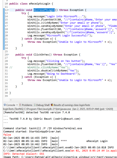 java.lang.Exception: Unable to Login to Microsoftorg.openqa.selenium.WebDriverException: An unknown error occurred in the remote end while processing the command. (WARNING: The server did not provide any stacktrace information) Command duration or timeout: 0 milliseconds Build info: version: '3.141.59', revision: 'e82be7d358', time: '2018-11-14T08:17:03' System info: host: 'IMMVMKRMQA10', ip: '192.168.10.84', os.name: 'Windows 10', os.arch: 'amd64', os.version: '10.0', java.version: '21.0.2' Driver info: io.appium.java_client.windows.WindowsDriver Capabilities {app: C:\\imm\\eReceiptsClient\\e..., appWorkingDir: C:\imm\eReceiptsClient, javascriptEnabled: true, platform: WINDOWS, platformName: Windows} Session ID: 3E7C0E38-E12F-4EC9-AF9E-39999AB76C6D at com.kinective.windows.pages.eReceiptsLogin.microsoftLogin(eReceiptsLogin.java:22) at com.kinective.windows.testscripts.loginTests.loginTests.login(loginTests.java:54) at java.base/jdk.internal.reflect.DirectMethodHandleAccessor.invoke(DirectMethodHandleAccessor.java:103) at java.base/java.lang.reflect.Method.invoke(Method.java:580) at org.testng.internal.MethodInvocationHelper.invokeMethod(MethodInvocationHelper.java:133) at org.testng.internal.TestInvoker.invokeMethod(TestInvoker.java:598) at org.testng.internal.TestInvoker.invokeTestMethod(TestInvoker.java:173) at org.testng.internal.MethodRunner.runInSequence(MethodRunner.java:46) at org.testng.internal.TestInvoker$MethodInvocationAgent.invoke(TestInvoker.java:824) at org.testng.internal.TestInvoker.invokeTestMethods(TestInvoker.java:146) at org.testng.internal.TestMethodWorker.invokeTestMethods(TestMethodWorker.java:146) at org.testng.internal.TestMethodWorker.run(TestMethodWorker.java:128) at java.base/java.util.ArrayList.forEach(ArrayList.java:1596) at org.testng.TestRunner.privateRun(TestRunner.java:794) at org.testng.TestRunner.run(TestRunner.java:596) at org.testng.SuiteRunner.runTest(SuiteRunner.java:377) at org.testng.SuiteRunner.runSequentially(SuiteRunner.java:371) at org.testng.SuiteRunner.privateRun(SuiteRunner.java:332) at org.testng.SuiteRunner.run(SuiteRunner.java:276) at org.testng.SuiteRunnerWorker.runSuite(SuiteRunnerWorker.java:53) at org.testng.SuiteRunnerWorker.run(SuiteRunnerWorker.java:96) at org.testng.TestNG.runSuitesSequentially(TestNG.java:1212) at org.testng.TestNG.runSuitesLocally(TestNG.java:1134) at org.testng.TestNG.runSuites(TestNG.java:1063) at org.testng.TestNG.run(TestNG.java:1031) at org.testng.remote.AbstractRemoteTestNG.run(AbstractRemoteTestNG.java:115) at org.testng.remote.RemoteTestNG.initAndRun(RemoteTestNG.java:293) at org.testng.remote.RemoteTestNG.main(RemoteTestNG.java:91)