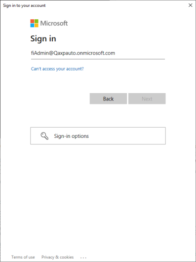 [ScreenShot] fiAdmin@Qaxpauto.onmicrosoft.com has been set successfully in the field Enter your email or phone