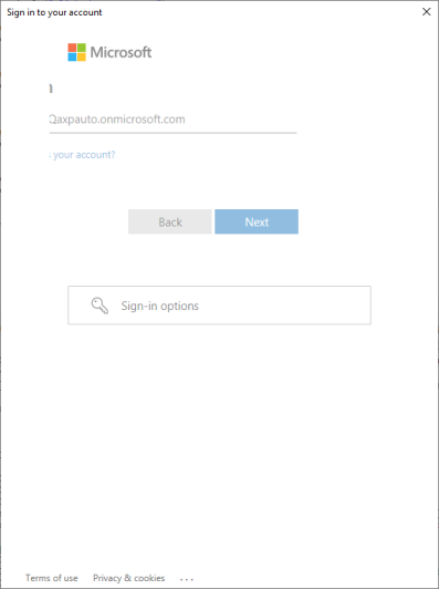 fiAdmin@Qaxpauto.onmicrosoft.com has been set successfully in the field Enter your email or phone [ScreenShot] |