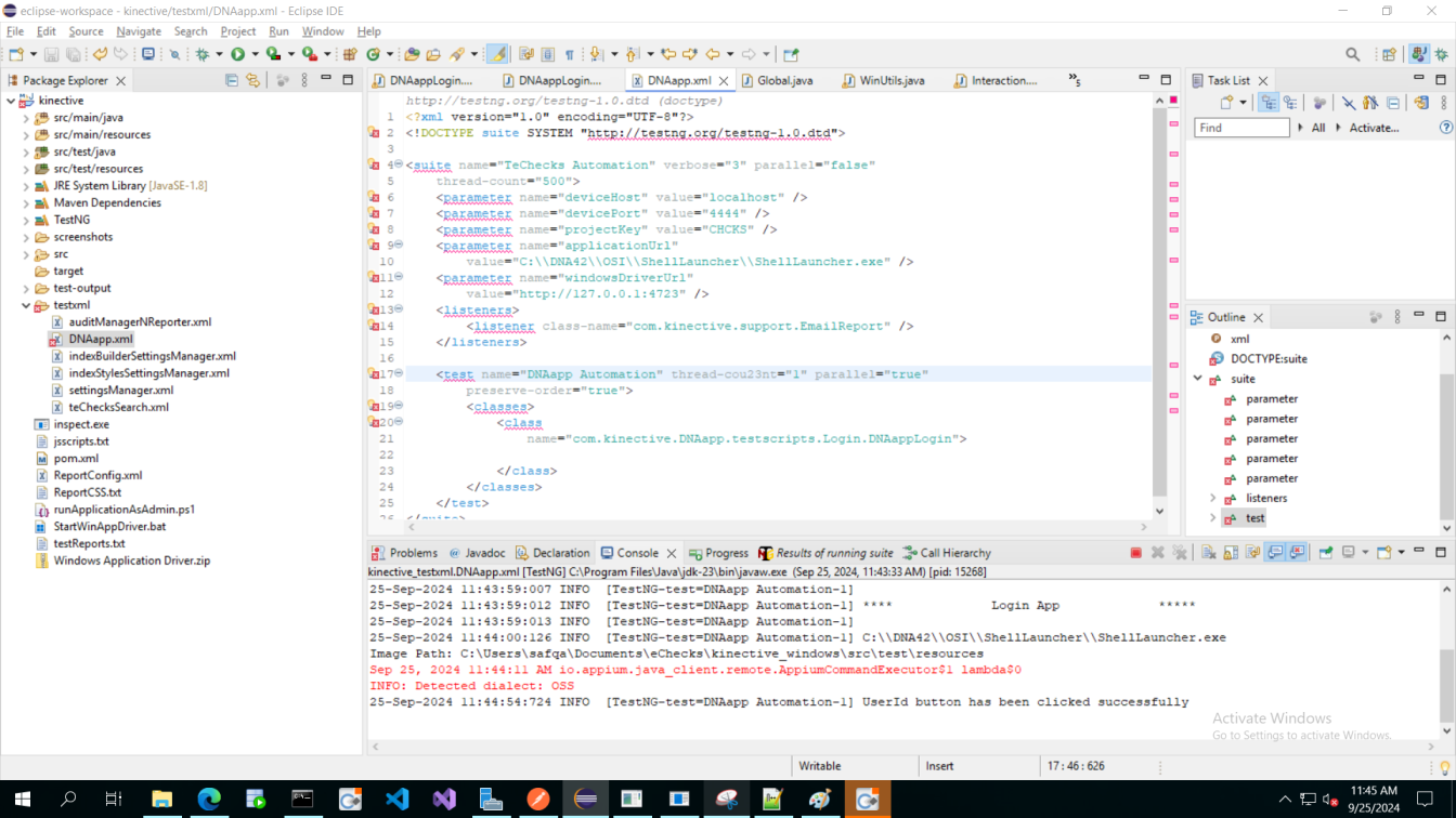 java.lang.Exception: Failed to Login to the application at com.kinective.DNAapp.windows.DNAappLogin.login(DNAappLogin.java:57) at com.kinective.DNAapp.testscripts.Login.DNAappLogin.Login(DNAappLogin.java:49) at java.base/jdk.internal.reflect.DirectMethodHandleAccessor.invoke(DirectMethodHandleAccessor.java:103) at java.base/java.lang.reflect.Method.invoke(Method.java:580) at org.testng.internal.MethodInvocationHelper.invokeMethod(MethodInvocationHelper.java:133) at org.testng.internal.TestInvoker.invokeMethod(TestInvoker.java:598) at org.testng.internal.TestInvoker.invokeTestMethod(TestInvoker.java:173) at org.testng.internal.MethodRunner.runInSequence(MethodRunner.java:46) at org.testng.internal.TestInvoker$MethodInvocationAgent.invoke(TestInvoker.java:824) at org.testng.internal.TestInvoker.invokeTestMethods(TestInvoker.java:146) at org.testng.internal.TestMethodWorker.invokeTestMethods(TestMethodWorker.java:146) at org.testng.internal.TestMethodWorker.run(TestMethodWorker.java:128) at java.base/java.util.concurrent.ThreadPoolExecutor.runWorker(ThreadPoolExecutor.java:1144) at java.base/java.util.concurrent.ThreadPoolExecutor$Worker.run(ThreadPoolExecutor.java:642) at java.base/java.lang.Thread.run(Thread.java:1575) Caused by: org.openqa.selenium.NoSuchElementException: An element could not be located on the page using the given search parameters. (WARNING: The server did not provide any stacktrace information) Command duration or timeout: 0 milliseconds For documentation on this error, please visit: https://www.seleniumhq.org/exceptions/no_such_element.html Build info: version: '3.141.59', revision: 'e82be7d358', time: '2018-11-14T08:17:03' System info: host: 'DNA19RSAFDV02', ip: '10.10.2.107', os.name: 'Windows Server 2019', os.arch: 'amd64', os.version: '10.0', java.version: '23' Driver info: io.appium.java_client.windows.WindowsDriver Capabilities {app: Root, javascriptEnabled: true, platform: WINDOWS, platformName: Windows} Session ID: B6CAC4E1-6139-4E02-B73B-FA11EBB1D038 *** Element info: {Using=name, value=Cash Transfer} at java.base/jdk.internal.reflect.DirectConstructorHandleAccessor.newInstance(DirectConstructorHandleAccessor.java:62) at java.base/java.lang.reflect.Constructor.newInstanceWithCaller(Constructor.java:501) at java.base/java.lang.reflect.Constructor.newInstance(Constructor.java:485) at org.openqa.selenium.remote.ErrorHandler.createThrowable(ErrorHandler.java:214) at org.openqa.selenium.remote.ErrorHandler.throwIfResponseFailed(ErrorHandler.java:166) at org.openqa.selenium.remote.http.JsonHttpResponseCodec.reconstructValue(JsonHttpResponseCodec.java:40) at org.openqa.selenium.remote.http.AbstractHttpResponseCodec.decode(AbstractHttpResponseCodec.java:80) at org.openqa.selenium.remote.http.AbstractHttpResponseCodec.decode(AbstractHttpResponseCodec.java:44) at org.openqa.selenium.remote.HttpCommandExecutor.execute(HttpCommandExecutor.java:158) at io.appium.java_client.remote.AppiumCommandExecutor.execute(AppiumCommandExecutor.java:239) at org.openqa.selenium.remote.RemoteWebDriver.execute(RemoteWebDriver.java:552) at io.appium.java_client.DefaultGenericMobileDriver.execute(DefaultGenericMobileDriver.java:41) at io.appium.java_client.AppiumDriver.execute(AppiumDriver.java:1) at io.appium.java_client.windows.WindowsDriver.execute(WindowsDriver.java:1) at org.openqa.selenium.remote.RemoteWebDriver.findElement(RemoteWebDriver.java:323) at io.appium.java_client.DefaultGenericMobileDriver.findElement(DefaultGenericMobileDriver.java:61) at io.appium.java_client.AppiumDriver.findElement(AppiumDriver.java:1) at io.appium.java_client.windows.WindowsDriver.findElement(WindowsDriver.java:1) at org.openqa.selenium.remote.RemoteWebDriver.findElementByName(RemoteWebDriver.java:404) at io.appium.java_client.DefaultGenericMobileDriver.findElementByName(DefaultGenericMobileDriver.java:117) at io.appium.java_client.AppiumDriver.findElementByName(AppiumDriver.java:1) at io.appium.java_client.windows.WindowsDriver.findElementByName(WindowsDriver.java:1) at com.kinective.support.WinUtils.clickByName(WinUtils.java:288) at com.kinective.support.WinUtils.clickByName(WinUtils.java:279) at com.kinective.DNAapp.windows.DNAappLogin.login(DNAappLogin.java:44) ... 14 more