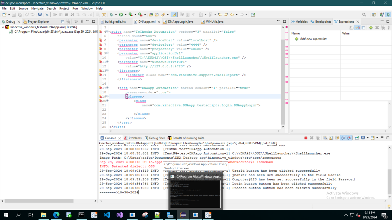 java.lang.Exception: Failed to Login to the application at com.kinective.DNAapp.windows.DNAappLogin.login(DNAappLogin.java:103) at com.kinective.DNAapp.testscripts.Login.DNAappLogin.Login(DNAappLogin.java:49) at java.base/jdk.internal.reflect.DirectMethodHandleAccessor.invoke(DirectMethodHandleAccessor.java:103) at java.base/java.lang.reflect.Method.invoke(Method.java:580) at org.testng.internal.MethodInvocationHelper.invokeMethod(MethodInvocationHelper.java:133) at org.testng.internal.TestInvoker.invokeMethod(TestInvoker.java:598) at org.testng.internal.TestInvoker.invokeTestMethod(TestInvoker.java:173) at org.testng.internal.MethodRunner.runInSequence(MethodRunner.java:46) at org.testng.internal.TestInvoker$MethodInvocationAgent.invoke(TestInvoker.java:824) at org.testng.internal.TestInvoker.invokeTestMethods(TestInvoker.java:146) at org.testng.internal.TestMethodWorker.invokeTestMethods(TestMethodWorker.java:146) at org.testng.internal.TestMethodWorker.run(TestMethodWorker.java:128) at java.base/java.util.concurrent.ThreadPoolExecutor.runWorker(ThreadPoolExecutor.java:1144) at java.base/java.util.concurrent.ThreadPoolExecutor$Worker.run(ThreadPoolExecutor.java:642) at java.base/java.lang.Thread.run(Thread.java:1575) Caused by: java.lang.Exception: Unable to Click: eff date at com.kinective.support.WinUtils.clickByXpath(WinUtils.java:541) at com.kinective.DNAapp.windows.DNAappLogin.login(DNAappLogin.java:36) ... 14 more Caused by: org.openqa.selenium.NoSuchElementException: An element could not be located on the page using the given search parameters. (WARNING: The server did not provide any stacktrace information) Command duration or timeout: 0 milliseconds For documentation on this error, please visit: https://www.seleniumhq.org/exceptions/no_such_element.html Build info: version: '3.141.59', revision: 'e82be7d358', time: '2018-11-14T08:17:03' System info: host: 'DNA19RSAFDV02', ip: '10.10.2.107', os.name: 'Windows Server 2019', os.arch: 'amd64', os.version: '10.0', java.version: '23' Driver info: io.appium.java_client.windows.WindowsDriver Capabilities {app: Root, javascriptEnabled: true, platform: WINDOWS, platformName: Windows} Session ID: 7A50A6BC-67F0-4397-A743-3560DC15154F *** Element info: {Using=xpath, value=//Edit[@Name='Post Date'][@AutomationId='txtDate']} at java.base/jdk.internal.reflect.DirectConstructorHandleAccessor.newInstance(DirectConstructorHandleAccessor.java:62) at java.base/java.lang.reflect.Constructor.newInstanceWithCaller(Constructor.java:501) at java.base/java.lang.reflect.Constructor.newInstance(Constructor.java:485) at org.openqa.selenium.remote.ErrorHandler.createThrowable(ErrorHandler.java:214) at org.openqa.selenium.remote.ErrorHandler.throwIfResponseFailed(ErrorHandler.java:166) at org.openqa.selenium.remote.http.JsonHttpResponseCodec.reconstructValue(JsonHttpResponseCodec.java:40) at org.openqa.selenium.remote.http.AbstractHttpResponseCodec.decode(AbstractHttpResponseCodec.java:80) at org.openqa.selenium.remote.http.AbstractHttpResponseCodec.decode(AbstractHttpResponseCodec.java:44) at org.openqa.selenium.remote.HttpCommandExecutor.execute(HttpCommandExecutor.java:158) at io.appium.java_client.remote.AppiumCommandExecutor.execute(AppiumCommandExecutor.java:239) at org.openqa.selenium.remote.RemoteWebDriver.execute(RemoteWebDriver.java:552) at io.appium.java_client.DefaultGenericMobileDriver.execute(DefaultGenericMobileDriver.java:41) at io.appium.java_client.AppiumDriver.execute(AppiumDriver.java:1) at io.appium.java_client.windows.WindowsDriver.execute(WindowsDriver.java:1) at org.openqa.selenium.remote.RemoteWebDriver.findElement(RemoteWebDriver.java:323) at io.appium.java_client.DefaultGenericMobileDriver.findElement(DefaultGenericMobileDriver.java:61) at io.appium.java_client.AppiumDriver.findElement(AppiumDriver.java:1) at io.appium.java_client.windows.WindowsDriver.findElement(WindowsDriver.java:1) at org.openqa.selenium.remote.RemoteWebDriver.findElementByXPath(RemoteWebDriver.java:428) at io.appium.java_client.DefaultGenericMobileDriver.findElementByXPath(DefaultGenericMobileDriver.java:151) at io.appium.java_client.AppiumDriver.findElementByXPath(AppiumDriver.java:1) at io.appium.java_client.windows.WindowsDriver.findElementByXPath(WindowsDriver.java:1) at com.kinective.support.WinUtils.clickByXpath(WinUtils.java:538) ... 15 more