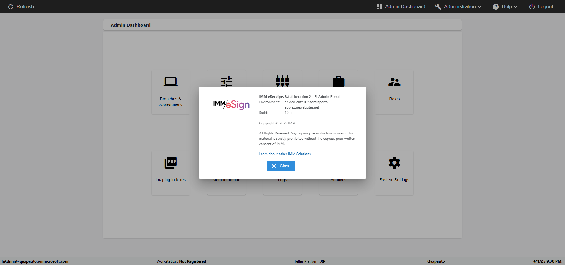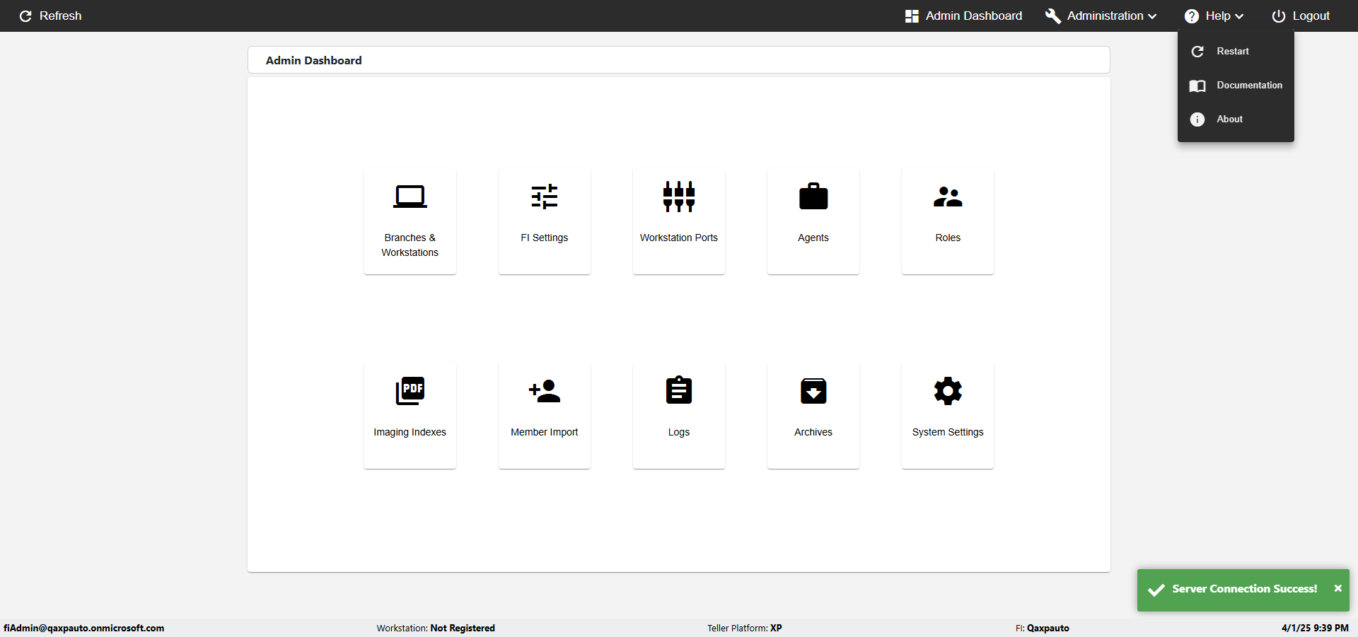 Actual(Passed): Successfully verified the Verfiy Administration menu has the following options- Control Panel, FI Management, Agents, Roles, Imaging Indexes, Member Import, Logging, Archives, About, Logout [ScreenShot]