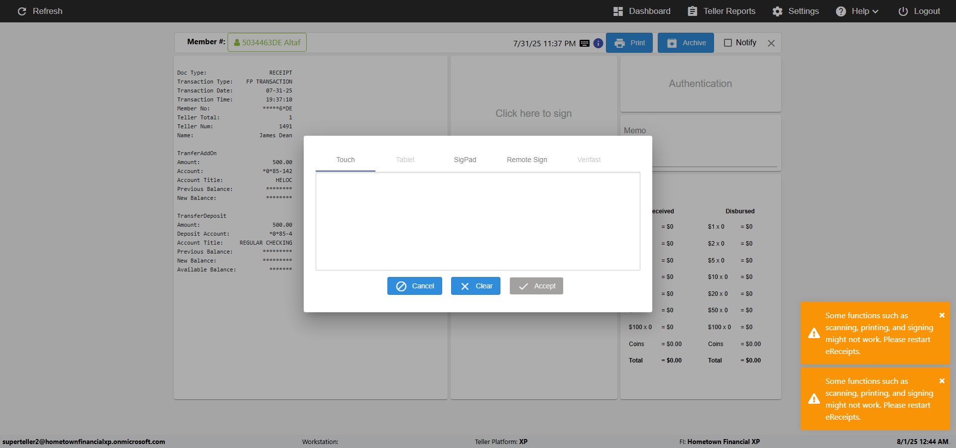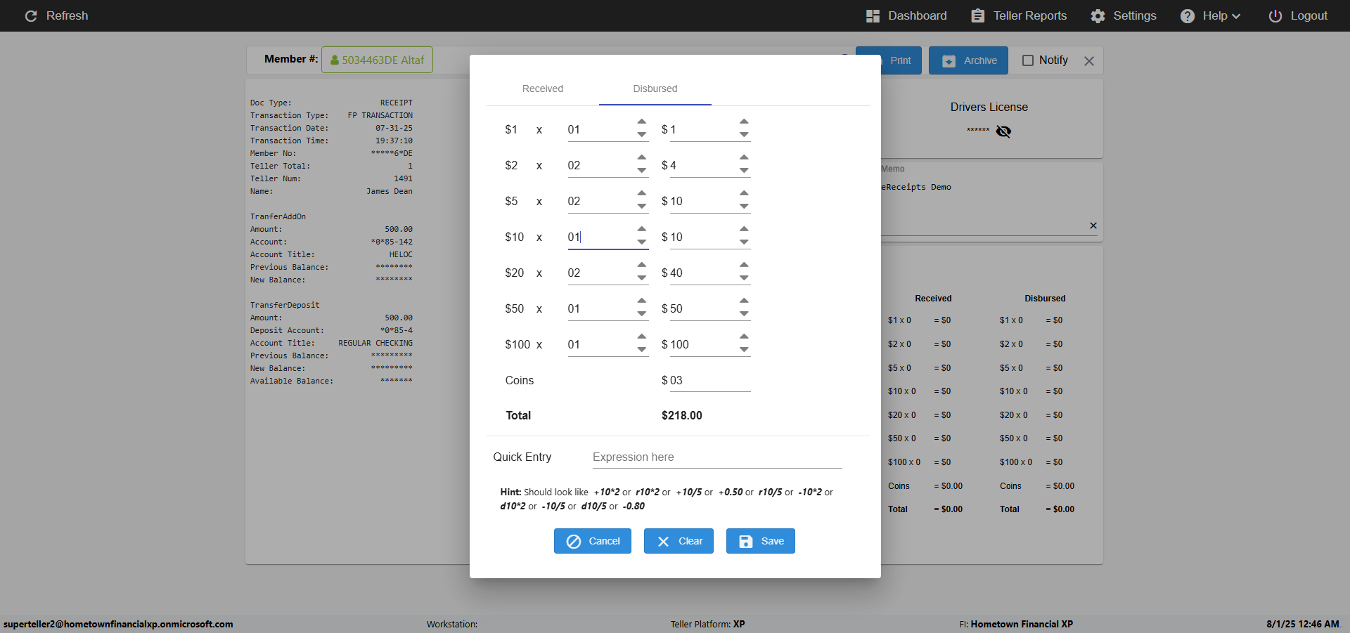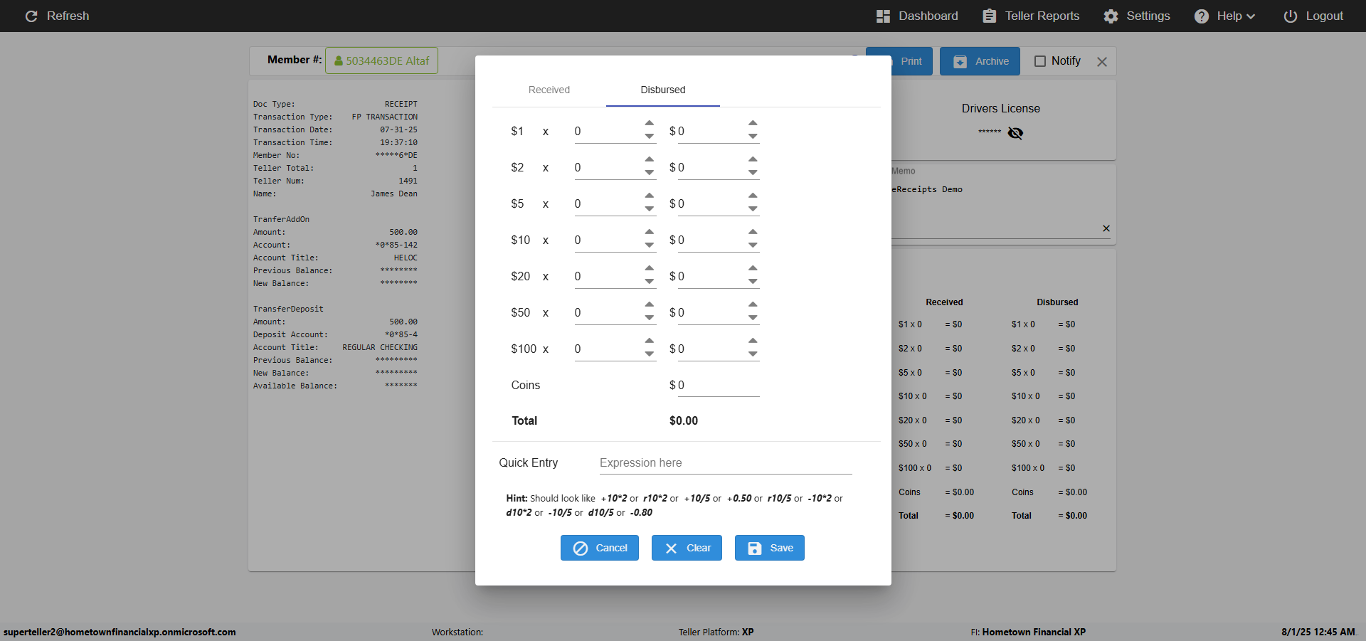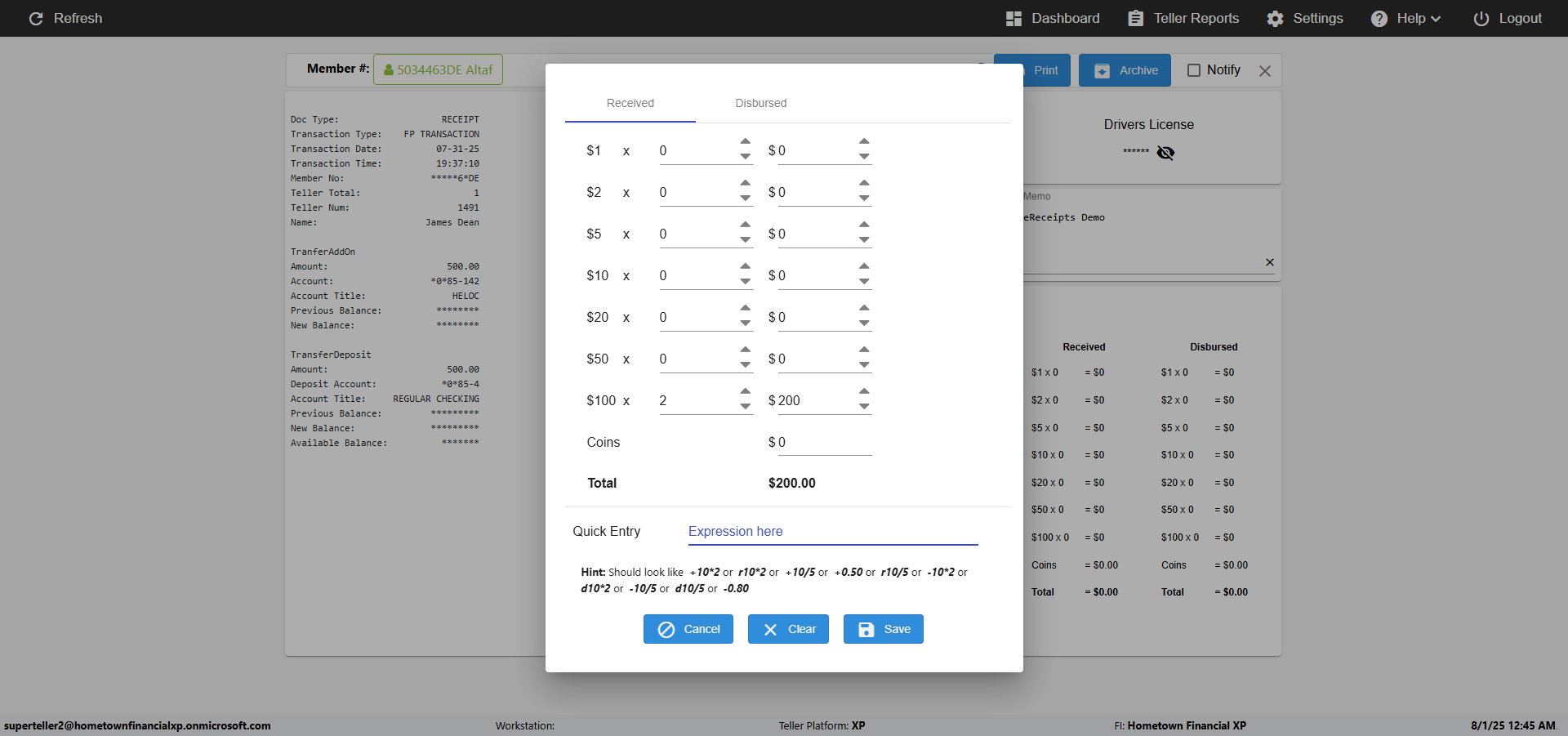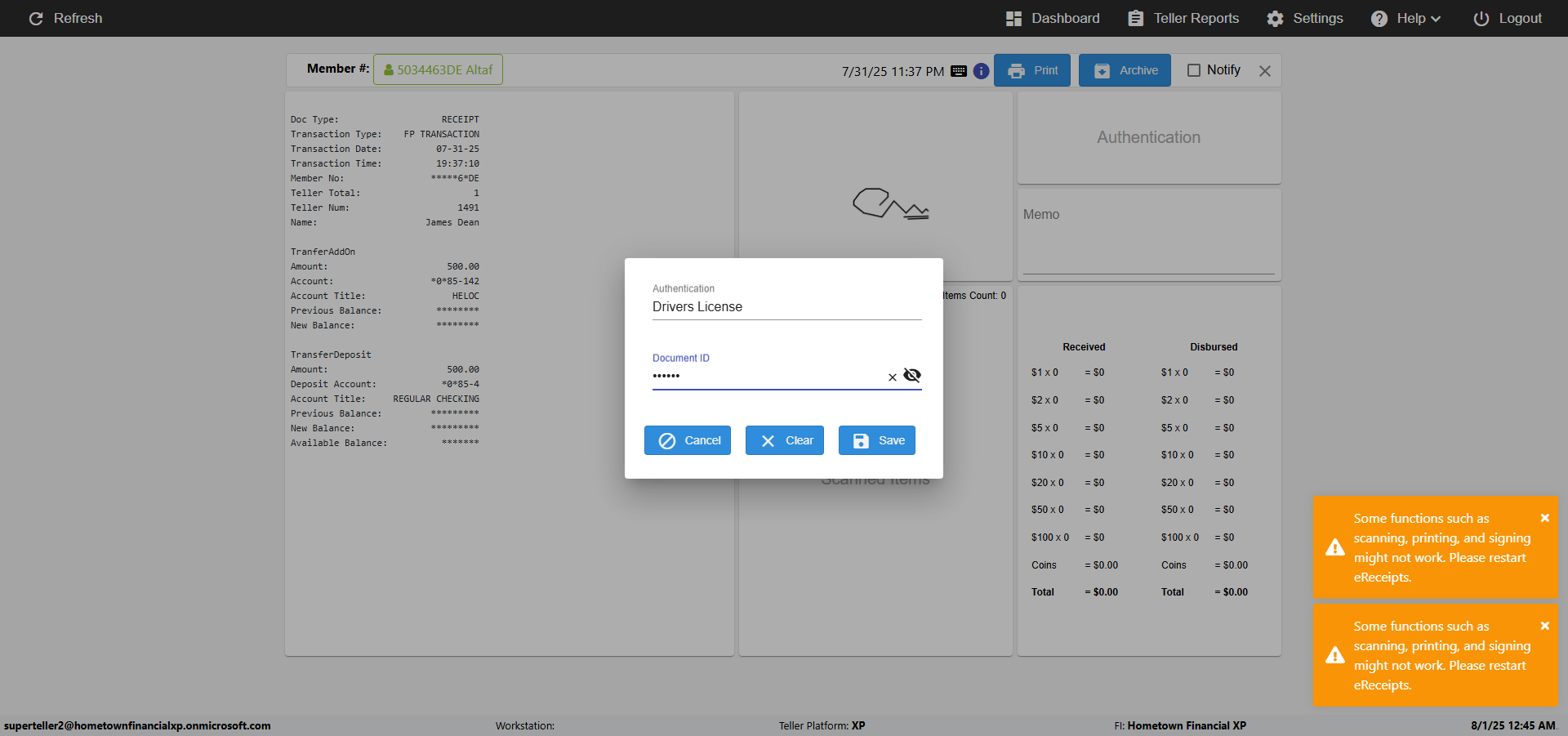 ({Toggel=, Archived Transactions=yes, Description=verify End TO End Test OF Normal Teller In Ereceipt Page, Email=FALSE, Archive=TRUE, Document Type=Drivers License, Notify=TRUE, SignatureTab=Touch,, DisbursedExpression=|-10*5, Operation=, Teller LastName=, Disbursed cash=1-1|2-2|5-2|10-1|20-2|50-1|100-1|Coins-3, errorint=, TestID=verifyEndTOEndTestOFNormalTellerInEreceipt, Print=FALSE, DisbursedExpressionValue=FALSE, Phone=(555) 021-3315, ReceivedCashValue=FALSE, Member=, UserPwd=iMM2022!, Transtatus=Archived-false;Active-true;Error-false, Docment ID=216554, Teller=, Teller FirstName=, errorMessage=, ReceivedExpressionValue=TRUE, Date=, Platfrom=, Received cash=1-1|2-2|5-2|10-1|20-2|50-1|100-1|Coins-3, Transaction=, Header=, Expression=, Username=superteller2@hometownfinancialxp.onmicrosoft.com, DisbursedCashValue=TRUE, FullName=, ReceivedExpression=|+100*2, SMS=FALSE, Memo=eReceipts Demo})