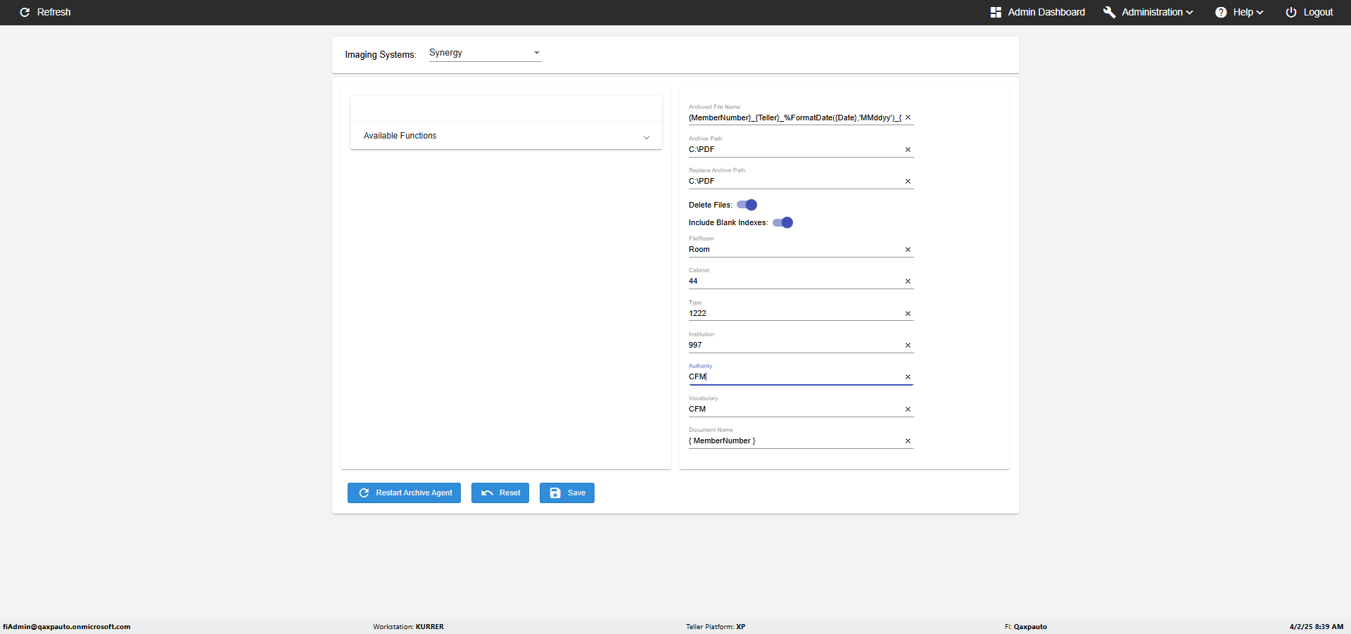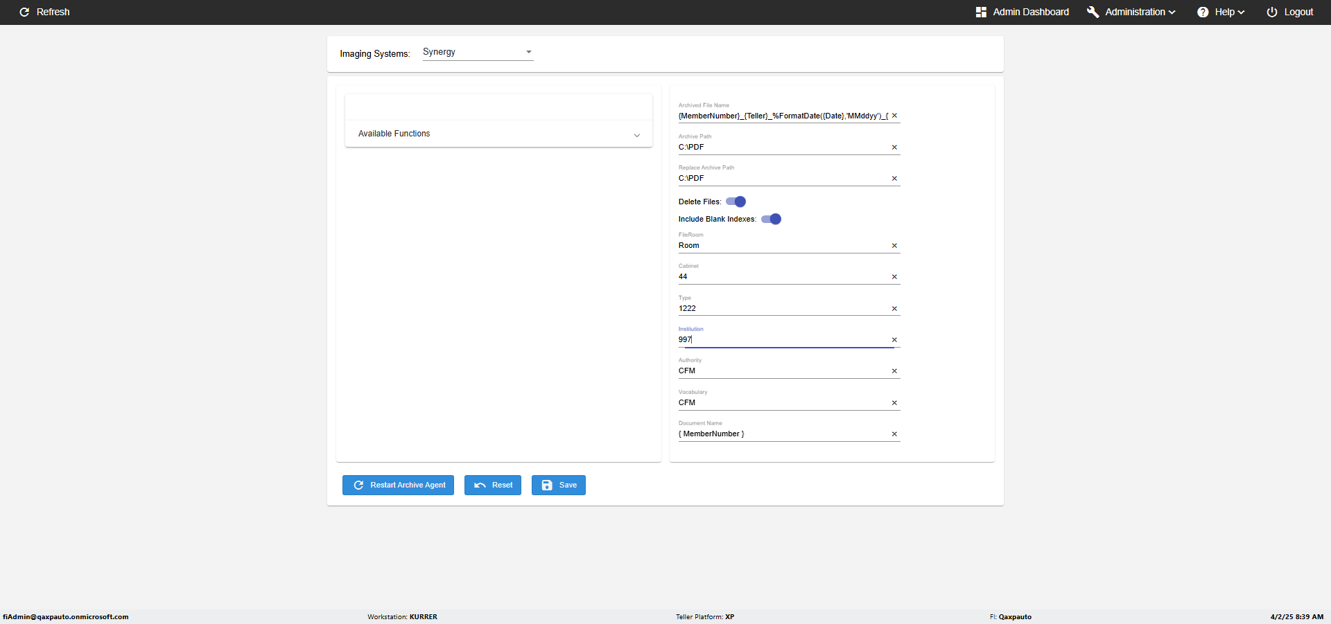 verifyImagingSystem({Archived Transactions=, Archive=, print signatur=, Name=, MultipleWorkstation=, WorkstationDeleteOp...)