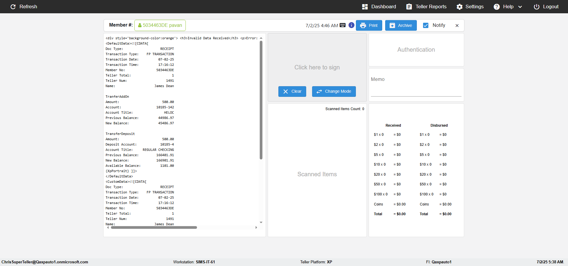 | {Toggel=, Archived Transactions=yes, Description=verify End TO End Test OF Normal Teller In Ereceipt Page, Email=FALSE, Archive=TRUE, Document Type=SSN, Notify=TRUE, SignatureTab=Touch,, DisbursedExpression=|-10*5, Operation=, Teller LastName=, Disbursed cash=1-1|2-2|5-2|10-1|20-2|50-1|100-1|Coins-3, errorint=, TestID=verifyEndTOEndTestOFNormalTellerInEreceipt, Print=FALSE, DisbursedExpressionValue=FALSE, Phone=(732) 890-6074, ReceivedCashValue=FALSE, Member=, UserPwd=iMM2022!, Transtatus=Archived-false;Active-true;Error-false, Docment ID=216554333, Teller=, Teller FirstName=, errorMessage=, ReceivedExpressionValue=TRUE, SecondName=, Date=, Platfrom=, Received cash=1-1|2-2|5-2|10-1|20-2|50-1|100-1|Coins-3, Transaction=, Header=, Expression=, Username=ChrisSuperTeller@Qaxpauto1.onmicrosoft.com, DisbursedCashValue=TRUE, FullName=, ReceivedExpression=|+100*2, SMS=FALSE, Memo=eReceipts Demo} |