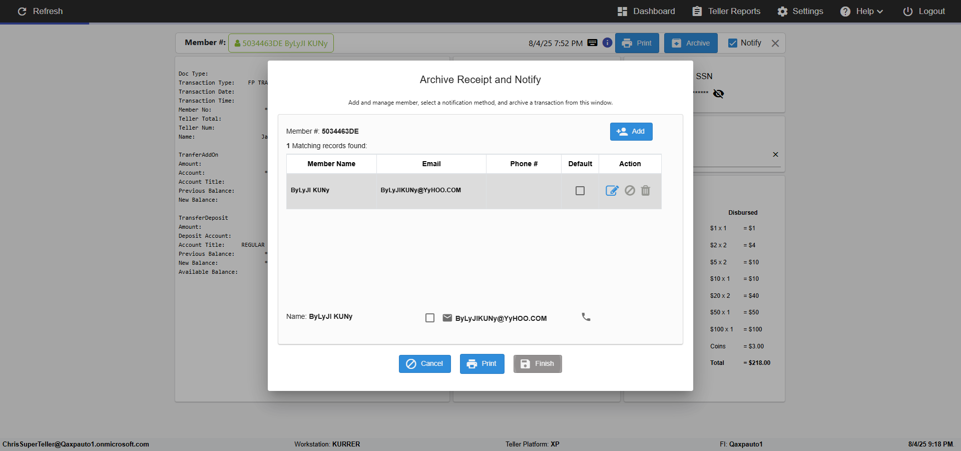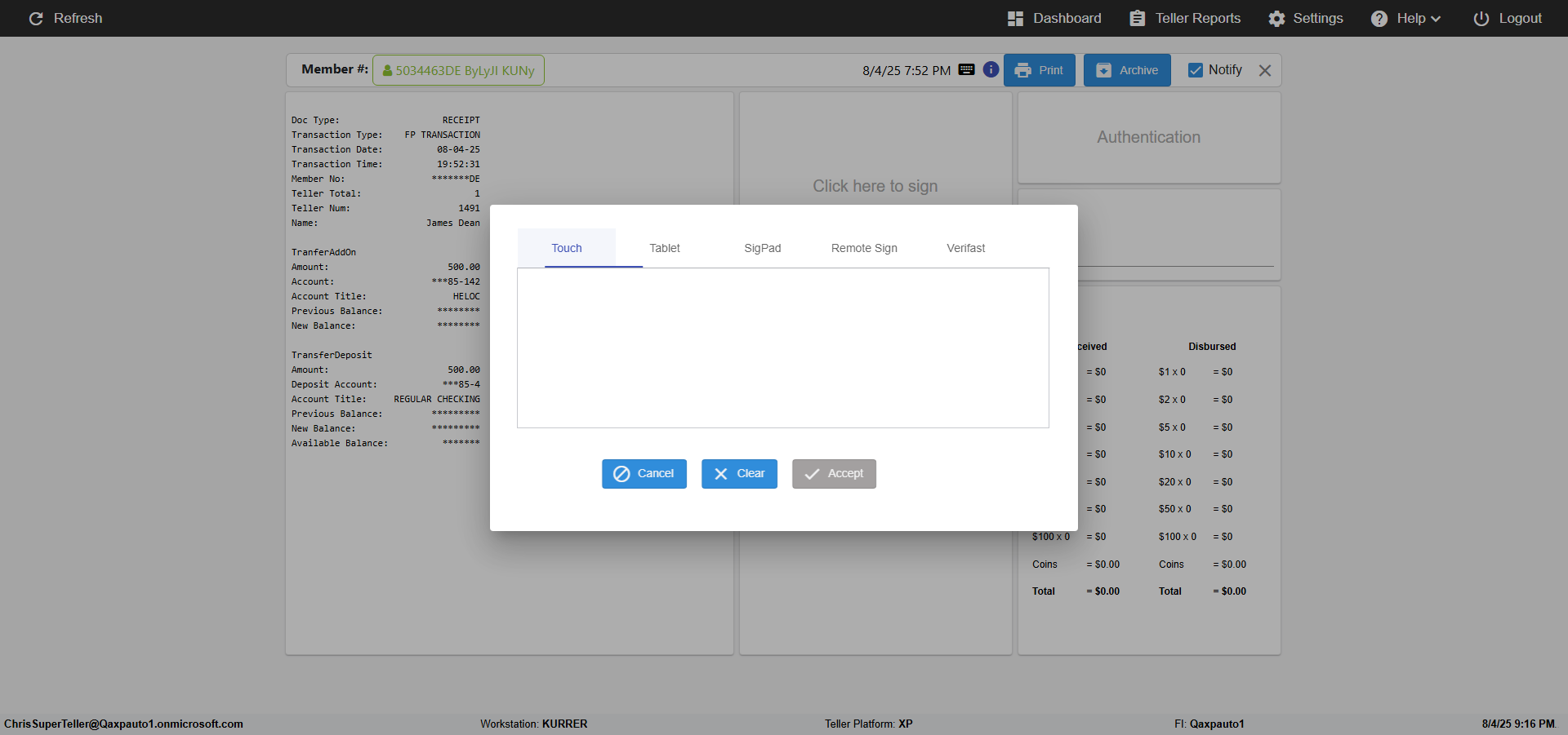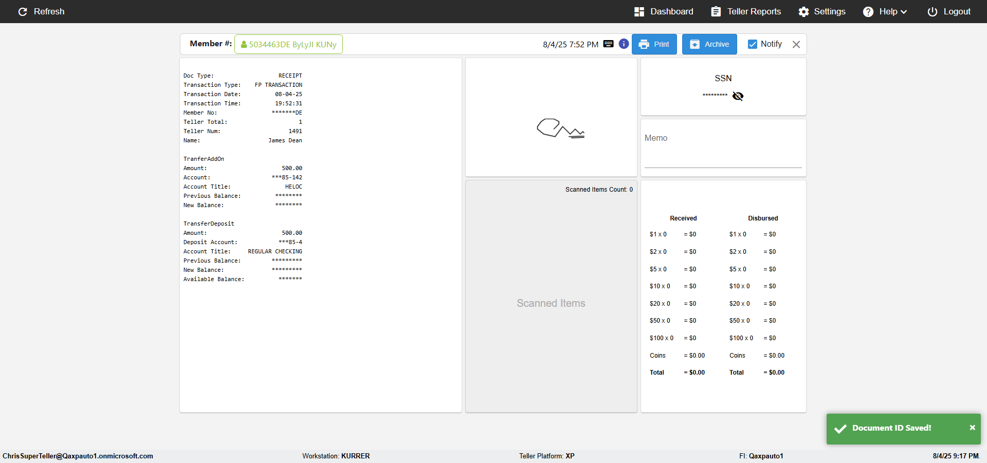 | {Toggel=, Archived Transactions=yes, Description=verify End TO End Test OF Normal Teller In Ereceipt Page, Email=FALSE, Archive=TRUE, Document Type=SSN, Notify=TRUE, SignatureTab=Touch,, DisbursedExpression=|-10*5, Operation=, Teller LastName=, Disbursed cash=1-1|2-2|5-2|10-1|20-2|50-1|100-1|Coins-3, errorint=, TestID=verifyEndTOEndTestOFNormalTellerInEreceipt, Print=FALSE, DisbursedExpressionValue=FALSE, Phone=(555) 021-3315, ReceivedCashValue=FALSE, Member=, UserPwd=iMM2022!, Transtatus=Archived-false;Active-true;Error-false, Docment ID=216554121, Teller=, Teller FirstName=, errorMessage=, ReceivedExpressionValue=TRUE, SecondName=, Date=, Platfrom=, Received cash=1-1|2-2|5-2|10-1|20-2|50-1|100-1|Coins-3, Transaction=, Header=, Expression=, Username=ChrisSuperTeller@Qaxpauto1.onmicrosoft.com, DisbursedCashValue=TRUE, FullName=, ReceivedExpression=|+100*2, SMS=FALSE, Memo=eReceipts Demo} |