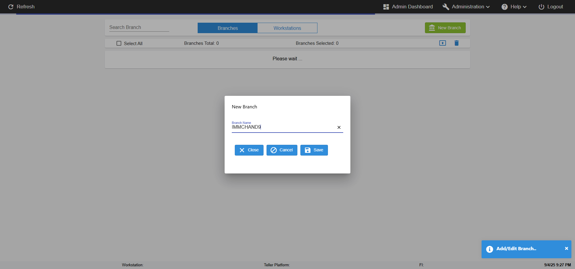 | 09:27:35 PM | Clicked on Add New Branch icon | |