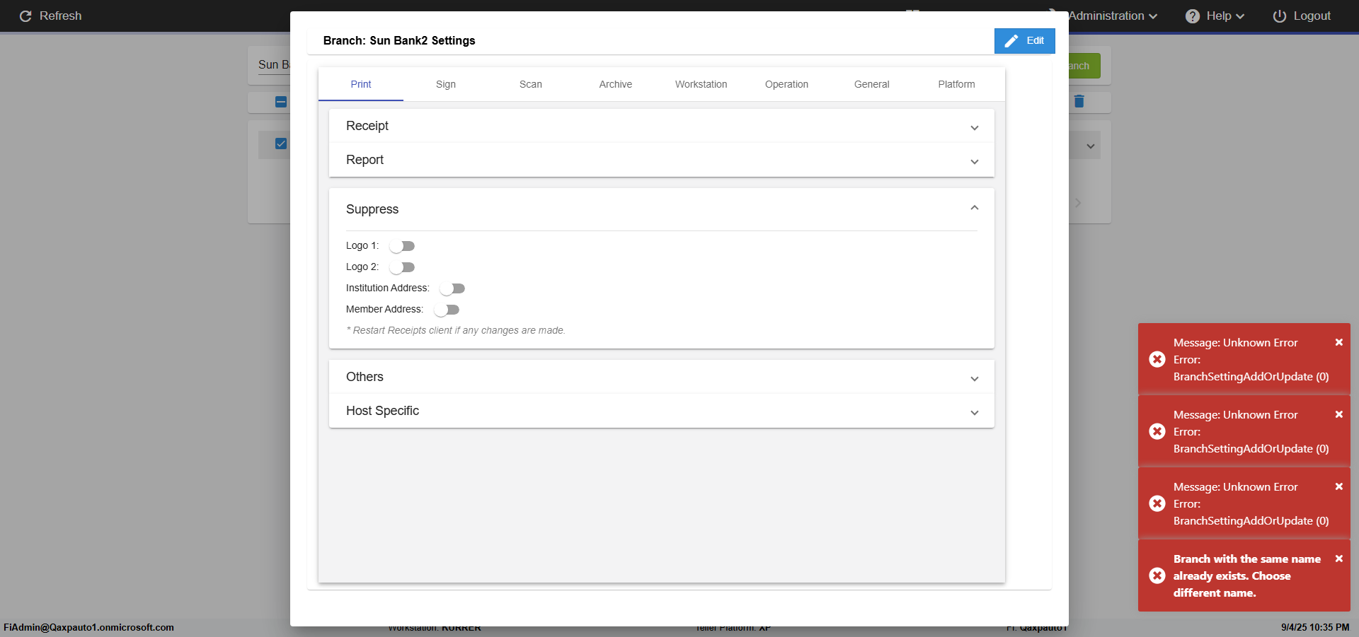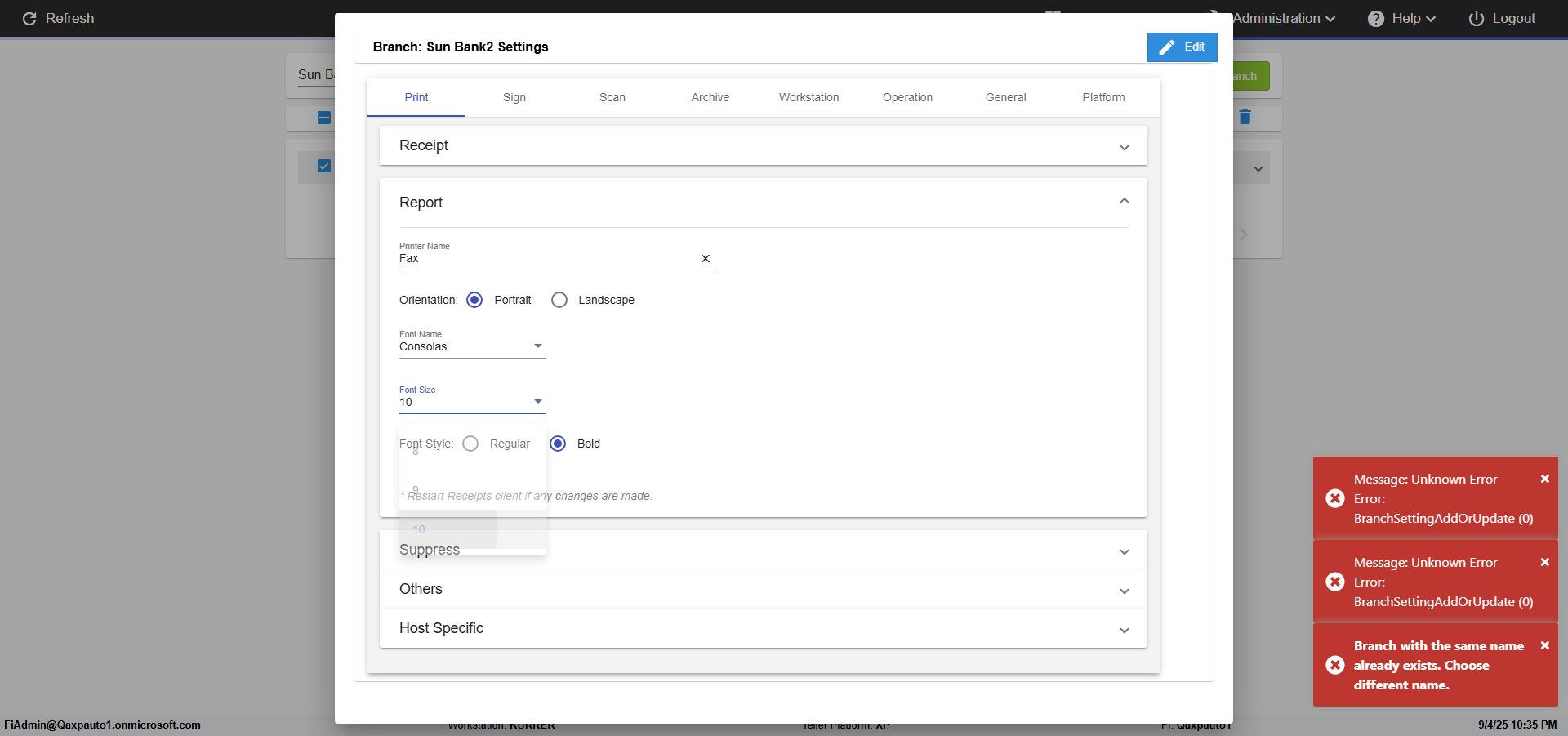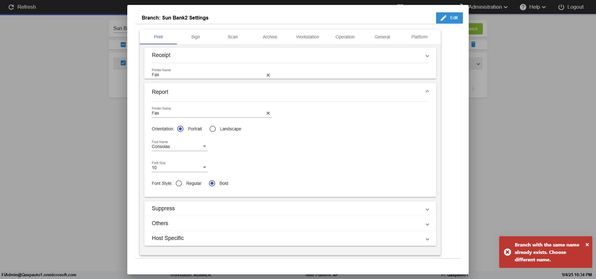 {FromBranch=, Archived Transactions=, Description=verify Branch print settings Admin Portal, Archive=, Operation=, print signatur=, Name=, Clear=, TestID=verifyBranchPrintSettingsInAdmin, Phone=, MultipleWorkstation=, WorkstationName=, ToBranch=, WorkstationDeleteOption=, Subscription Names=, BranchName=Sun Bank2, retention=, FilePath=, Agent=, UserPwd=iMM2022!, BranchDeleteOption=, Transtatus=Archived-false;Active-true;Error-false, Receipt=Printer Name-Fax;Name-Courier New;Size-8;Style-Bold,Narrow, Report=Printer Name-Fax;Orientation-Portrait;Name-Consolas;Size-10;Style-Bold, Index_Field_Name=, Agents=, IPFilter=, Text=, Hold Notice=, Suppress=Log1-false;Log2-false;CuAddress-false;Member Address-false, SchedualType=, Date=, Platfrom=, GroupId=, print Disburstments=FALSE, Role=, Brand=, SMTP=, Print signature line=print the sign, TimeZone=, Imaging System=, Header=, MultipleBranches=, Username=fiAdmin@Qaxpauto1.onmicrosoft.com, MappedOption=, Sign=, Scan=, PortNumber=}