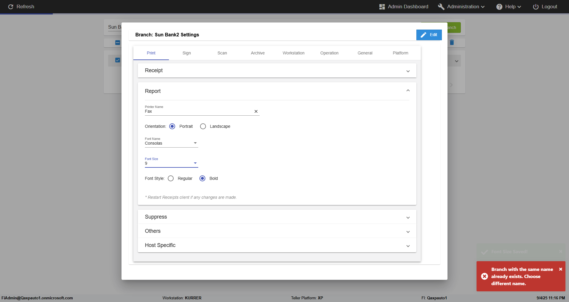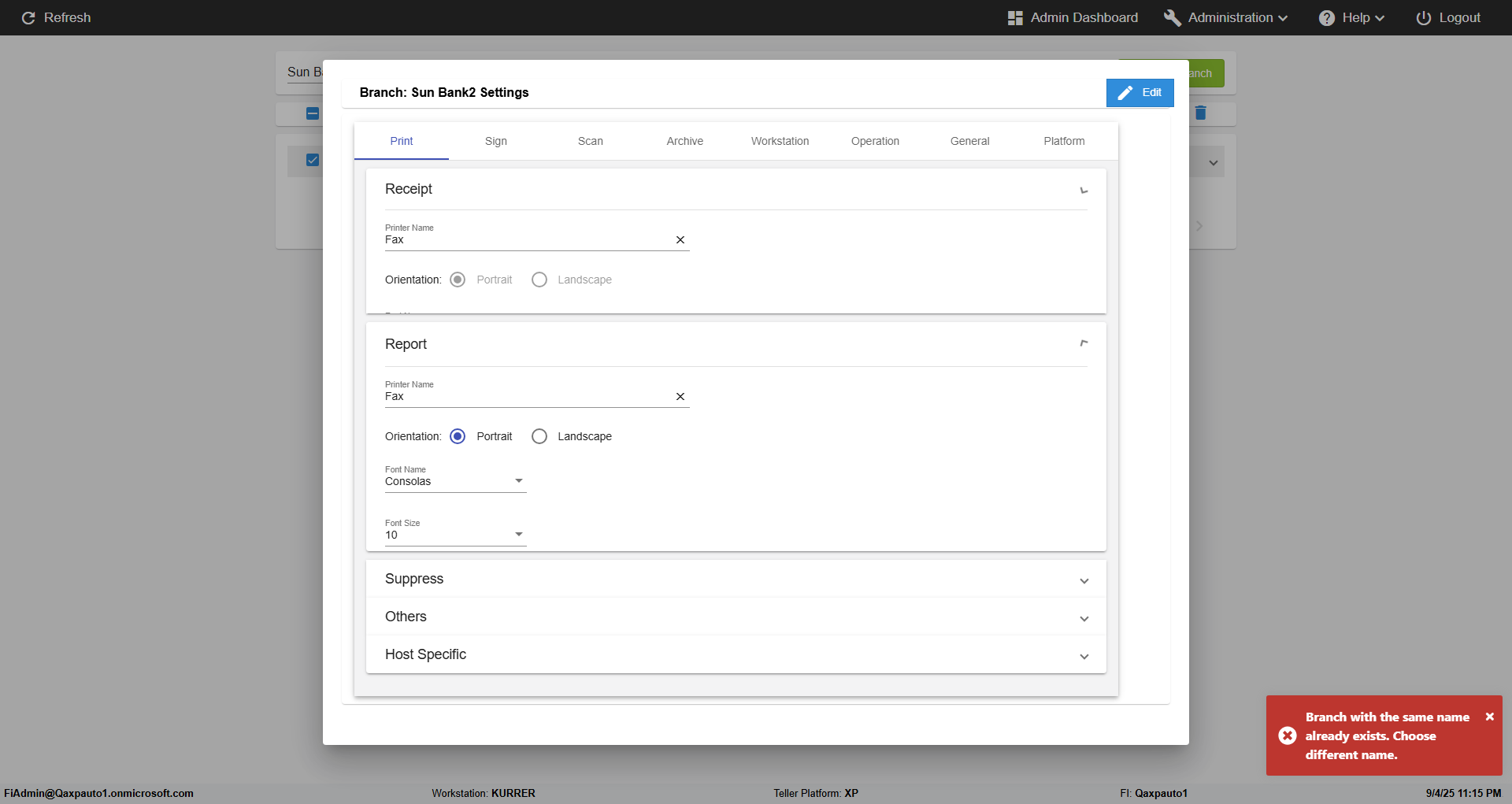 {FromBranch=, Archived Transactions=, Description=verify Branch print settings Admin Portal, Archive=, Operation=, print signatur=, Name=, Clear=, TestID=verifyBranchPrintSettingsInAdmin, Phone=, MultipleWorkstation=, WorkstationName=, ToBranch=, WorkstationDeleteOption=, Subscription Names=, BranchName=Sun Bank2, retention=, FilePath=, Agent=, UserPwd=iMM2022!, BranchDeleteOption=, Transtatus=Archived-false;Active-true;Error-false, Receipt=Printer Name-Fax;Name-Courier New;Size-8;Style-Bold,Narrow, Report=Printer Name-Fax;Orientation-Portrait;Name-Consolas;Size-9;Style-Regular, Index_Field_Name=, Agents=, IPFilter=, Text=, Hold Notice=, Suppress=Log1-true;Log2-true;CuAddress-false;Member Address-false, SchedualType=, Date=, Platfrom=, GroupId=, print Disburstments=FALSE, Role=, Brand=, SMTP=, Print signature line=print the sign, TimeZone=, Imaging System=, Header=, MultipleBranches=, Username=fiAdmin@Qaxpauto1.onmicrosoft.com, MappedOption=, Sign=, Scan=, PortNumber=}