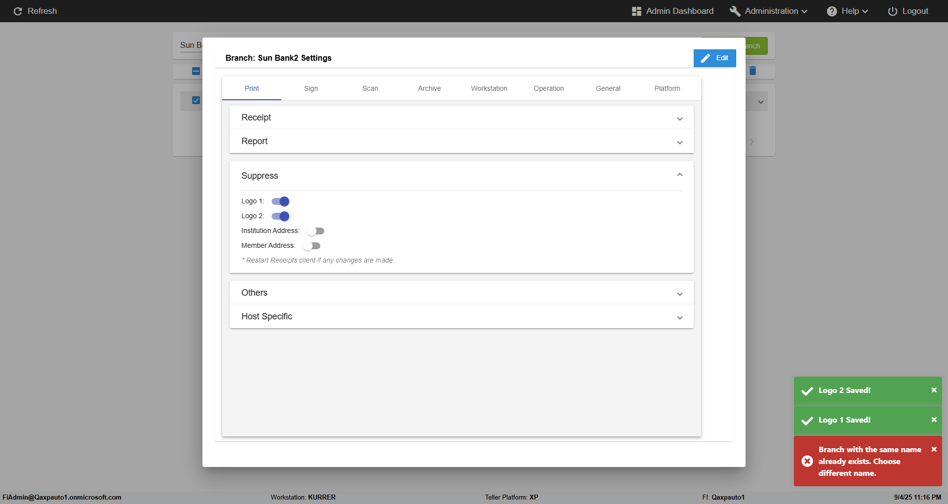 verify Branch print settings Admin Portal