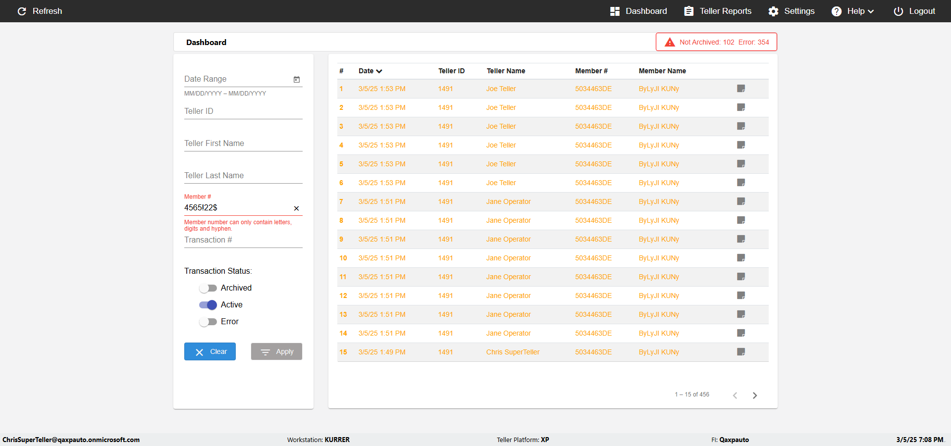 (Verify negative/invalid Search of the Date,Teller,Teller name,Member name in DashBoard page)