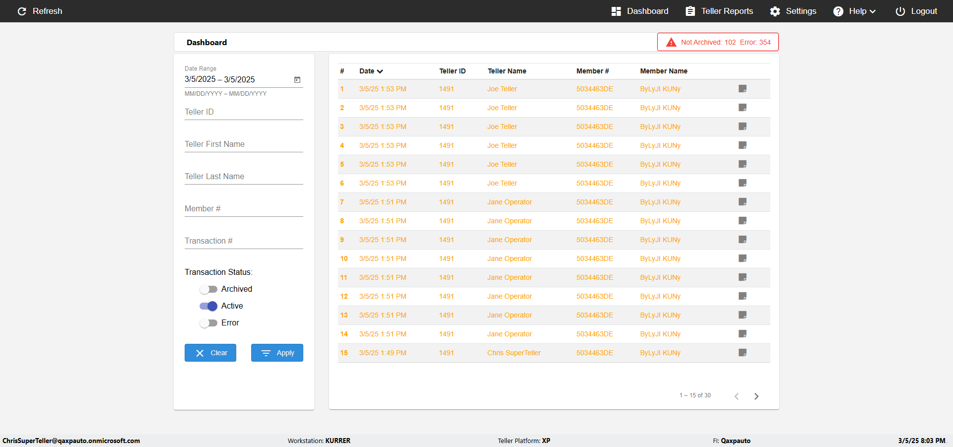 Super Teller -Successfully verifed 'Date','Teller#','FirstName','LastName','Member ID','Transaction id','Archive Trancation','Apply','Clear' UI Elemnts in the 'Dashboard' page [ScreenShot]