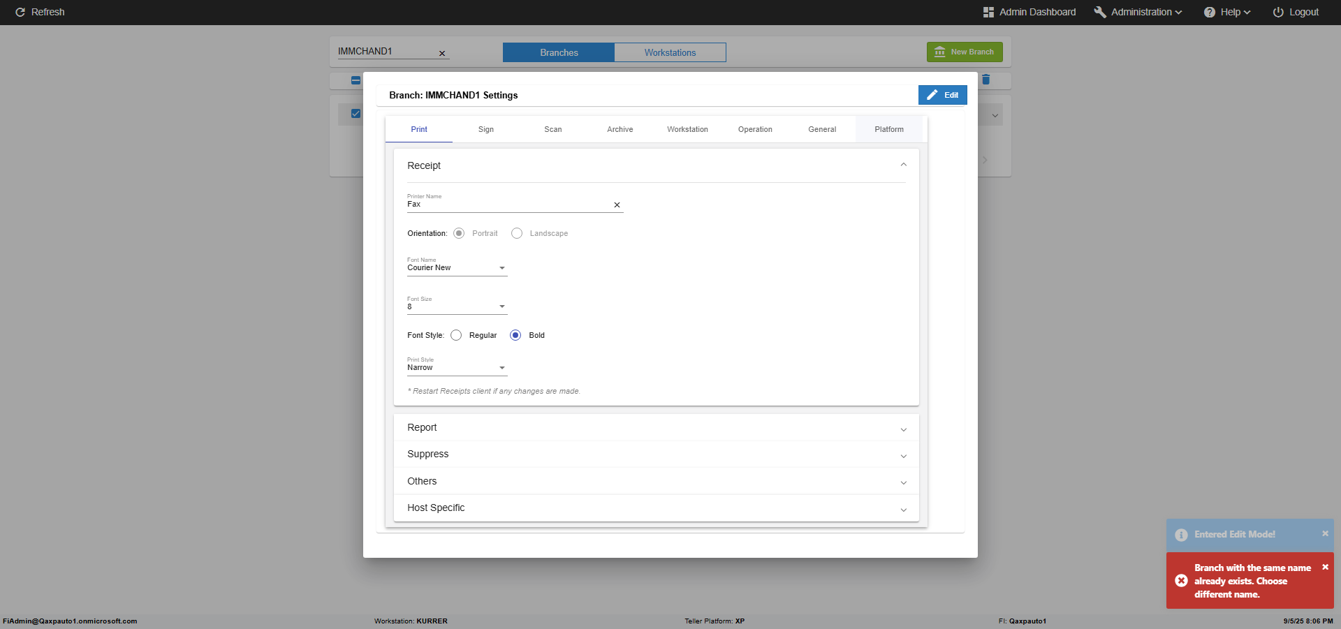 | {FromBranch=, Archived Transactions=, Description=verify Branch sign settings Admin Portal, Archive=, Operation=, print signatur=, Name=, Clear=, TestID=verifyBranchSignSettingsInAdmin, Phone=, MultipleWorkstation=, WorkstationName=, ToBranch=, WorkstationDeleteOption=, Subscription Names=, BranchName=IMMCHAND1, retention=, FilePath=, Agent=, UserPwd=iMM2022!, BranchDeleteOption=, Transtatus=Archived-false;Active-true;Error-false, Receipt=, Report=, Index_Field_Name=, Agents=, IPFilter=, Text=, Hold Notice=, Suppress=, SchedualType=, Date=, Platfrom=, GroupId=, print Disburstments=, Role=, Brand=, SMTP=, Print signature line=, TimeZone=, Imaging System=, Header=, MultipleBranches=, Username=fiAdmin@Qaxpauto1.onmicrosoft.com, MappedOption=, Sign=Default Signature Device-Sigpad;Device Model-Topaz 4x5;Connection-COM3;Backlight-true, Scan=, PortNumber=} |