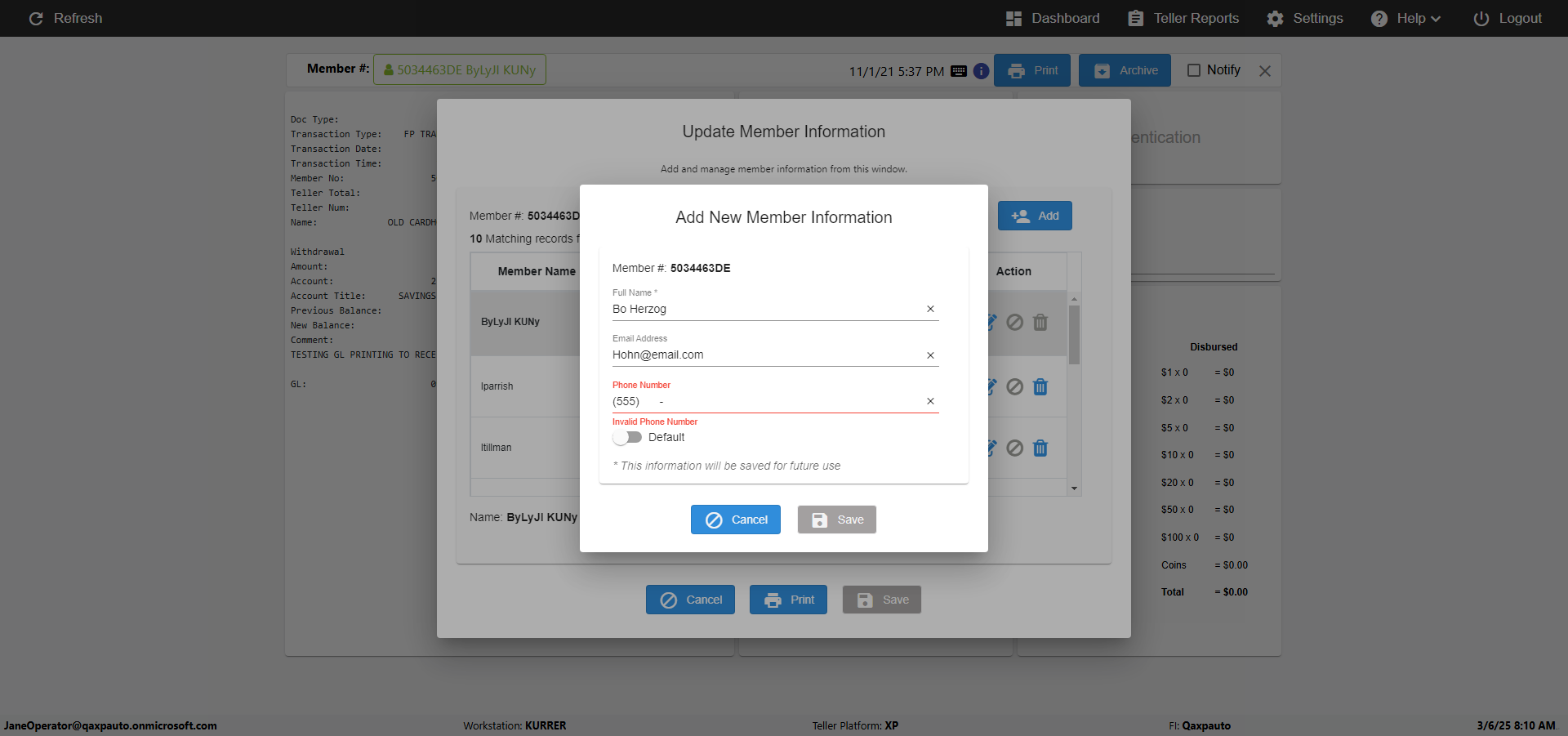 ({Toggel=TRUE, Archived Transactions=no, Description=verify MemberID And Archive Information Update, Email=Hohn@email.com, Archive=, Document Type=, Notify=, SignatureTab=, DisbursedExpression=, Operation=, Teller LastName=, Disbursed cash=, errorint=, TestID=verifyMemberAddUpdateContactInfo, Print=, DisbursedExpressionValue=, Phone=(555) 021-3315, ReceivedCashValue=, Member=5034463, UserPwd=iMM2022!, Transtatus=Archived-false;Active-true;Error-false, Docment ID=, Teller=, Teller FirstName=, errorMessage=, ReceivedExpressionValue=, Date=11/01/2021 - 11/20/2021, Platfrom=, Received cash=, Transaction=, Header=, Expression=, Username=JaneOperator@Qaxpauto.onmicrosoft.com, DisbursedCashValue=, FullName=John, ReceivedExpression=, SMS=, Memo=})