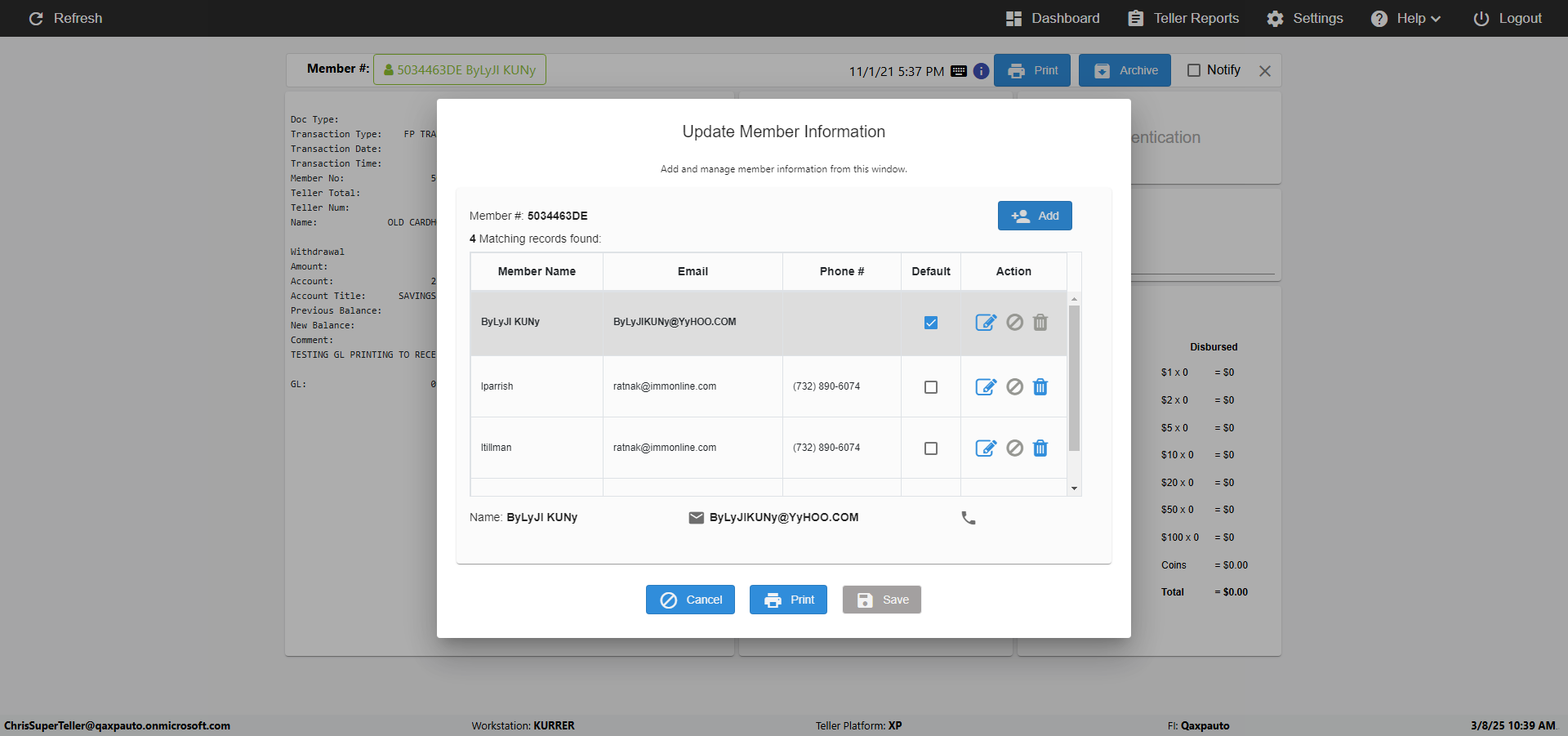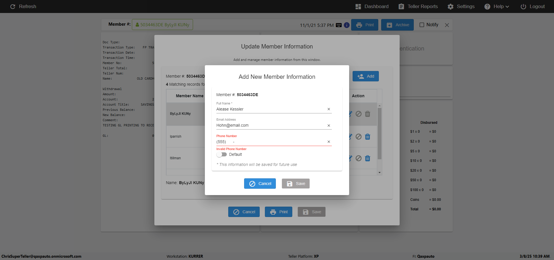 ({Toggel=TRUE, Archived Transactions=no, Description=verify MemberID And Archive Information Update, Email=Hohn@email.com, Archive=, Document Type=, Notify=, SignatureTab=, DisbursedExpression=, Operation=, Teller LastName=, Disbursed cash=, errorint=, TestID=verifyMemberAddUpdateContactInfo, Print=, DisbursedExpressionValue=, Phone=(555) 021-3315, ReceivedCashValue=, Member=5034463, UserPwd=iMM2022!, Transtatus=Archived-false;Active-true;Error-false, Docment ID=, Teller=, Teller FirstName=, errorMessage=, ReceivedExpressionValue=, Date=11/01/2021 - 11/20/2021, Platfrom=, Received cash=, Transaction=, Header=, Expression=, Username=ChrisSuperTeller@Qaxpauto.onmicrosoft.com, DisbursedCashValue=, FullName=John, ReceivedExpression=, SMS=, Memo=})