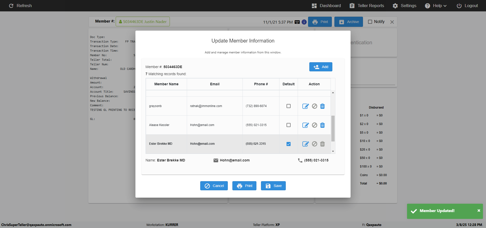({Toggel=TRUE, Archived Transactions=no, Description=verify MemberID And Archive Information Update, Email=Hohn@email.com, Archive=, Document Type=, Notify=, SignatureTab=, DisbursedExpression=, Operation=, Teller LastName=, Disbursed cash=, errorint=, TestID=verifyMemberAddUpdateContactInfo, Print=, DisbursedExpressionValue=, Phone=(555) 021-3315, ReceivedCashValue=, Member=5034463, UserPwd=iMM2022!, Transtatus=Archived-false;Active-true;Error-false, Docment ID=, Teller=, Teller FirstName=, errorMessage=, ReceivedExpressionValue=, Date=11/01/2021 - 11/20/2021, Platfrom=, Received cash=, Transaction=, Header=, Expression=, Username=ChrisSuperTeller@Qaxpauto.onmicrosoft.com, DisbursedCashValue=, FullName=John, ReceivedExpression=, SMS=, Memo=})