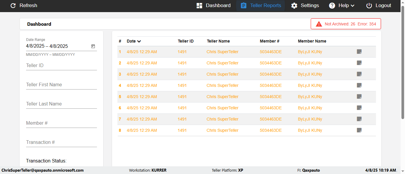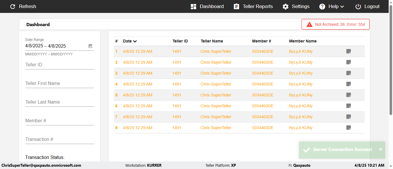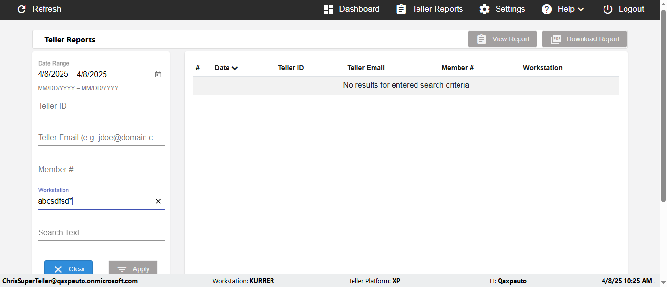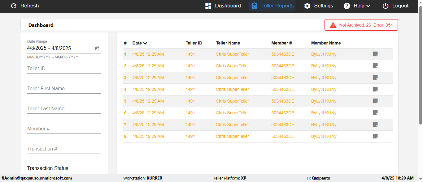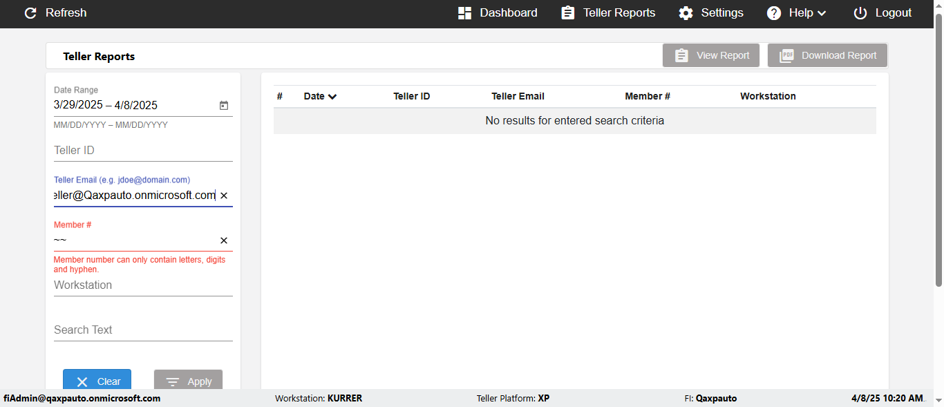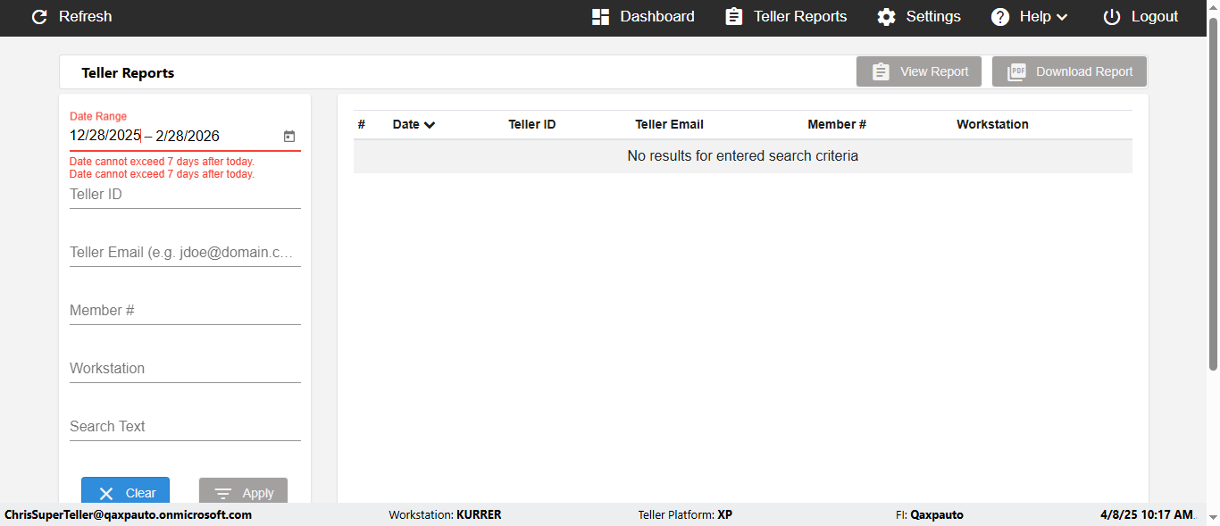({UserPwd=iMM2022!, Description=verify Error Messages in Report Page for Date, Teller ID=, errorMessage=Date cannot exceed 7 days after today.;Date cannot exceed 7 days after today., Teller Email=, View=, Date=12/28/2025 - 2/28/2026, Clear=, Workstation=, errorint=2, TestID=verifyErrorMessagesInReports, Transaction=, Header=, Username=ChrisSuperTeller@Qaxpauto.onmicrosoft.com, Export=, Member #=, Search Text=, Level=})