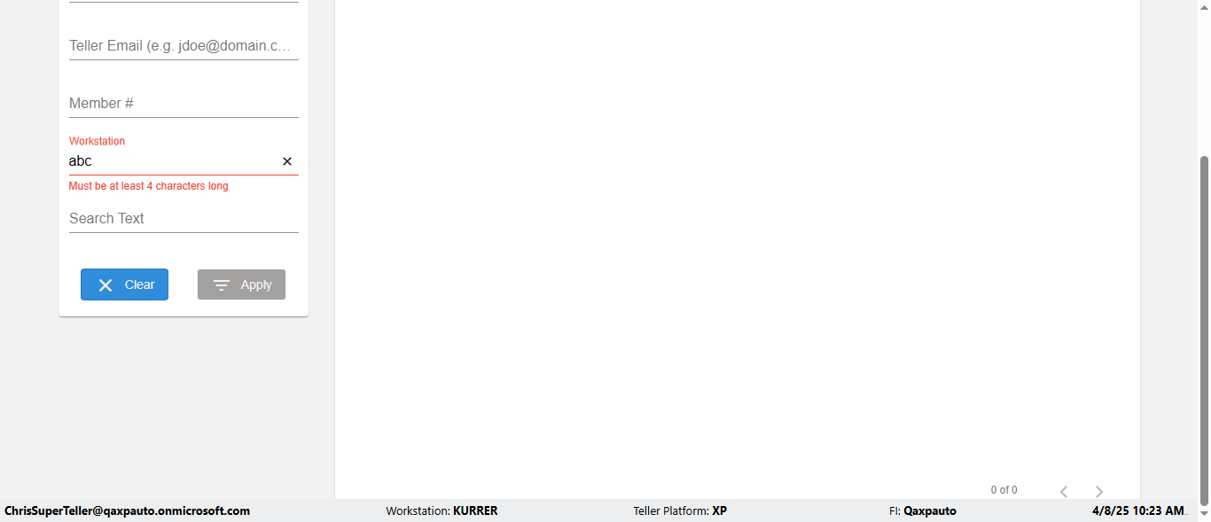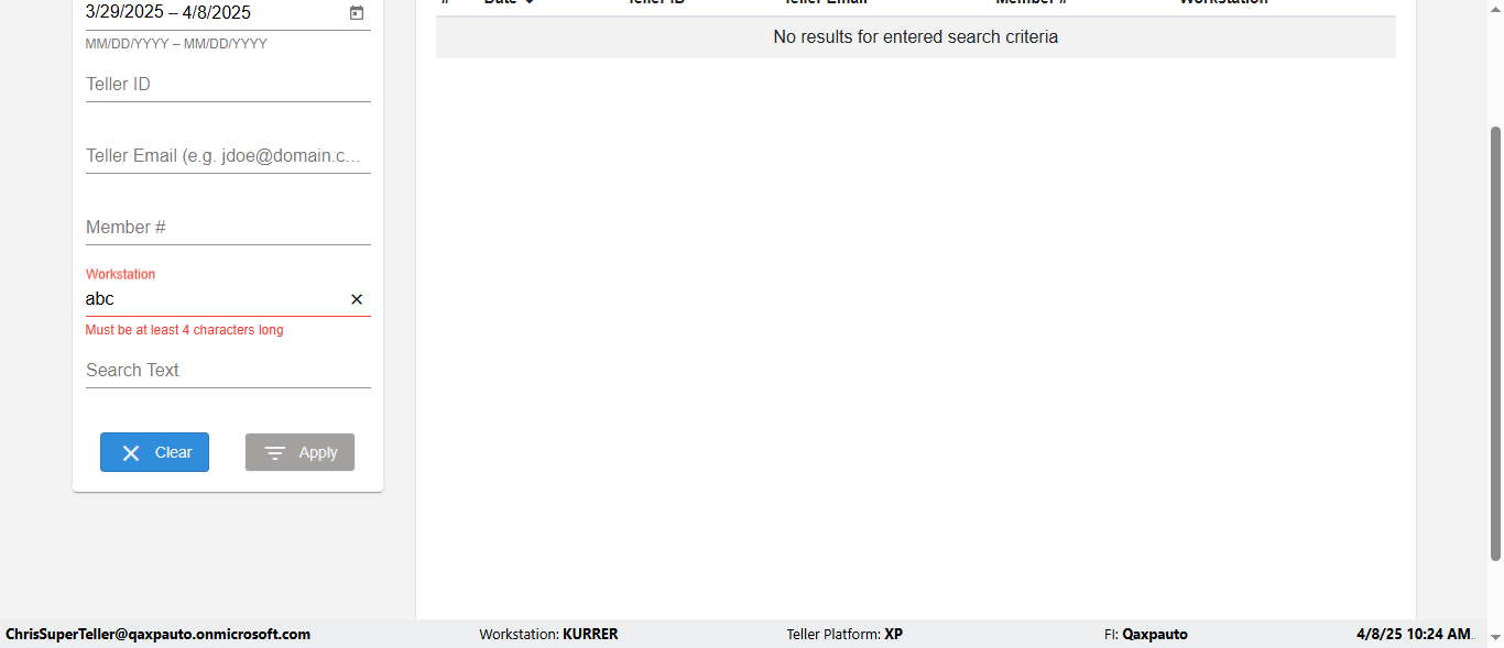 ({UserPwd=iMM2022!, Description=verify Error Messages in Report Page for Workstation Length, Teller ID=, errorMessage=Must be at least 4 characters long, Teller Email=, View=, Date=10, Clear=, Workstation=abc, errorint=1, TestID=verifyErrorMessagesInReports, Transaction=, Header=, Username=ChrisSuperTeller@Qaxpauto.onmicrosoft.com, Export=, Member #=, Search Text=, Level=})