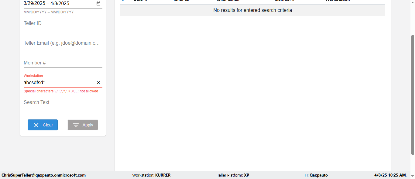 ({UserPwd=iMM2022!, Description=verify Error Messages in Report Page for Workstation special characters, Teller ID=, errorMessage=Special characters \,/,:,*,?,",>,<,|,.: not allowed, Teller Email=, View=, Date=10, Clear=, Workstation=abcsdfsd*, errorint=1, TestID=verifyErrorMessagesInReports, Transaction=, Header=, Username=ChrisSuperTeller@Qaxpauto.onmicrosoft.com, Export=, Member #=, Search Text=, Level=})