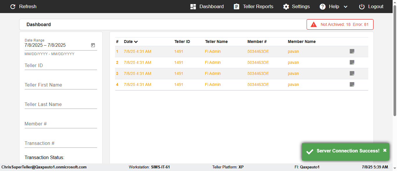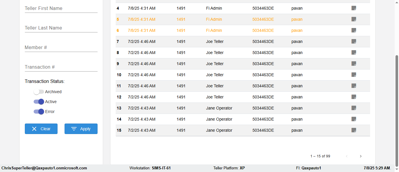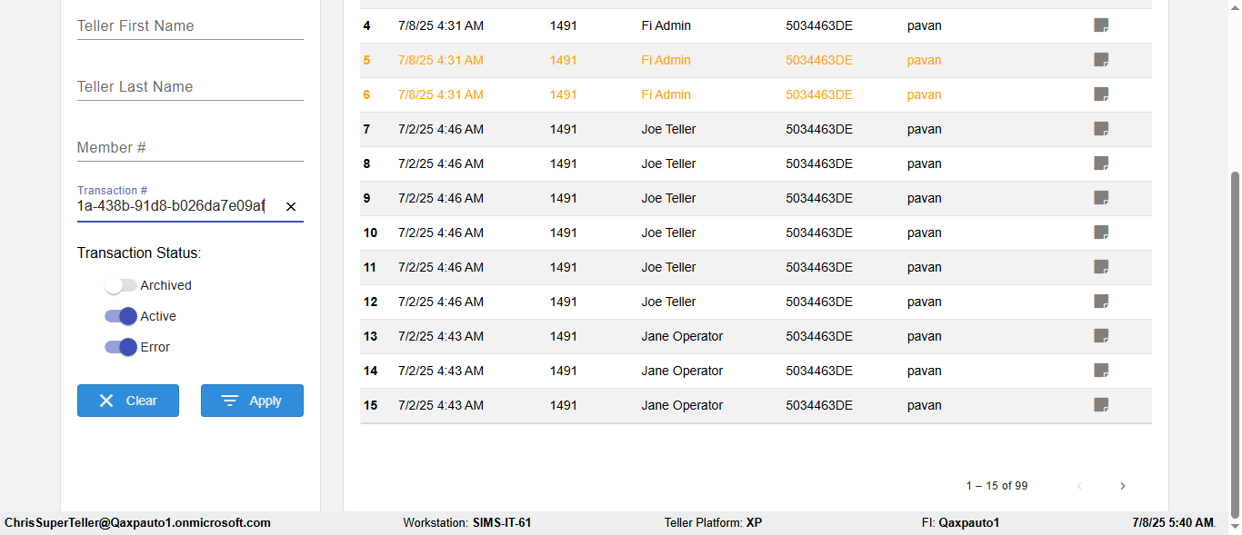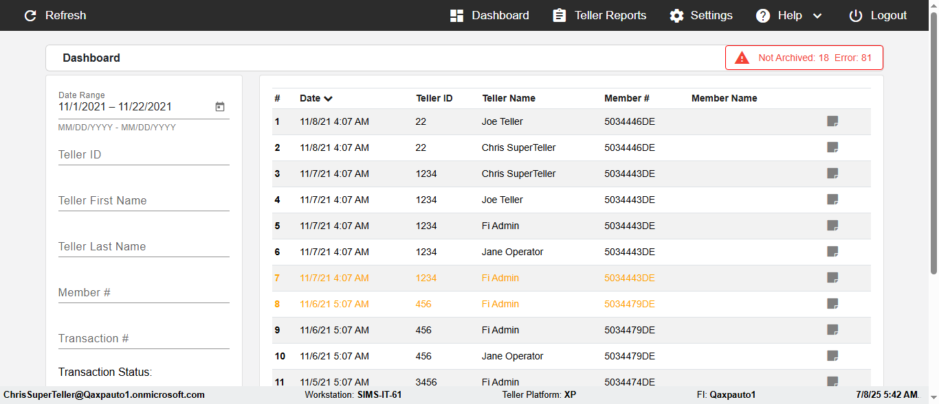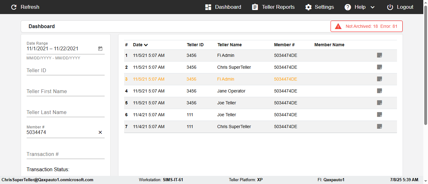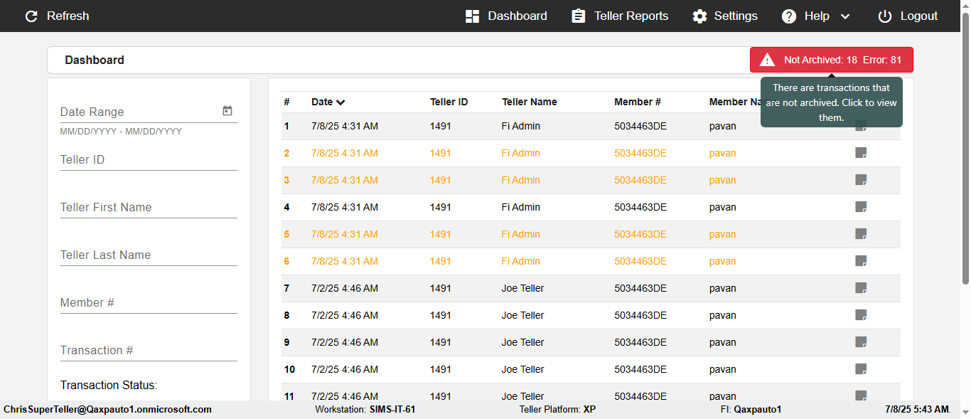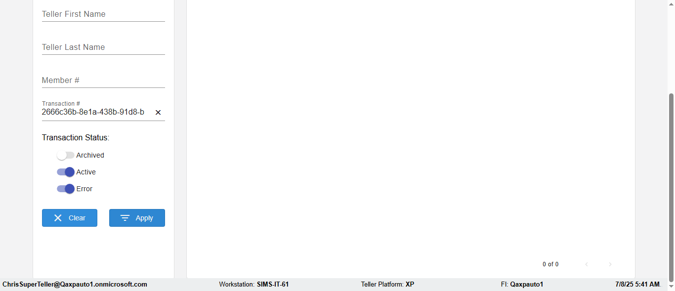 ({Description=verify UI Elemnts In DashBoard with Member, Email=, Teller LastName=, print signatur=, errorint=, TestID=verifyFiltersInDashBoard, Color Transactions=no, Member=5034474, UserPwd=iMM2022!, Transtatus=Archived-True;Active-False;Error-false, Receipt=, Report=, Teller=, Teller FirstName=, errorMessage=, Suppress=, Date=11/01/2021 - 11/22/2021, print Disburstments=, Print signature line=, Type=, Transaction=, Header=, Username=ChrisSuperTeller@Qaxpauto1.onmicrosoft.com, SMS=, Sign=, Scan=})