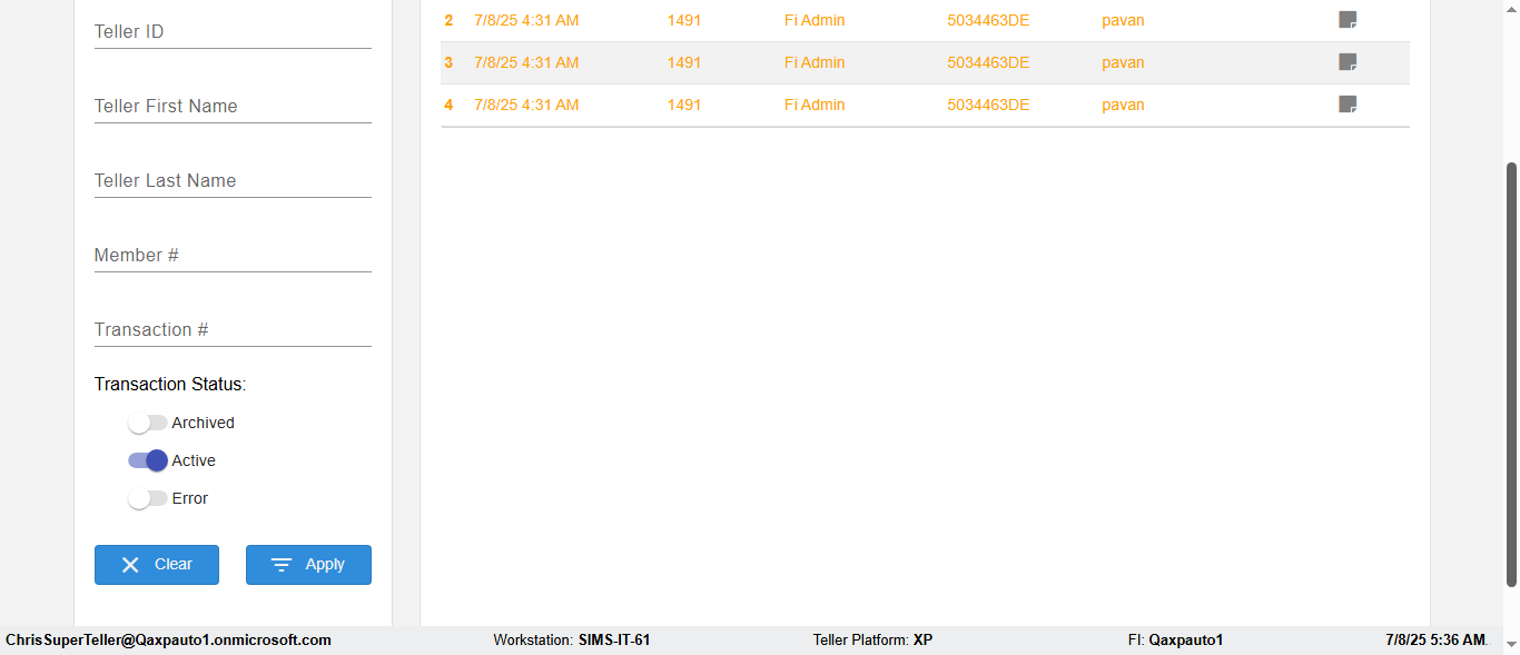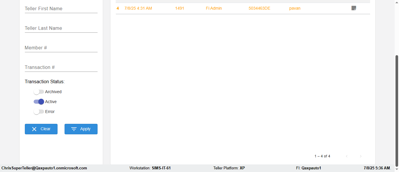 ({Description=Verify Transaction in Dashboard Page, Email=, Teller LastName=, print signatur=, errorint=, TestID=verifyFiltersInDashBoard, Color Transactions=All, Member=, UserPwd=iMM2022!, Transtatus=Archived-false;Active-true;Error-false, Receipt=, Report=, Teller=, Teller FirstName=, errorMessage=, Suppress=, Date=, print Disburstments=, Print signature line=, Type=, Transaction=2666c36b-8e1a-438b-91d8-b026da7e09af, Header=, Username=ChrisSuperTeller@Qaxpauto1.onmicrosoft.com, SMS=, Sign=, Scan=})