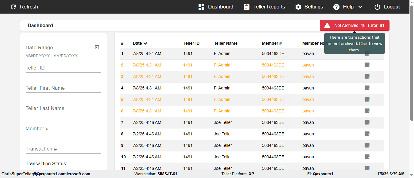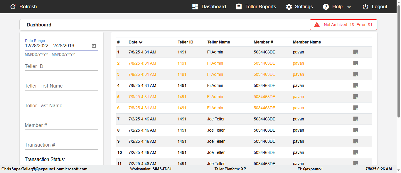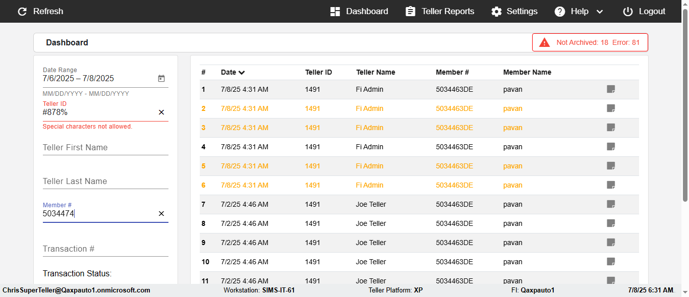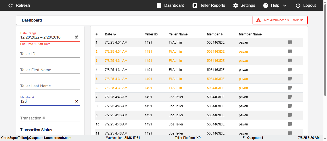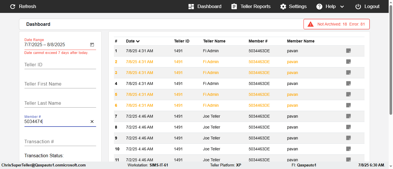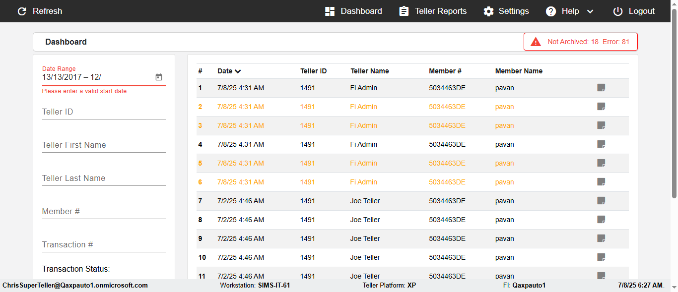 ({Description=verify Error Messages In DashBoard Page with Future From and To Date, Email=, Teller LastName=, print signatur=, errorint=2, TestID=verifyErrorMessagesInDashBoardPage, Color Transactions=, Member=5034474, UserPwd=iMM2022!, Transtatus=Archived-false;Active-true;Error-false, Receipt=, Report=, Teller=, Teller FirstName=, errorMessage=Date cannot exceed 7 days after today.;Date cannot exceed 7 days after today., Suppress=, Date=07/07/25 - 08/08/25, print Disburstments=, Print signature line=, Type=, Transaction=, Header=, Username=ChrisSuperTeller@Qaxpauto1.onmicrosoft.com, SMS=, Sign=, Scan=})