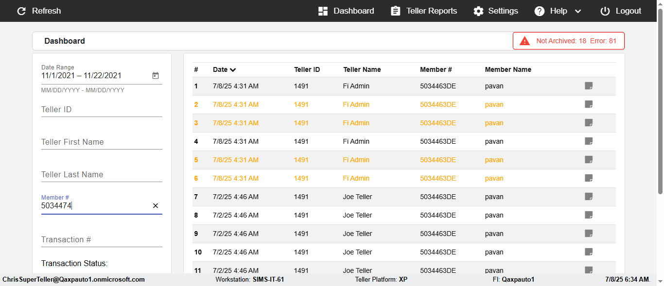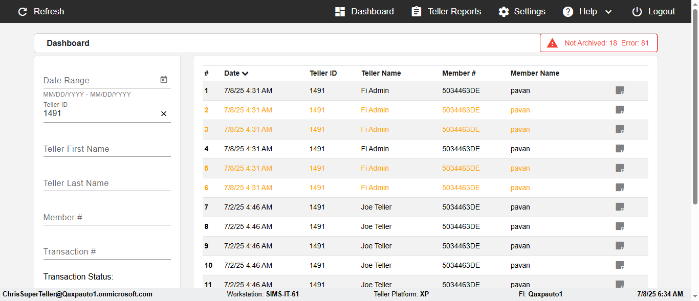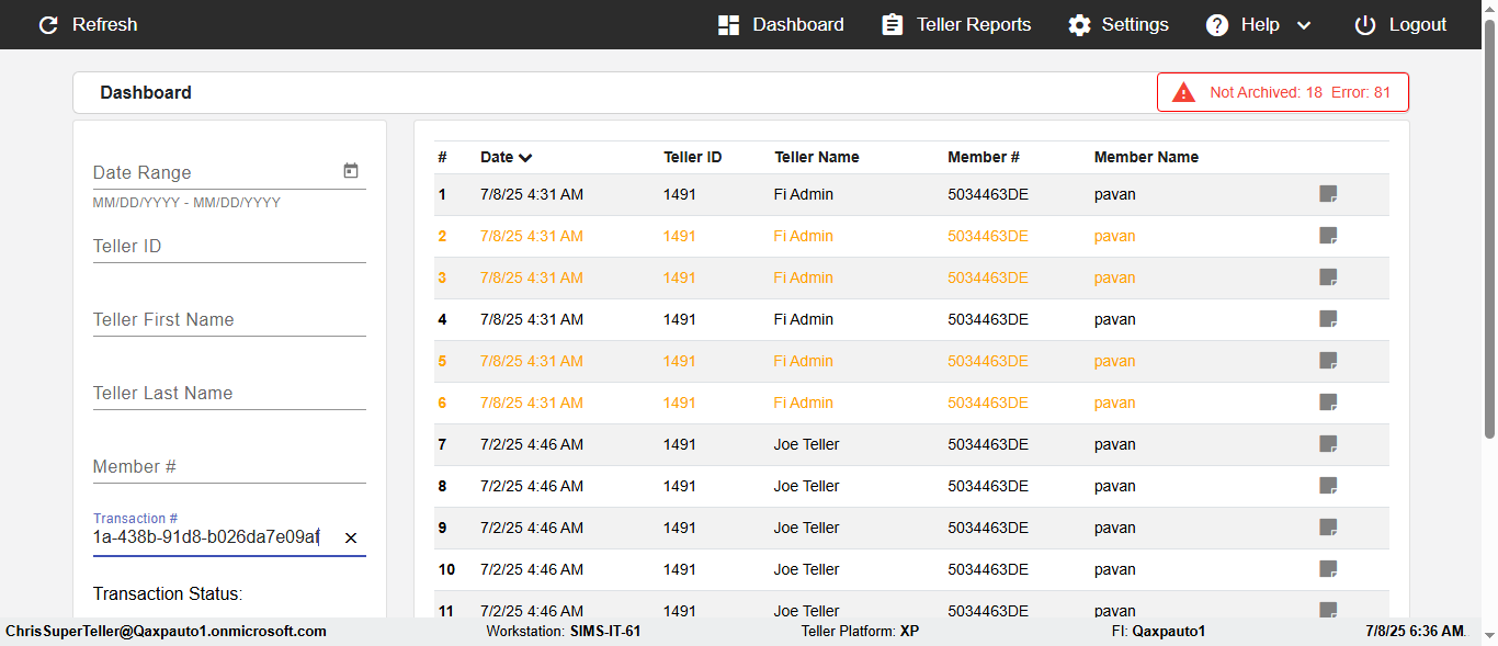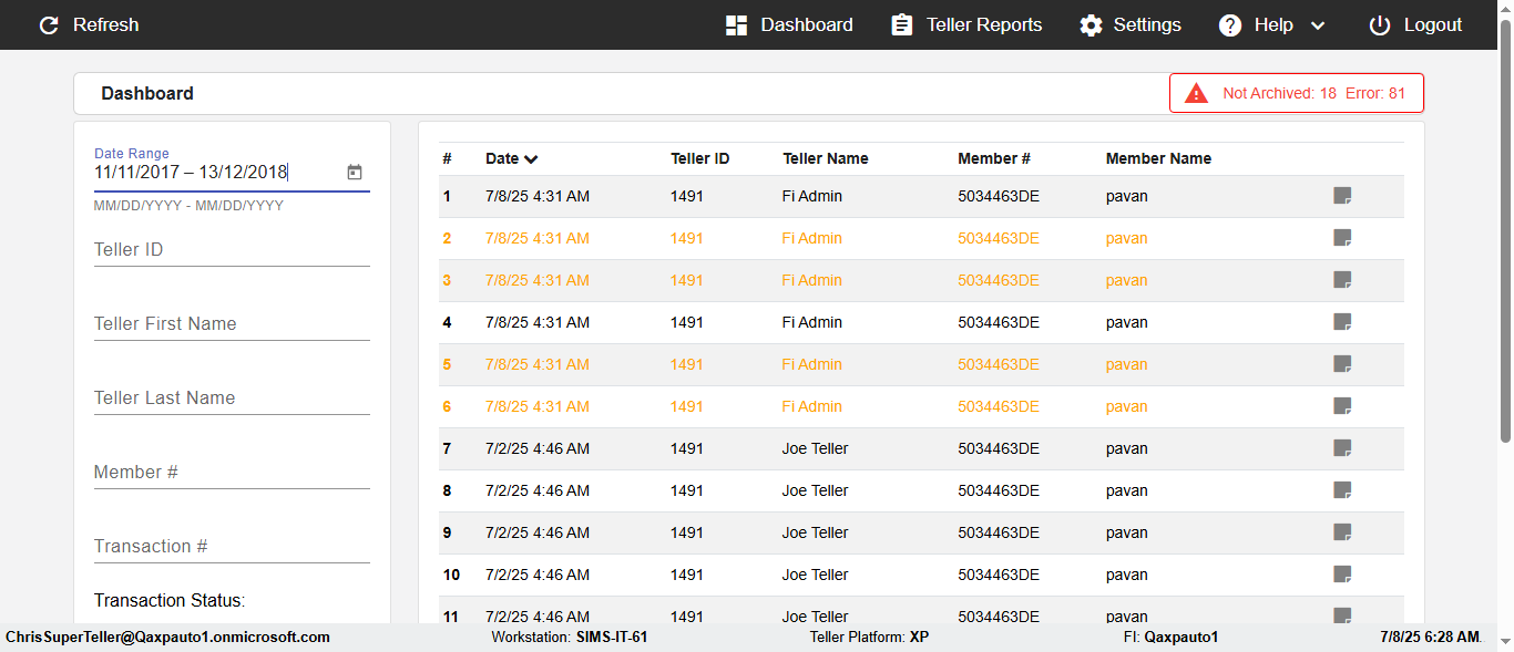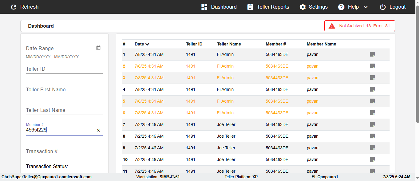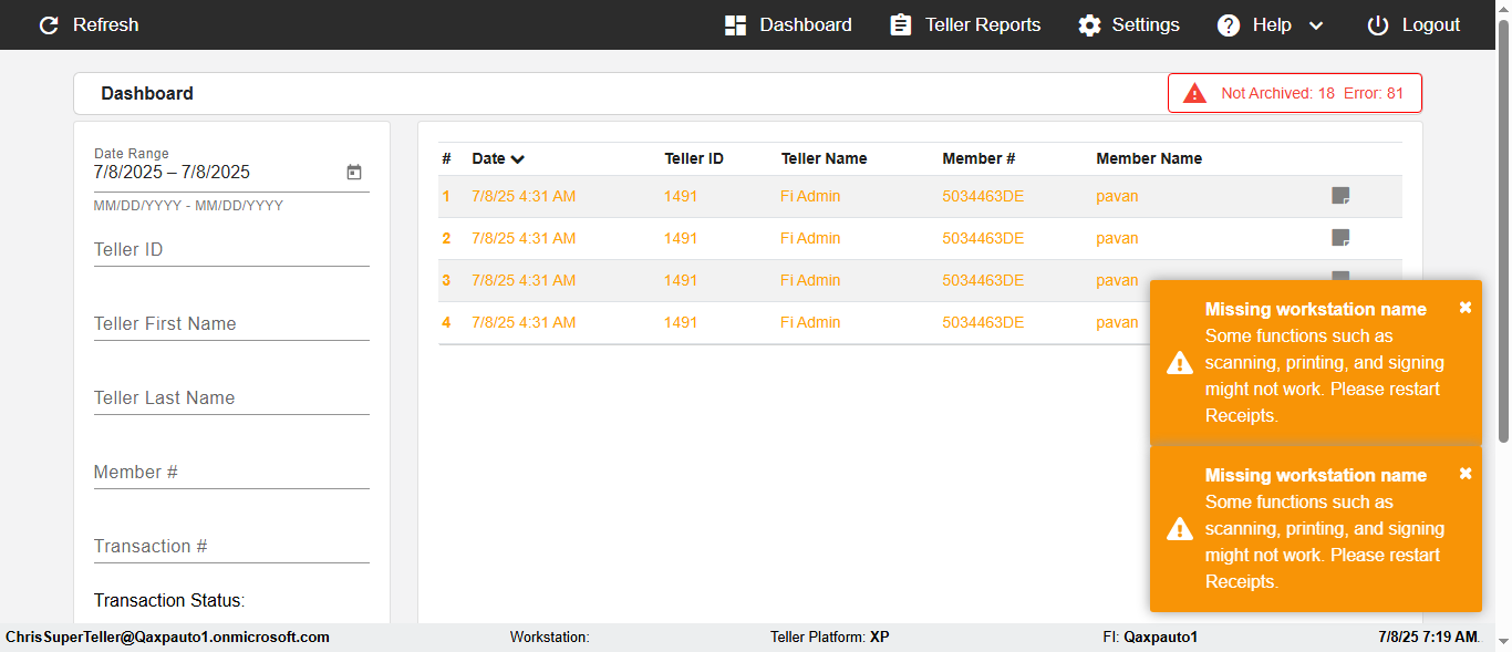 ({Description=verify Error Messages In DashBoard Page with Future From and To Date, Email=, Teller LastName=, print signatur=, errorint=2, TestID=verifyErrorMessagesInDashBoardPage, Color Transactions=, Member=5034474, UserPwd=iMM2022!, Transtatus=Archived-false;Active-true;Error-false, Receipt=, Report=, Teller=, Teller FirstName=, errorMessage=Date cannot exceed 7 days after today.;Date cannot exceed 7 days after today., Suppress=, Date=07/07/25 - 08/08/25, print Disburstments=, Print signature line=, Type=, Transaction=, Header=, Username=ChrisSuperTeller@Qaxpauto1.onmicrosoft.com, SMS=, Sign=, Scan=})