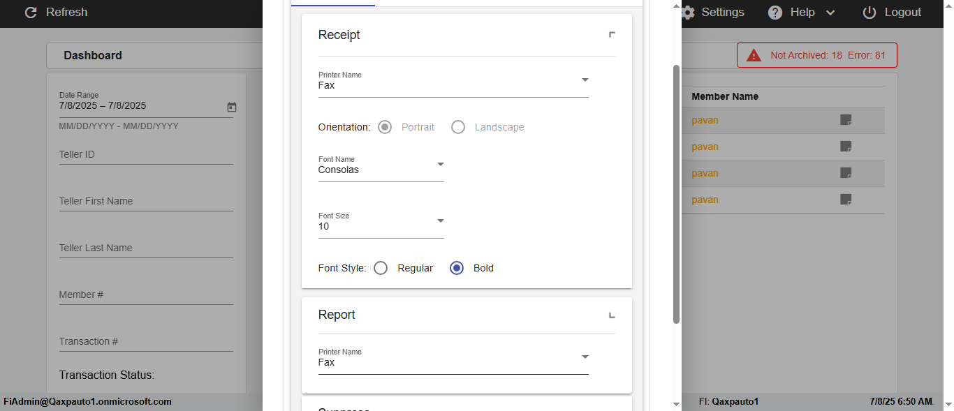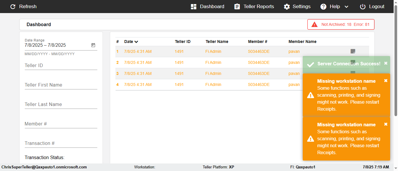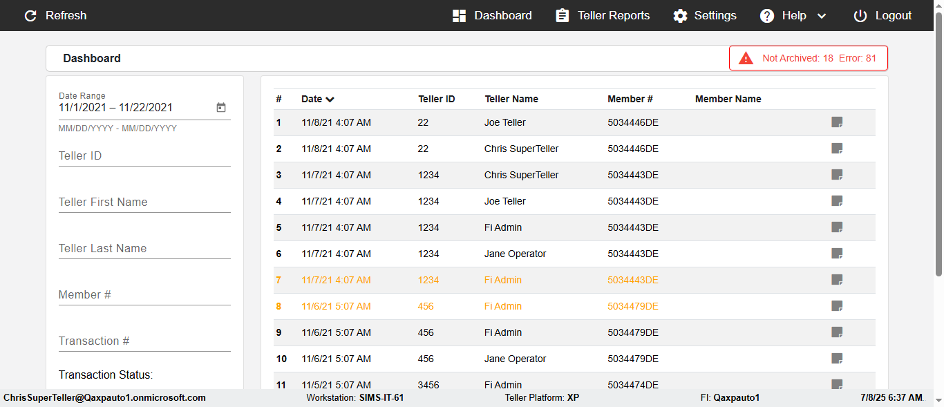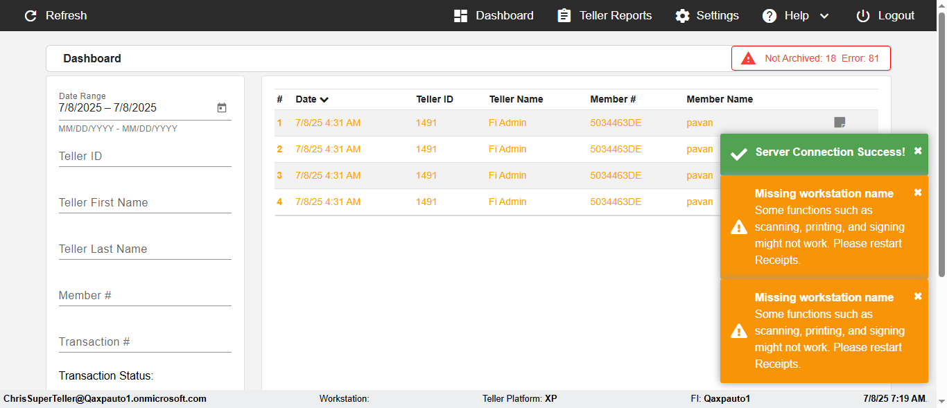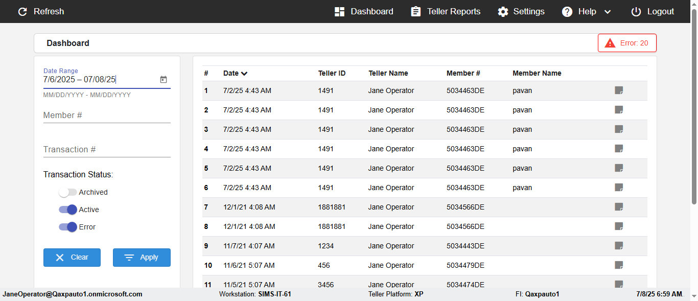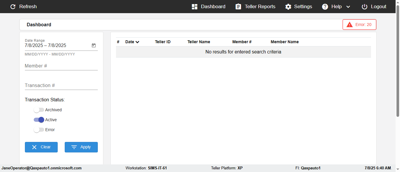 ({Description=verify Error Messages In DashBoard Page with Future From and To Date, Email=, Teller LastName=, print signatur=, errorint=2, TestID=verifyErrorMessagesInDashBoardPage, Color Transactions=, Member=5034474, UserPwd=iMM2022!, Transtatus=Archived-false;Active-true;Error-false, Receipt=, Report=, Teller=, Teller FirstName=, errorMessage=Date cannot exceed 7 days after today.;Date cannot exceed 7 days after today., Suppress=, Date=07/07/25 - 08/08/25, print Disburstments=, Print signature line=, Type=, Transaction=, Header=, Username=ChrisSuperTeller@Qaxpauto1.onmicrosoft.com, SMS=, Sign=, Scan=})