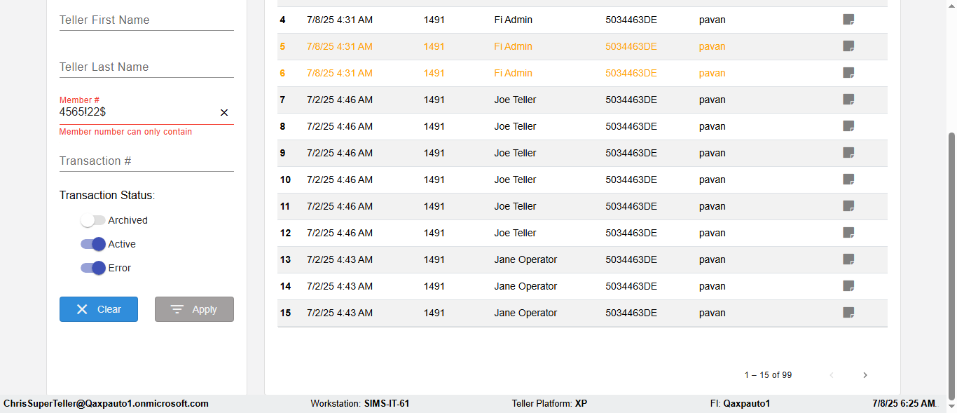 ({Description=verify Error Messages In DashBoard Page with Teller ID invalid, Email=, Teller LastName=, print signatur=, errorint=1, TestID=verifyErrorMessagesInDashBoardPage, Color Transactions=, Member=5034474, UserPwd=iMM2022!, Transtatus=Archived-false;Active-true;Error-false, Receipt=, Report=, Teller=#878%, Teller FirstName=, errorMessage=Special characters not allowed., Suppress=, Date=2, print Disburstments=, Print signature line=, Type=, Transaction=, Header=, Username=ChrisSuperTeller@Qaxpauto1.onmicrosoft.com, SMS=, Sign=, Scan=})
