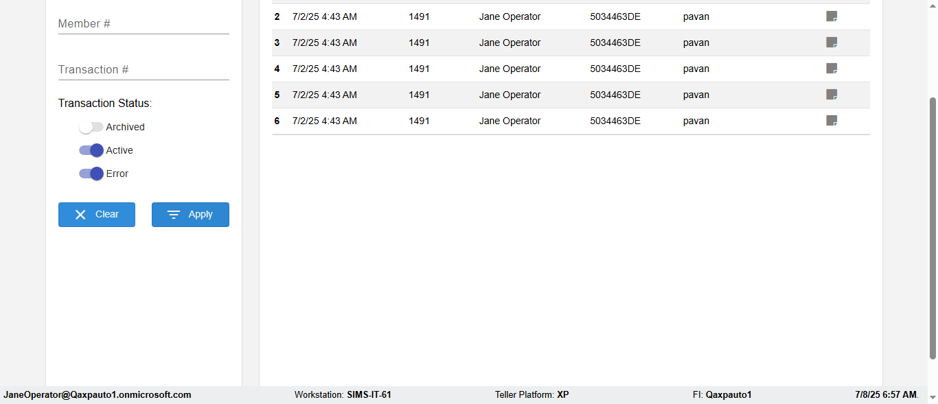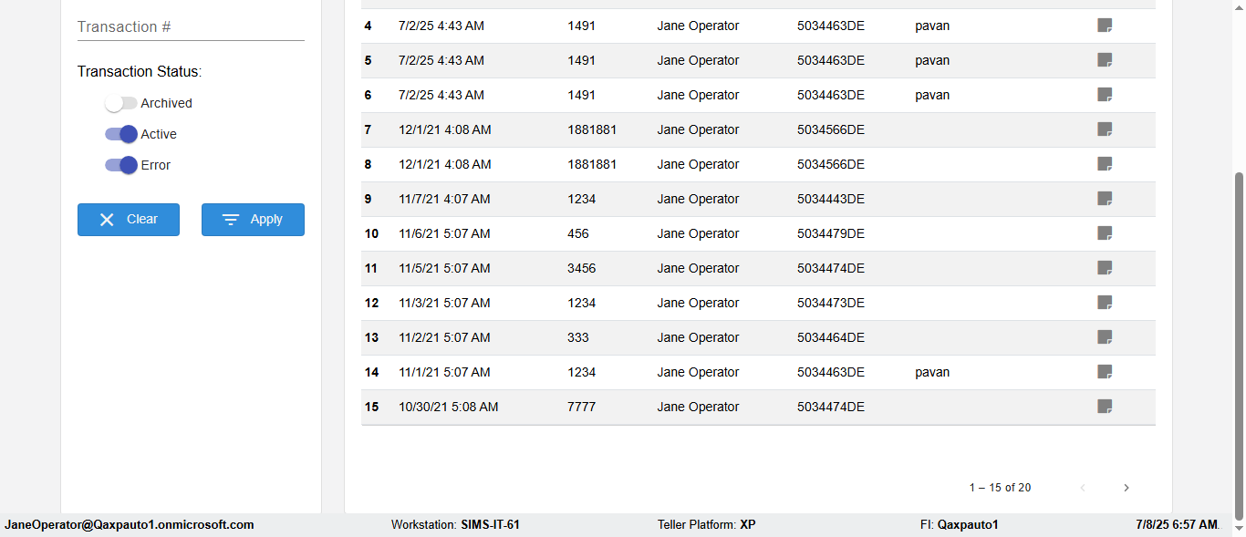 ({Description=Verify Transaction in Dashboard Page, Email=, Teller LastName=, print signatur=, errorint=, TestID=verifyFiltersInDashBoard, Color Transactions=All, Member=, UserPwd=iMM2022!, Transtatus=Archived-false;Active-true;Error-false, Receipt=, Report=, Teller=, Teller FirstName=, errorMessage=, Suppress=, Date=, print Disburstments=, Print signature line=, Type=, Transaction=2666c36b-8e1a-438b-91d8-b026da7e09af, Header=, Username=ChrisSuperTeller@Qaxpauto1.onmicrosoft.com, SMS=, Sign=, Scan=})