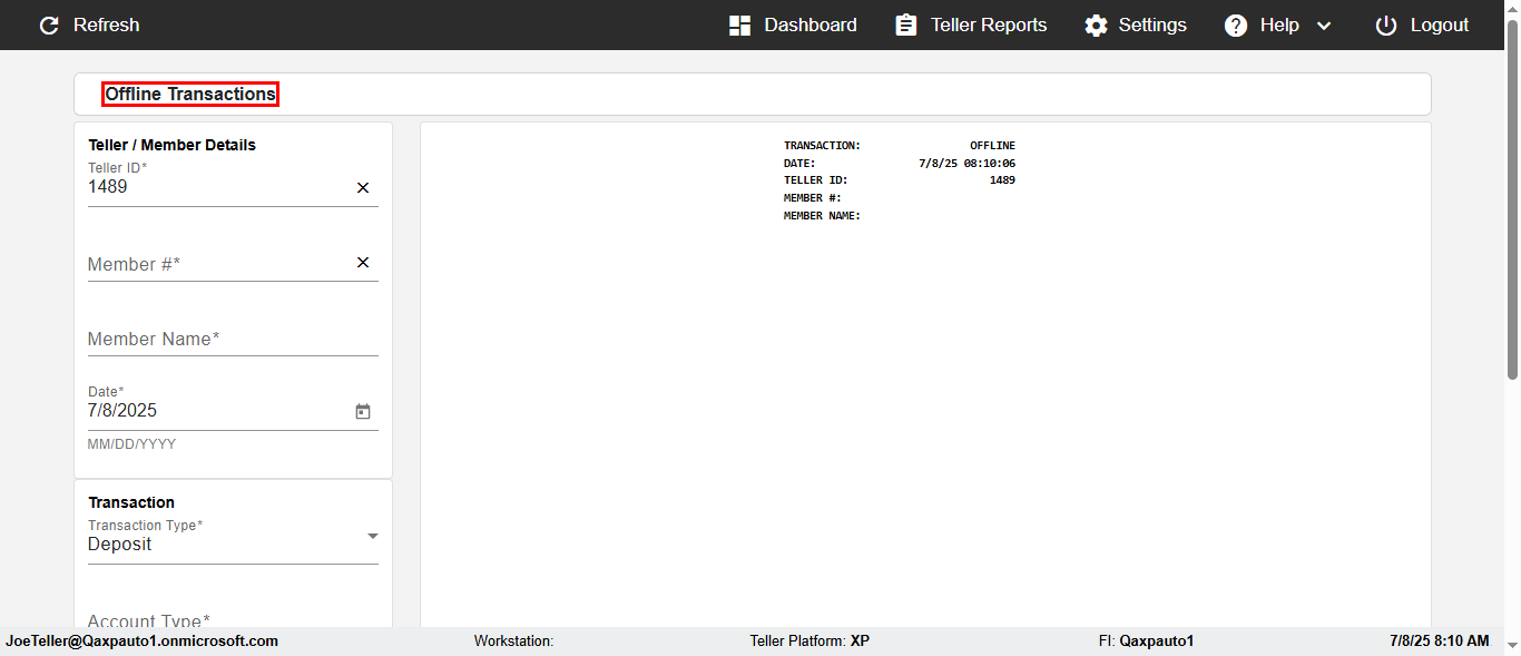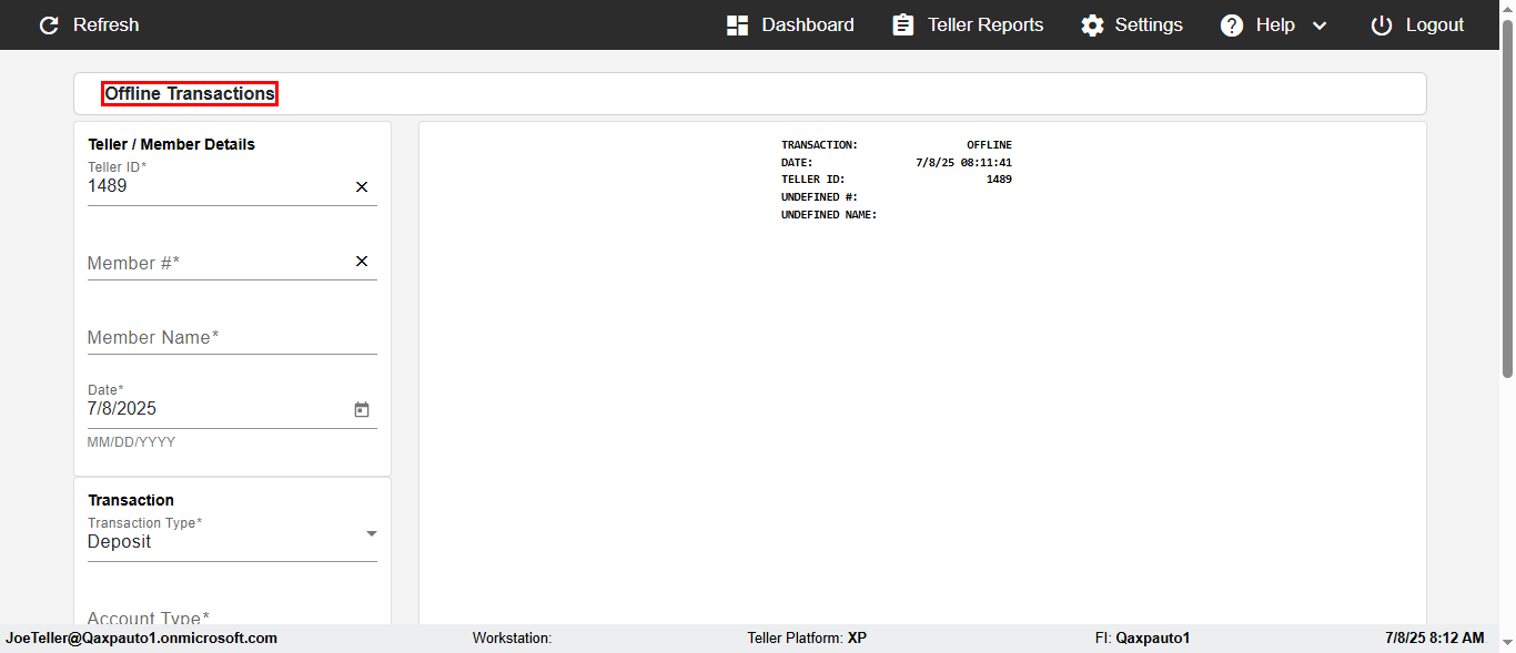 | {Description=Verify deposit in Offline Transaction demo, From Account #=1212, Teller ID=456346, To Account #=1414, Amount=222, errorMessage=, Transaction Type=Deposit, userpwd=iMM2022!, # of Checks=5, Member#=6767, Member Name=Bonita, Cash Received=4000, From Account Type=checking, Date=2, To Account Type=savings, errorint=, TestID=verifyOfflineDepositTransaction, offlineurl=/offlinereceipt/demo, Cash Disbursed=2000, Account Type=Saving, Checks Total=600, username=JoeTeller@Qaxpauto1.onmicrosoft.com} |