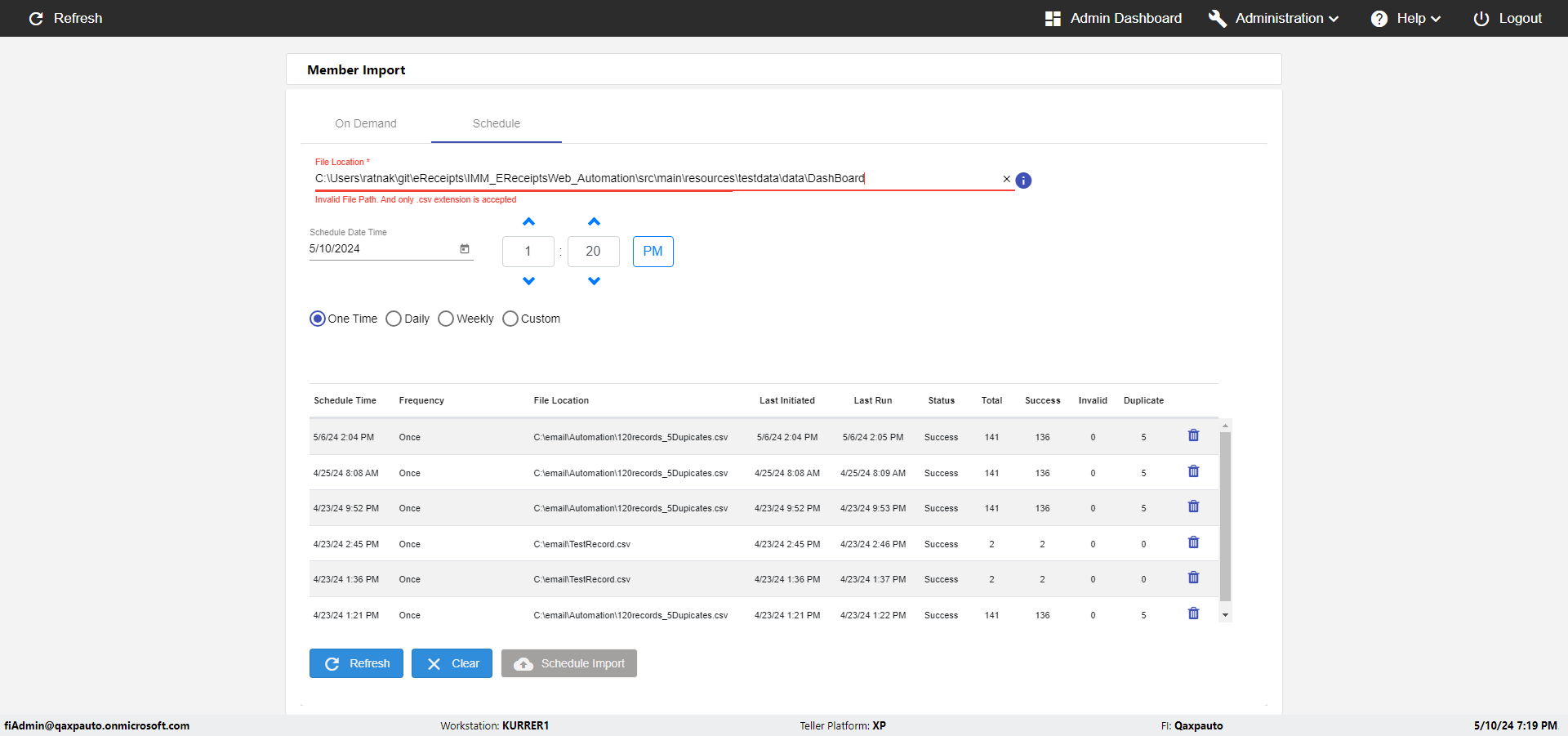 | {Archived Transactions=, Archive=, print signatur=, Name=, MultipleWorkstation=, WorkstationDeleteOption=, BranchName=, Agent=, UserPwd=iMM2022!, BranchDeleteOption=, Receipt=, Role=, Brand=, Print signature line=, TimeZone=, Header=, MappedOption=, Scan=, PortNumber=, FromWks=, FromBranch=, Description=verify Member Import 'Schedule' Page, weeks=, Operation=, Clear=, TestID=verifyMemberImportSchedulePage, Phone=, WorkstationName=, ToBranch=, ToWks=, Subscription Names=, FilePath=src/main/resources/testdata/data/DashBoard.csv, Transtatus=Archived-false;Active-true;Error-false, Report=, Index_Field_Name=, Agents=, Text=, Hold Notice=, Suppress=, SchedualType=Daily,, Date=, Platfrom=, GroupId=, print Disburstments=, SMTP=, Imaging System=, MultipleBranches=, Username=fiAdmin@Qaxpauto.onmicrosoft.com, Sign=} |