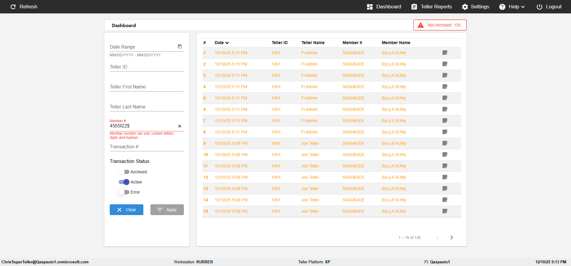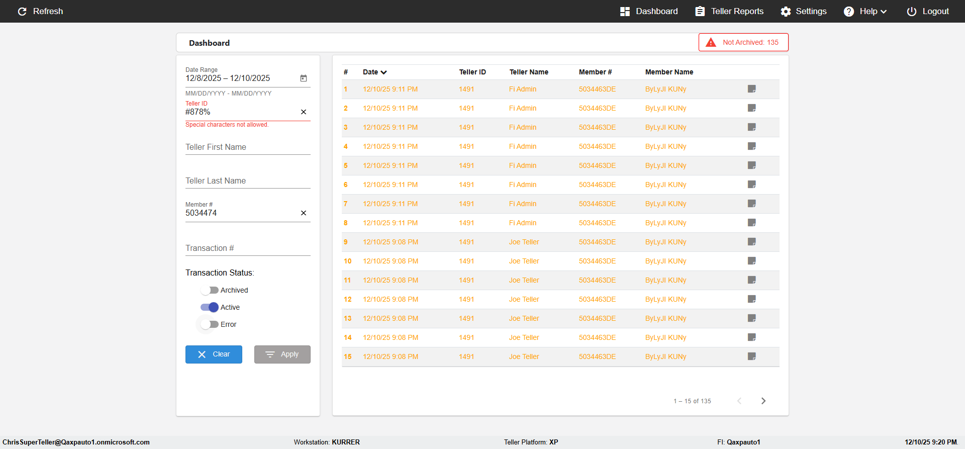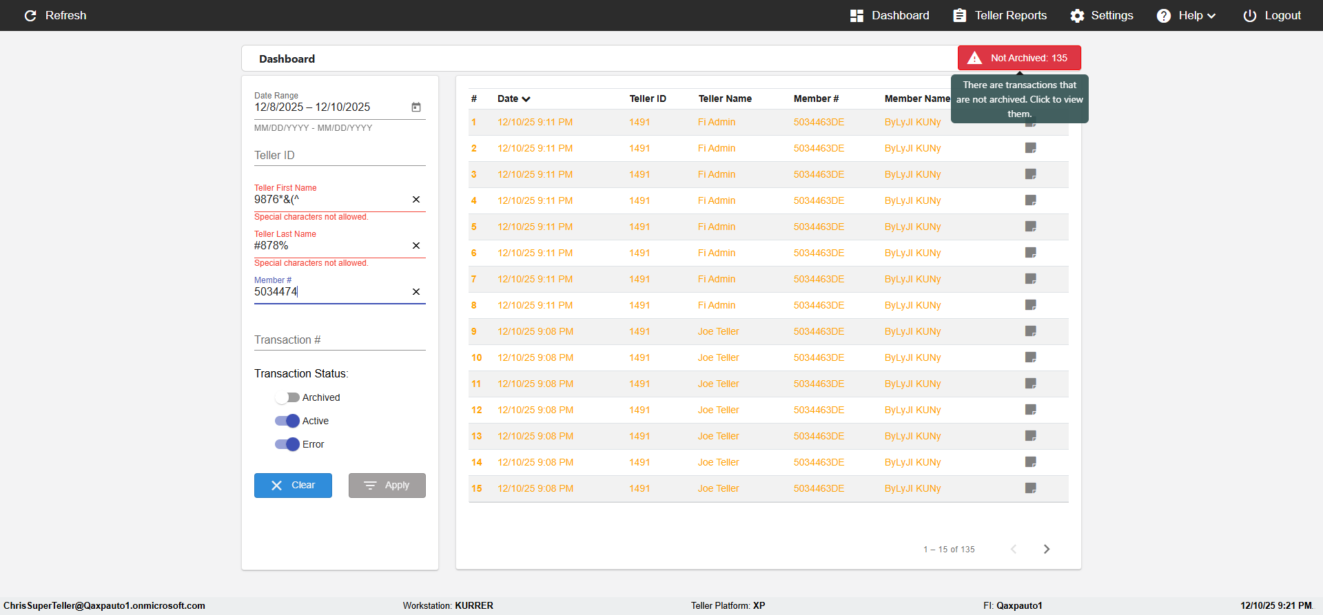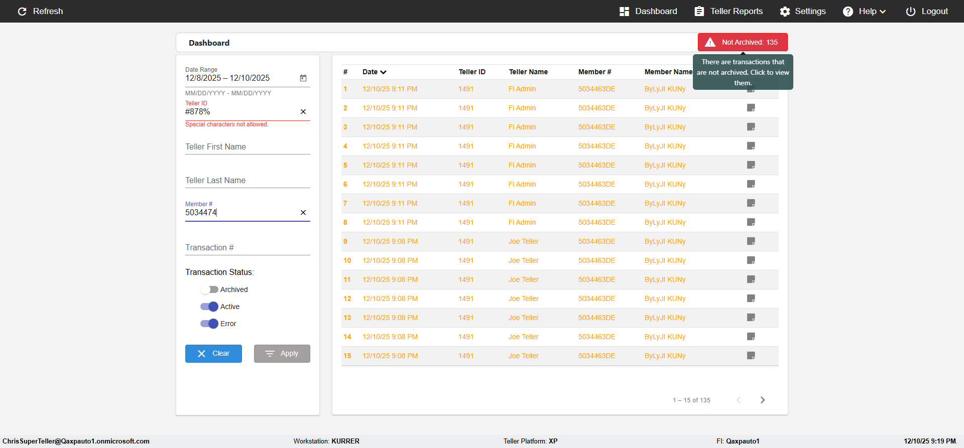 ({Description=verify Error Messages In DashBoard Page with Future From and To Date, Email=, Teller LastName=, print signatur=, errorint=2, TestID=verifyErrorMessagesInDashBoardPage, Color Transactions=, Member=5034474, UserPwd=iMM2022!, Transtatus=Archived-false;Active-true;Error-false, Receipt=, Report=, Teller=, Teller FirstName=, errorMessage=Date cannot exceed 7 days after today.;Date cannot exceed 7 days after today., Suppress=, Date=07/07/25 - 08/08/25, print Disburstments=, Print signature line=, Type=, Transaction=, Header=, Username=ChrisSuperTeller@Qaxpauto1.onmicrosoft.com, SMS=, Sign=, Scan=})