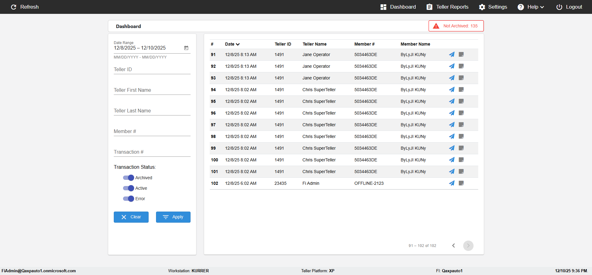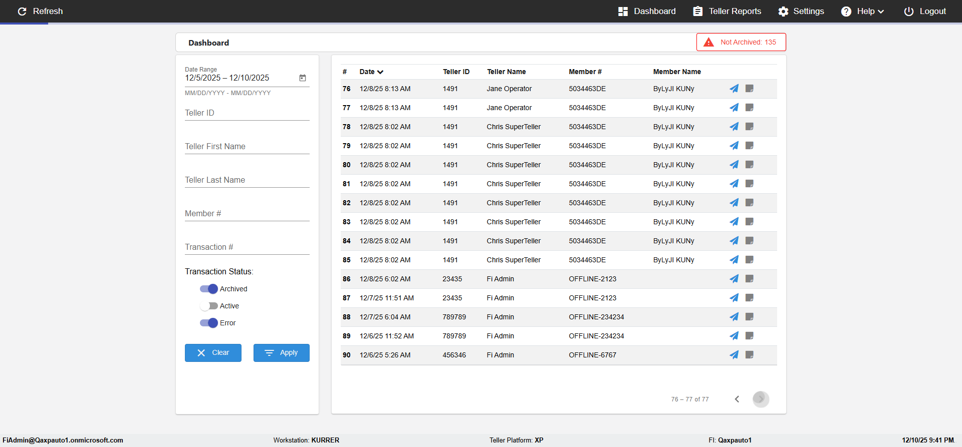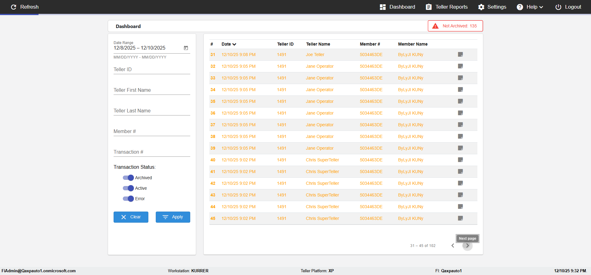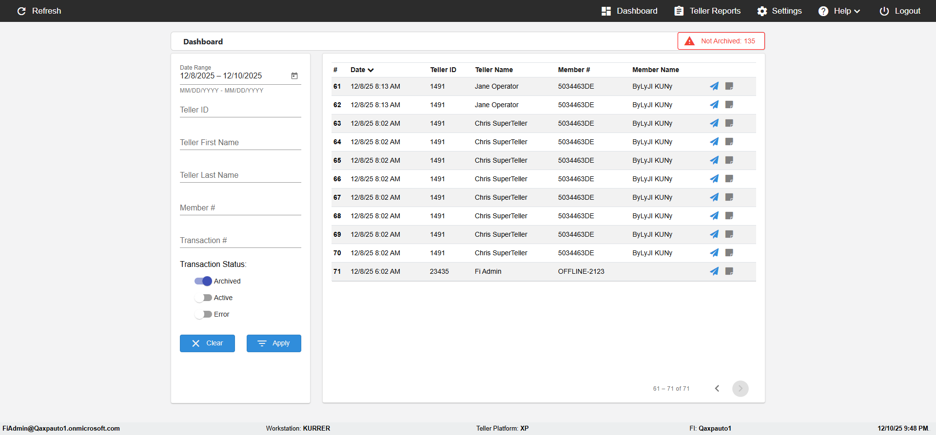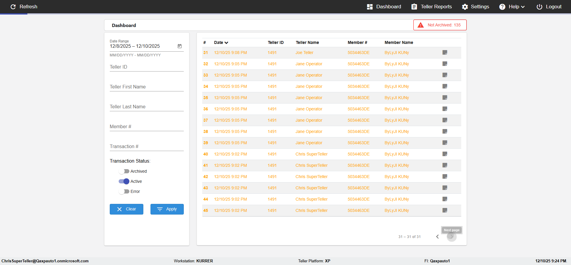 ({Description=verify Error Messages In DashBoard Page with Future From and To Date, Email=, Teller LastName=, print signatur=, errorint=2, TestID=verifyErrorMessagesInDashBoardPage, Color Transactions=, Member=5034474, UserPwd=iMM2022!, Transtatus=Archived-false;Active-true;Error-false, Receipt=, Report=, Teller=, Teller FirstName=, errorMessage=Date cannot exceed 7 days after today.;Date cannot exceed 7 days after today., Suppress=, Date=07/07/25 - 08/08/25, print Disburstments=, Print signature line=, Type=, Transaction=, Header=, Username=ChrisSuperTeller@Qaxpauto1.onmicrosoft.com, SMS=, Sign=, Scan=})
