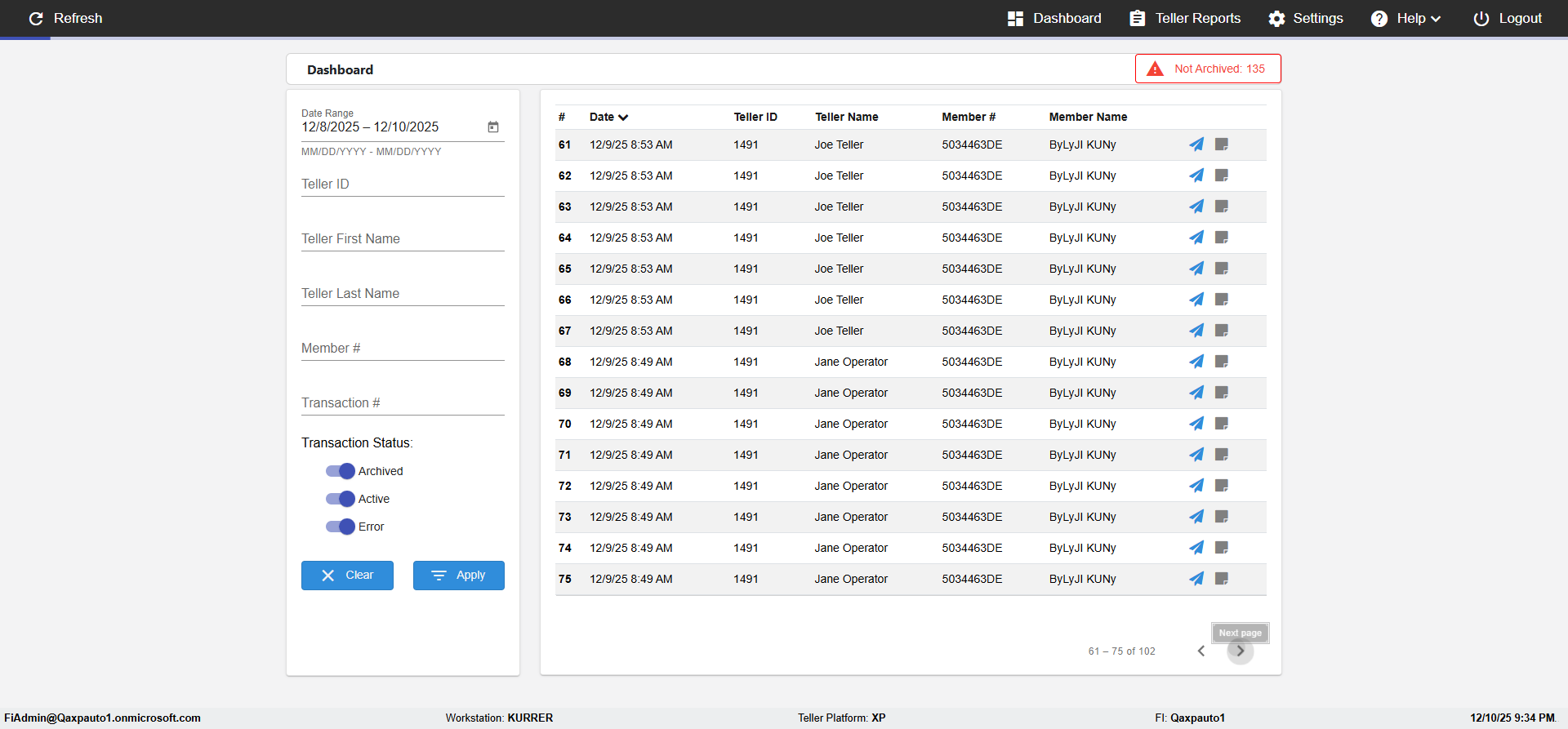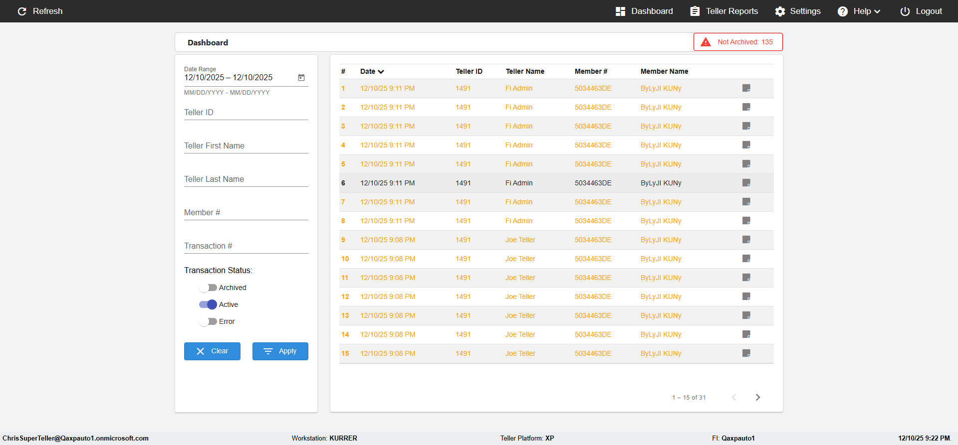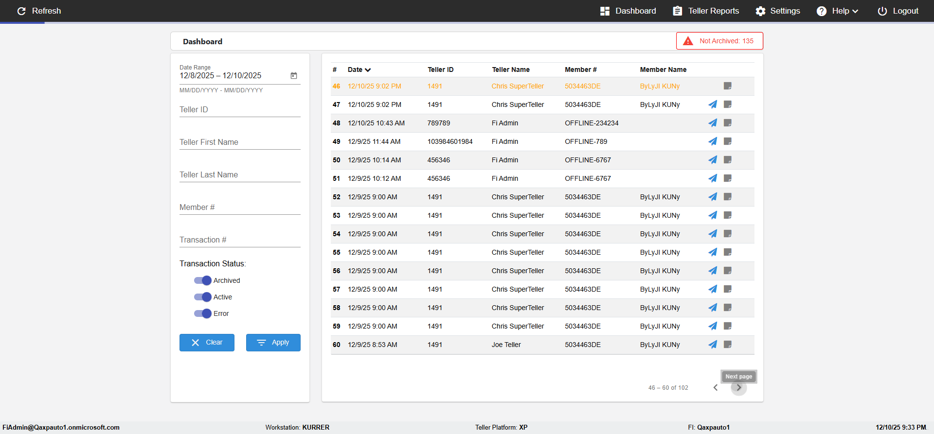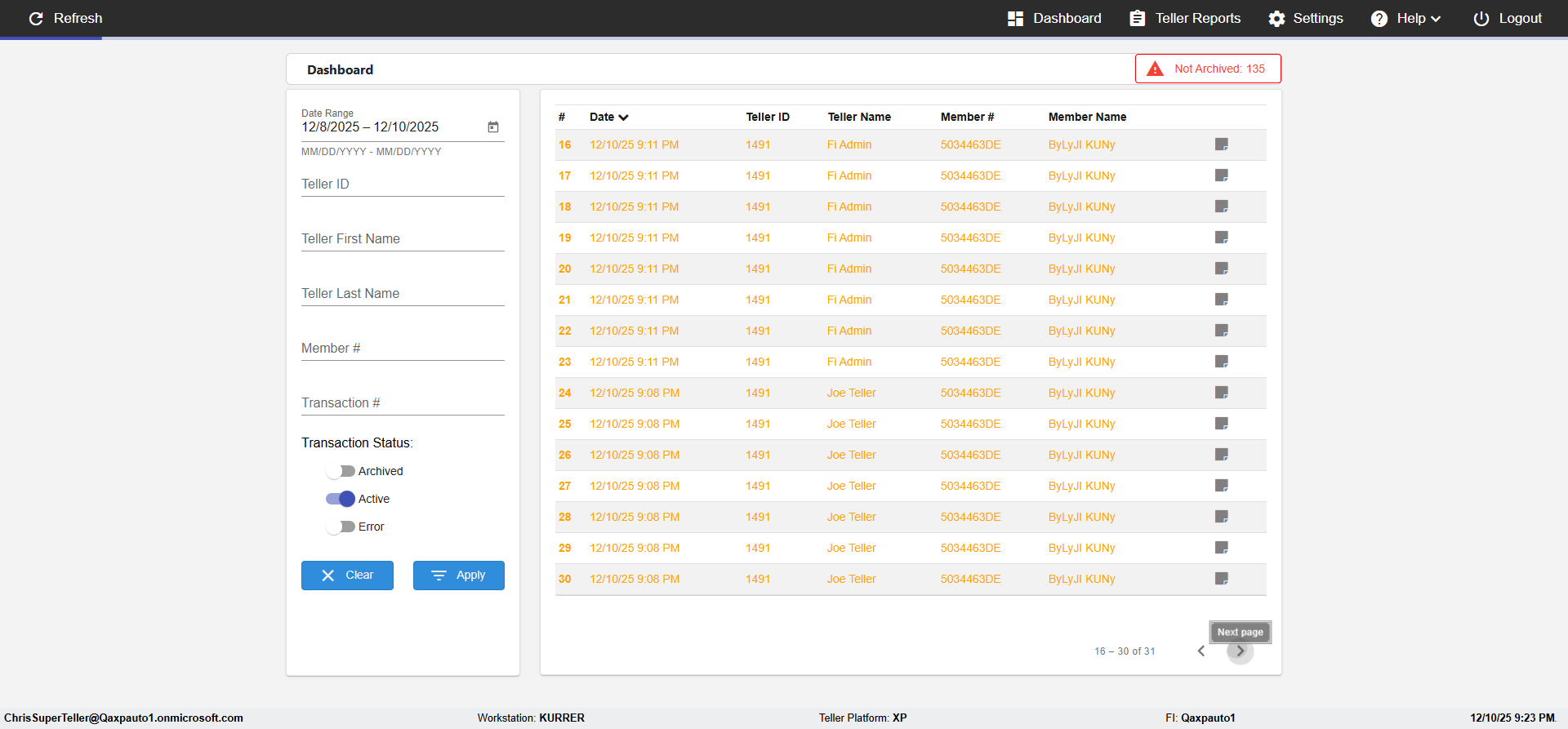 ({Description=verify Error Messages In DashBoard Page with Future From and To Date, Email=, Teller LastName=, print signatur=, errorint=2, TestID=verifyErrorMessagesInDashBoardPage, Color Transactions=, Member=5034474, UserPwd=iMM2022!, Transtatus=Archived-false;Active-true;Error-false, Receipt=, Report=, Teller=, Teller FirstName=, errorMessage=Date cannot exceed 7 days after today.;Date cannot exceed 7 days after today., Suppress=, Date=07/07/25 - 08/08/25, print Disburstments=, Print signature line=, Type=, Transaction=, Header=, Username=ChrisSuperTeller@Qaxpauto1.onmicrosoft.com, SMS=, Sign=, Scan=})