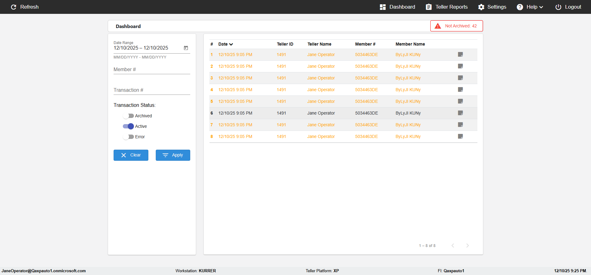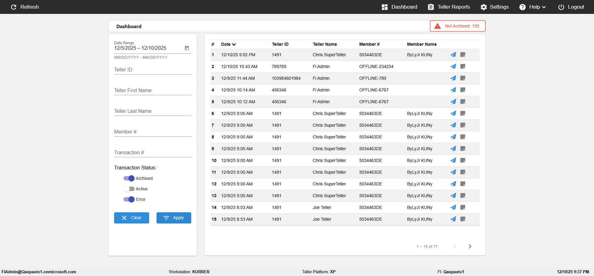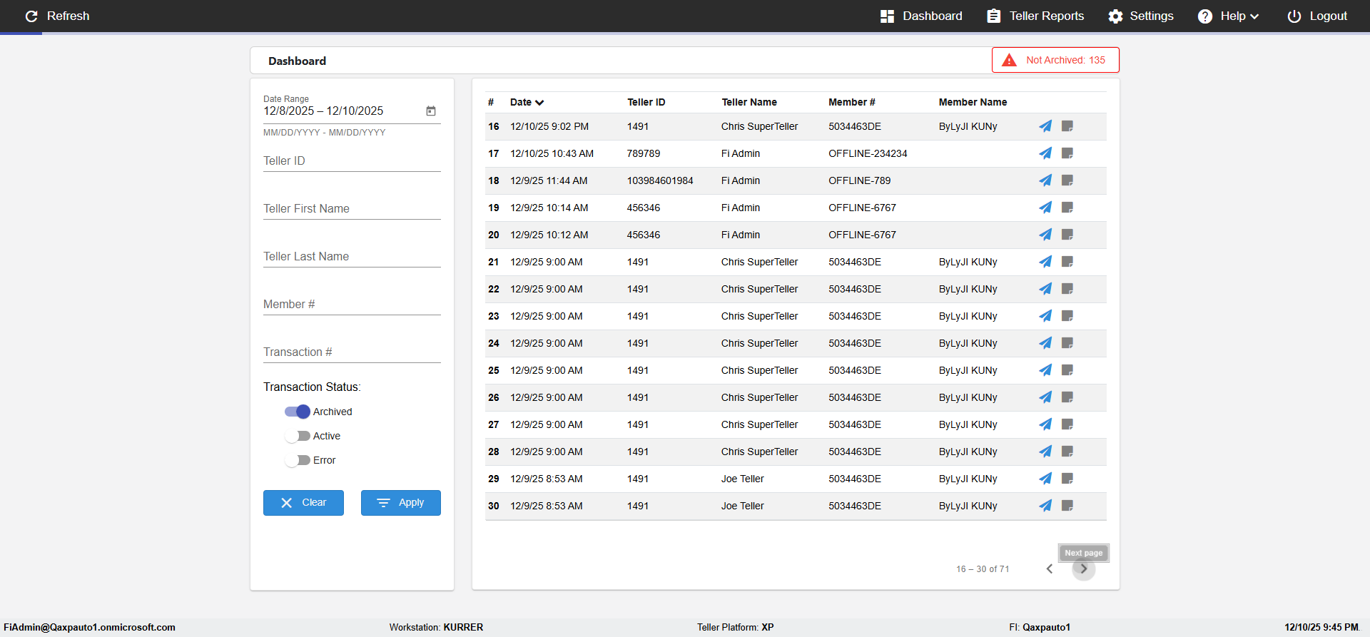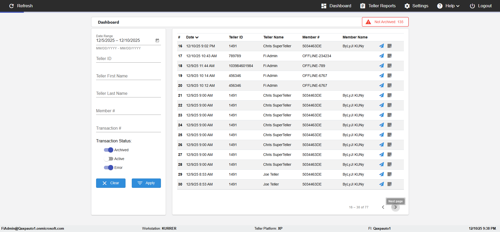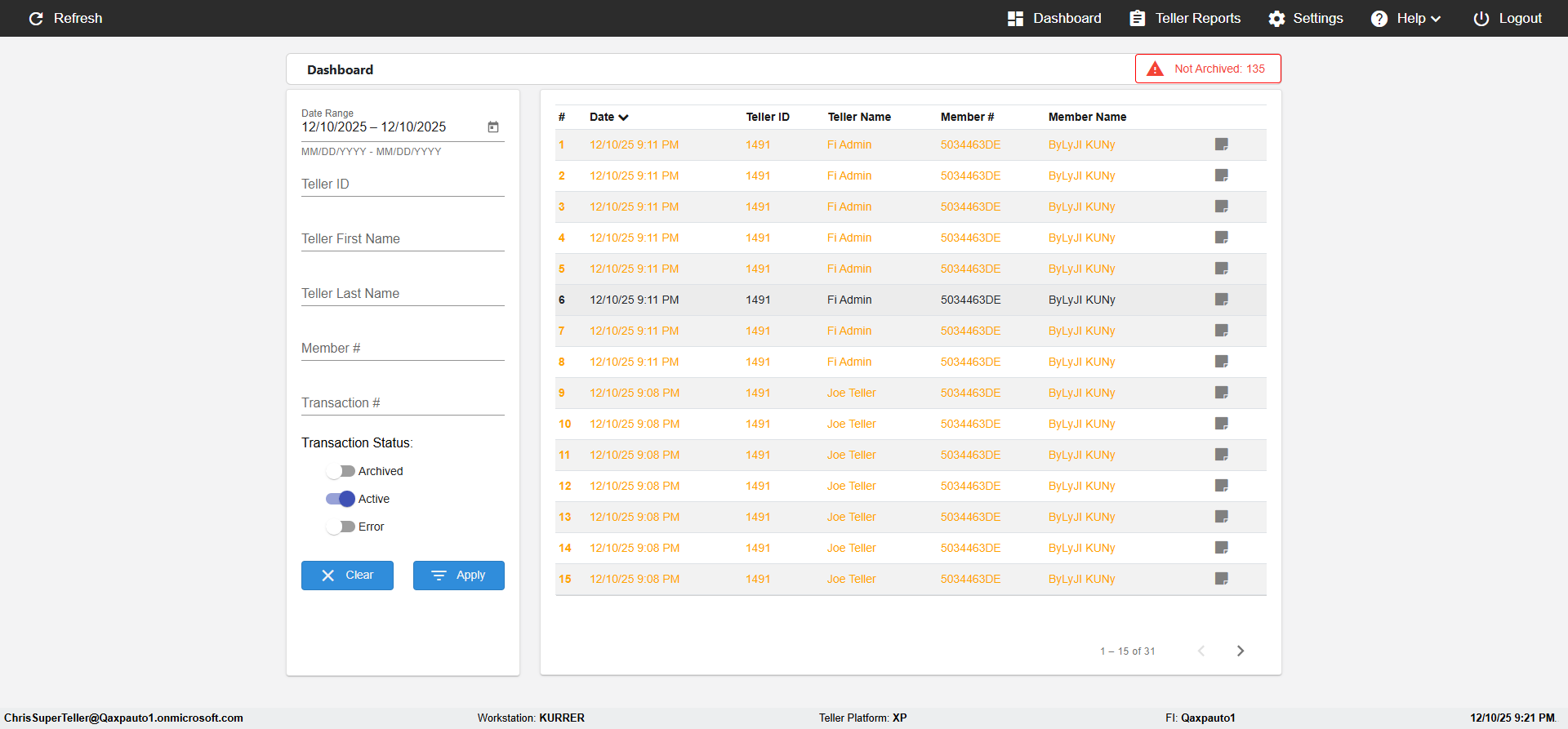({Description=verify Error Messages In DashBoard Page with Future From and To Date, Email=, Teller LastName=, print signatur=, errorint=2, TestID=verifyErrorMessagesInDashBoardPage, Color Transactions=, Member=5034474, UserPwd=iMM2022!, Transtatus=Archived-false;Active-true;Error-false, Receipt=, Report=, Teller=, Teller FirstName=, errorMessage=Date cannot exceed 7 days after today.;Date cannot exceed 7 days after today., Suppress=, Date=07/07/25 - 08/08/25, print Disburstments=, Print signature line=, Type=, Transaction=, Header=, Username=ChrisSuperTeller@Qaxpauto1.onmicrosoft.com, SMS=, Sign=, Scan=})