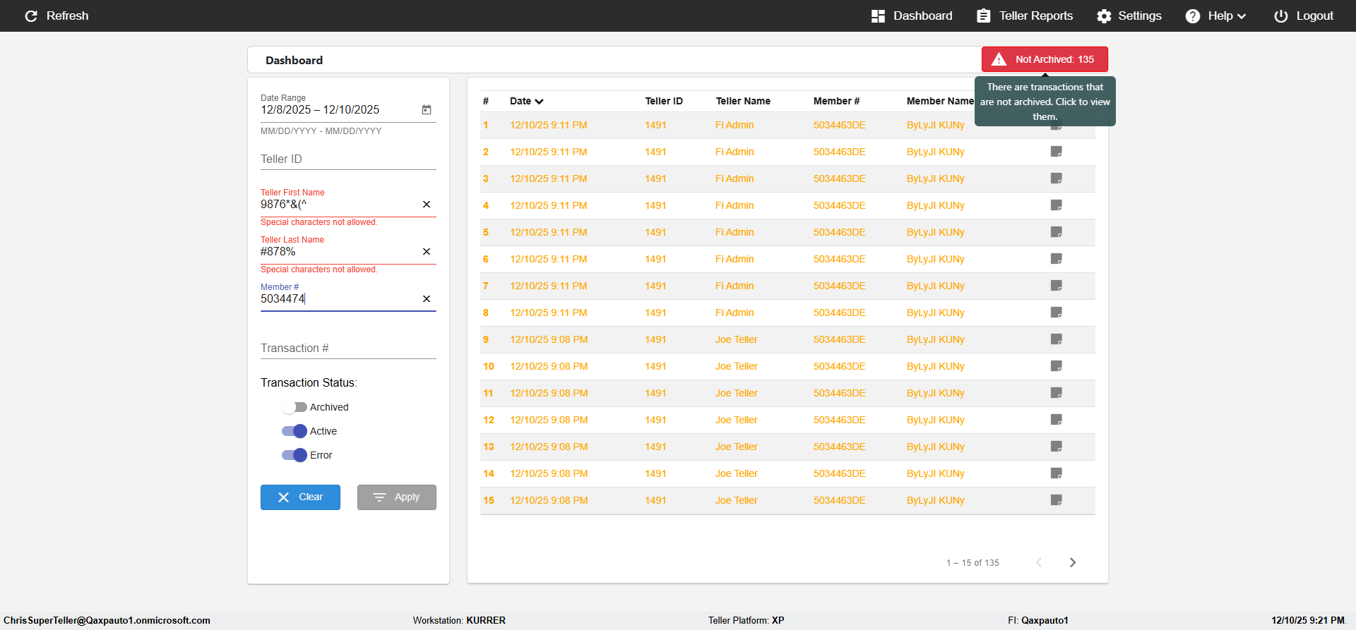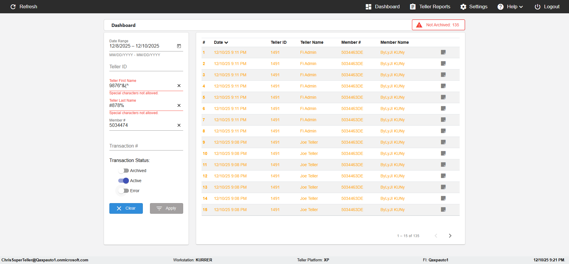 ({Description=verify Error Messages In DashBoard Page with Teller First and Last name, Email=, Teller LastName=#878%, print signatur=, errorint=2, TestID=verifyErrorMessagesInDashBoardPage, Color Transactions=, Member=5034474, UserPwd=iMM2022!, Transtatus=Archived-false;Active-true;Error-false, Receipt=, Report=, Teller=, Teller FirstName=9876*&(^, errorMessage=Special characters not allowed.;Special characters not allowed., Suppress=, Date=2, print Disburstments=, Print signature line=, Type=, Transaction=, Header=, Username=ChrisSuperTeller@Qaxpauto1.onmicrosoft.com, SMS=, Sign=, Scan=})