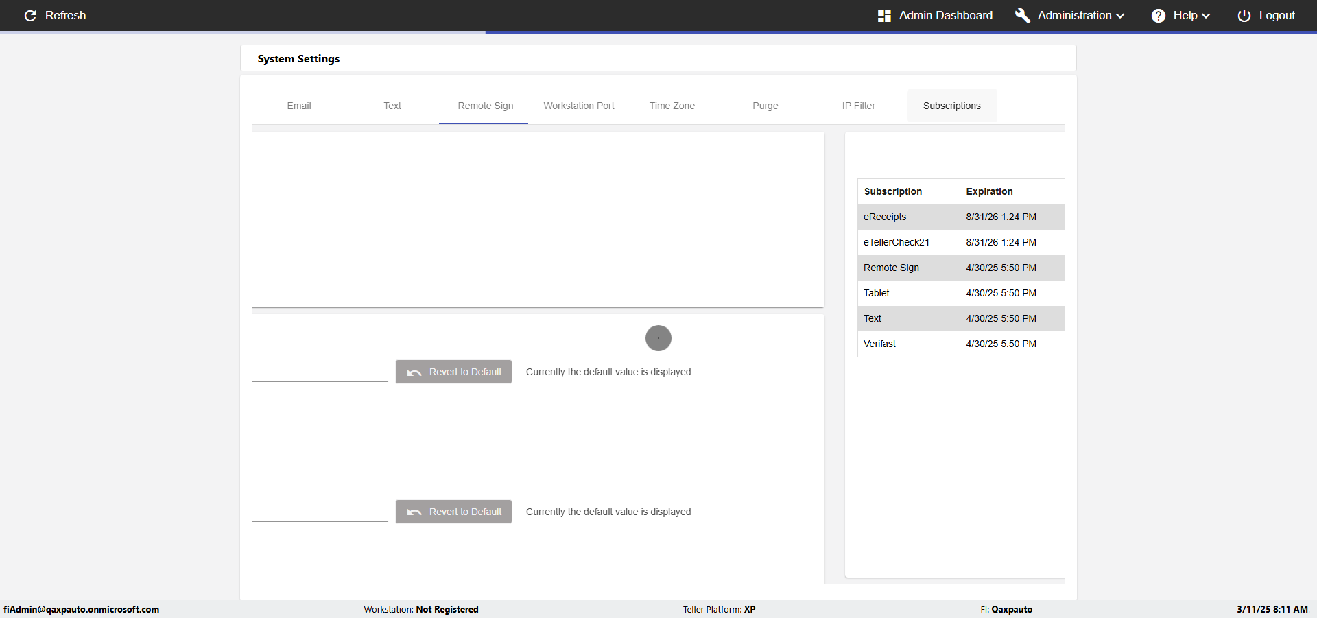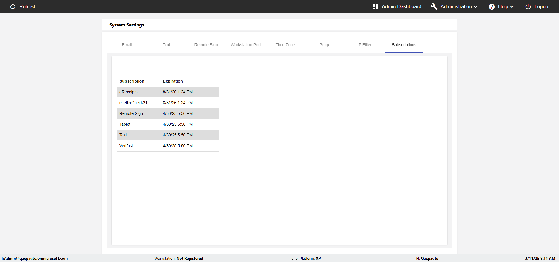 verifySubscriptionSettingsInAdminTellerPortal({Archived Transactions=no, Archive=, print signatur=, Name=, MultipleWorkstation=, WorkstationDelete...)