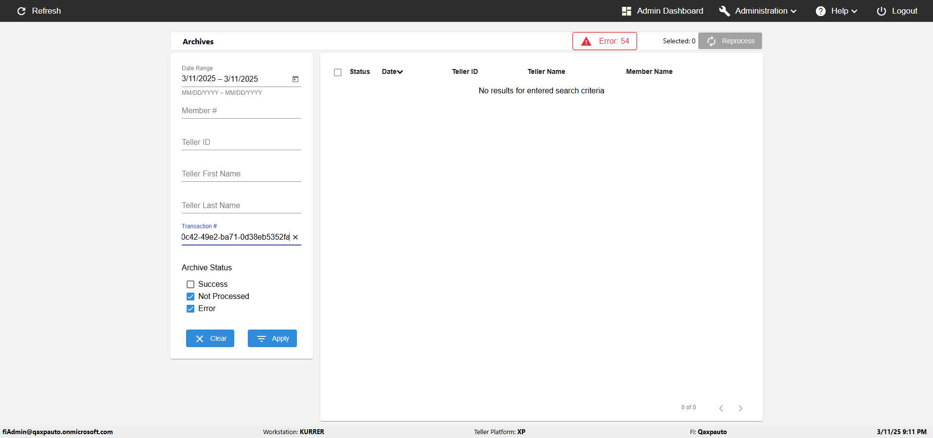 ({UserPwd=iMM2022!, Description=verify UI Elements In Archives Page with Teller,Date (Not processed should not get any data), Category=, select=, Reference=, Teller=1491, Teller FirstName=, errorMessage=, Teller LastName=, Teller Email=, Machine=, Date=5, Clear=, errorint=, TestID=verifyUIElementsInArchivesPage, Reprocess=, Transaction=, Header=, Username=fiAdmin@Qaxpauto.onmicrosoft.com, Export=, Level=, Member=, ArchiveStatus=Not Processed})