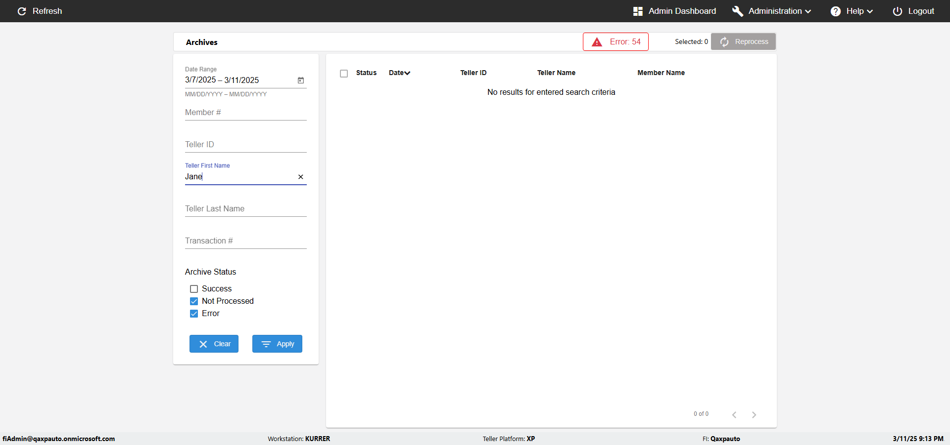 verify UI Elements In Archives Page with Teller,Date (Not processed should not get any data)