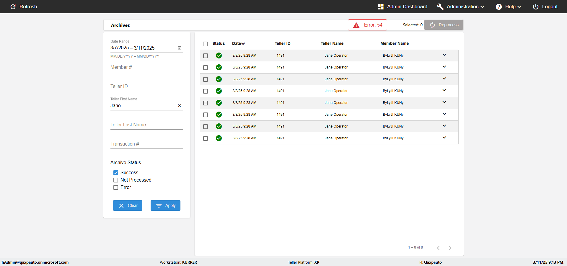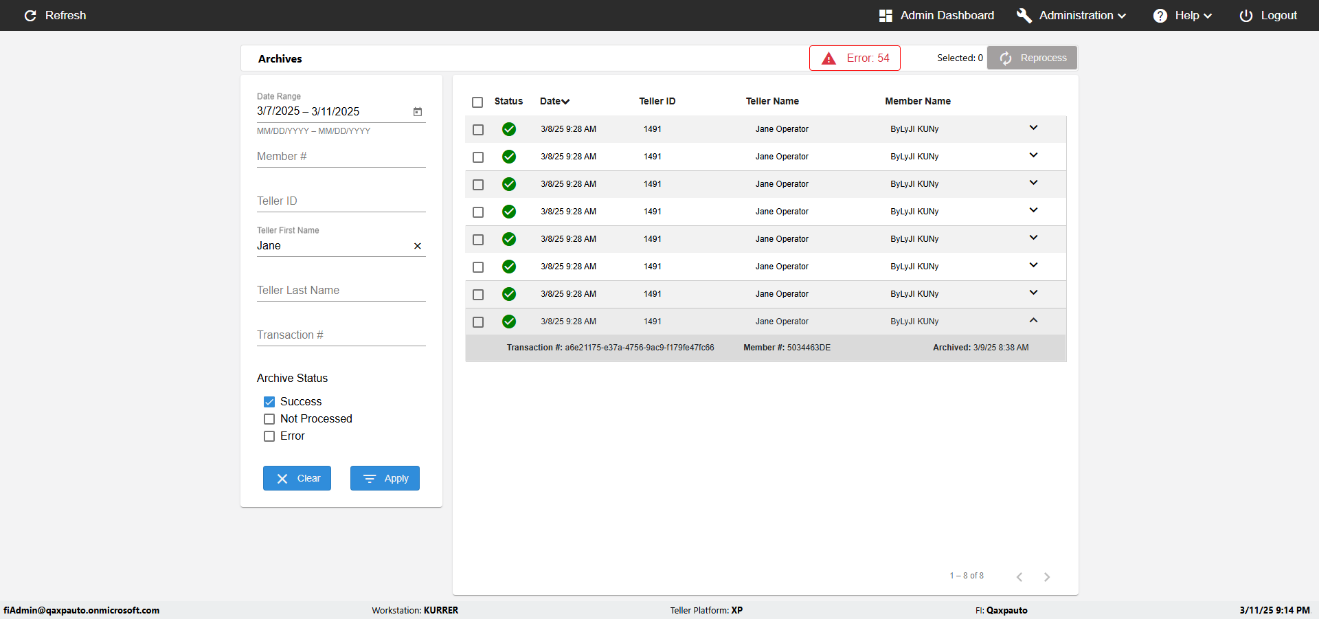 ({UserPwd=iMM2022!, Description=verify UI Elements In Archives Page with Member,Date, Category=, select=, Reference=, Teller=, Teller FirstName=, errorMessage=, Teller LastName=, Teller Email=, Machine=, Date=2, Clear=, errorint=, TestID=verifyUIElementsInArchivesPage, Reprocess=, Transaction=, Header=, Username=fiAdmin@Qaxpauto.onmicrosoft.com, Export=, Level=, Member=5034463DE, ArchiveStatus=Success})