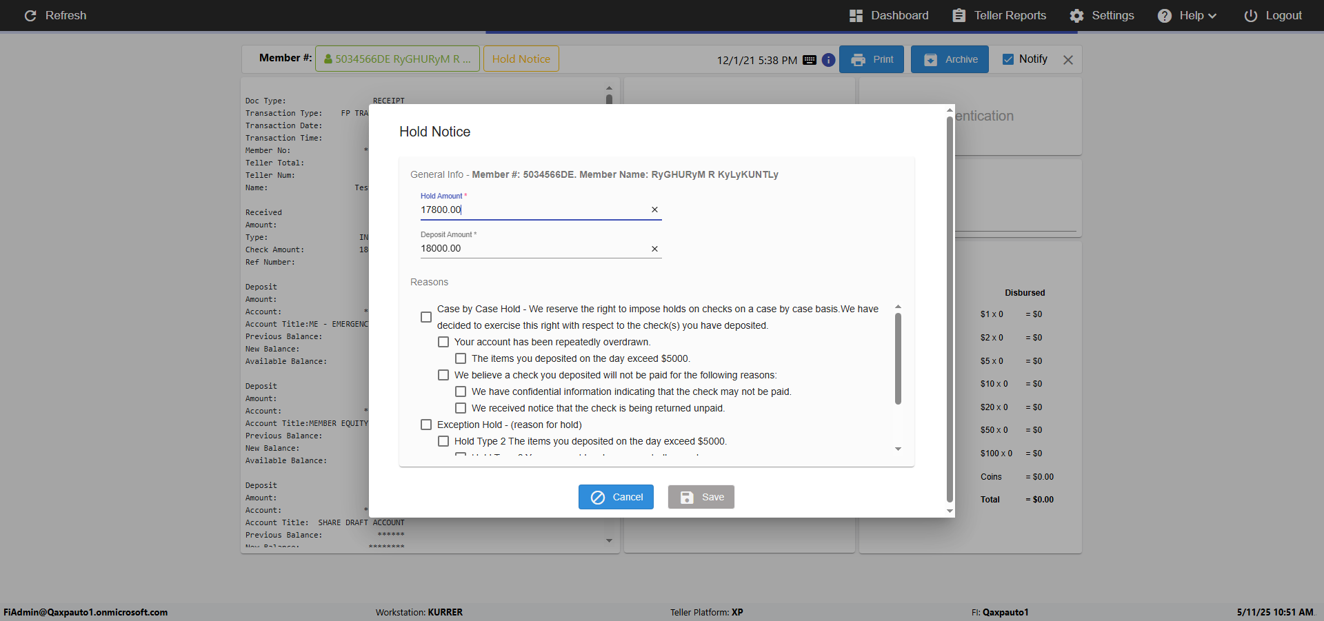 ({Toggel=, Archived Transactions=no, Description=verify Hold Notice should not pop for non hold notice transactions even when hold notice is enabled, Email=, Archive=, Document Type=, Notify=, SignatureTab=, DisbursedExpression=, Operation=, Teller LastName=, Disbursed cash=, errorint=, TestID=verifyHoldNoticeWarningWithoutReasons, Print=, DisbursedExpressionValue=, Phone=, ReceivedCashValue=, Member=5034463, UserPwd=iMM2022!, Transtatus=Archived-false;Active-true;Error-false, Docment ID=, Teller=, Teller FirstName=, errorMessage=, ReceivedExpressionValue=, SecondName=, Date=, Platfrom=Enable Hold Notice-true; Hold Notice Warning-true;, Received cash=, Transaction=, Header=, Expression=, Username=fiAdmin@Qaxpauto1.onmicrosoft.com, DisbursedCashValue=, FullName=, ReceivedExpression=, SMS=, Memo=})