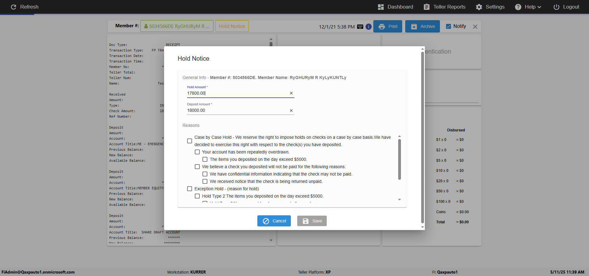 ({Toggel=, Archived Transactions=no, Description=verify Hold Notice Warning Message displayed when warning is enabled, Email=, Archive=, Document Type=, Notify=, SignatureTab=, DisbursedExpression=, Operation=, Teller LastName=, Disbursed cash=, errorint=, TestID=verifyHoldNoticeWarningWithoutReasons, Print=, DisbursedExpressionValue=, Phone=, ReceivedCashValue=, Member=5034566, UserPwd=iMM2022!, Transtatus=Archived-false;Active-true;Error-false, Docment ID=, Teller=1881881, Teller FirstName=, errorMessage=, ReceivedExpressionValue=, SecondName=, Date=, Platfrom=Enable Hold Notice-true; Hold Notice Warning-true;, Received cash=, Transaction=, Header=, Expression=, Username=fiAdmin@Qaxpauto1.onmicrosoft.com, DisbursedCashValue=, FullName=, ReceivedExpression=, SMS=, Memo=})