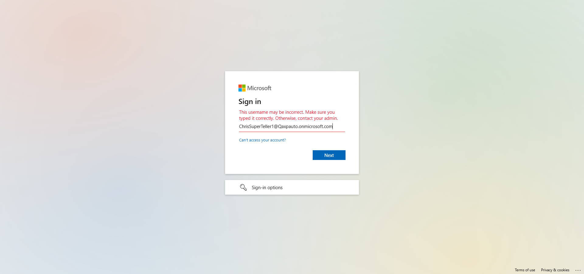 --- 11 May 12:43:44 803 - Element is displayed:: [[RemoteWebDriver: chrome on Windows 10 (c0df6996b5d62142baf4f40ad6ce4507)] -> xpath: //input[@id='i0116']]