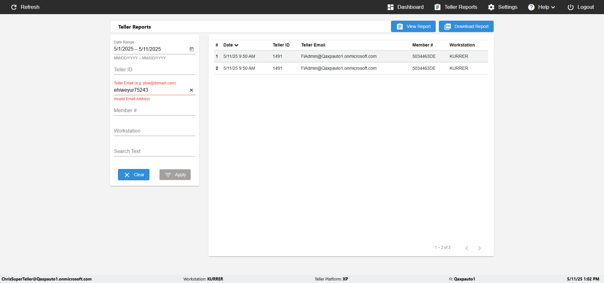({UserPwd=iMM2022!, Description=verify Error Messages in Report Page for Email, Teller ID=, errorMessage=Invalid Email Address, Teller Email=ehiweyur75243, View=, Date=10, Clear=, Workstation=, errorint=1, TestID=verifyErrorMessagesInReports, Transaction=, Header=, Username=ChrisSuperTeller@Qaxpauto1.onmicrosoft.com, Export=, Member #=, Search Text=, Level=})