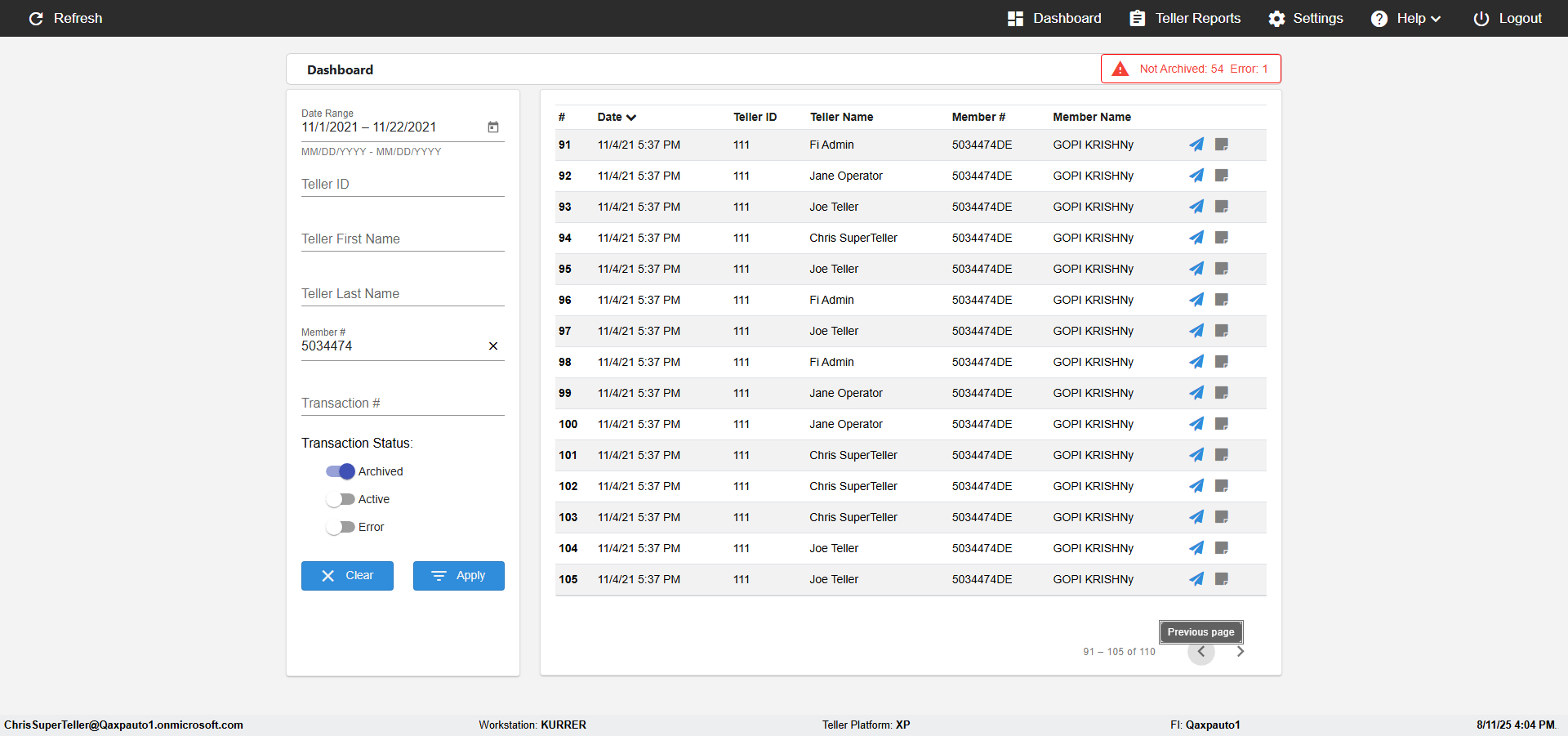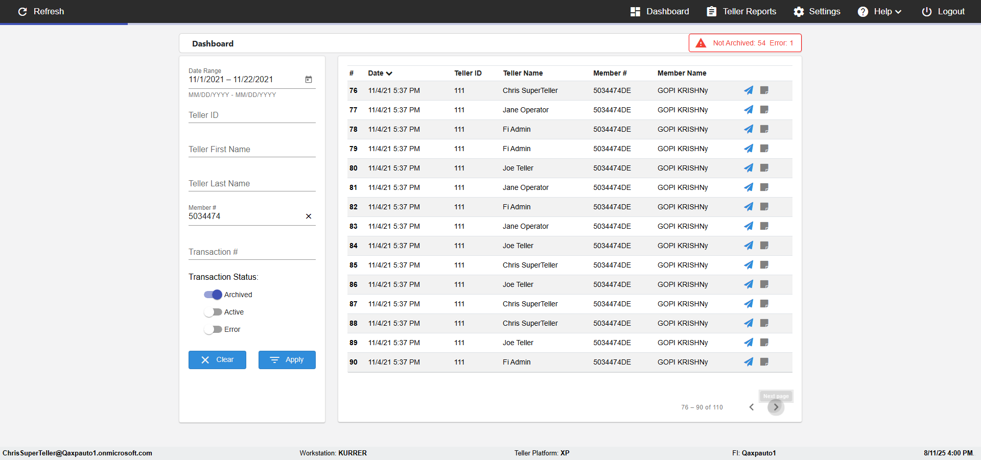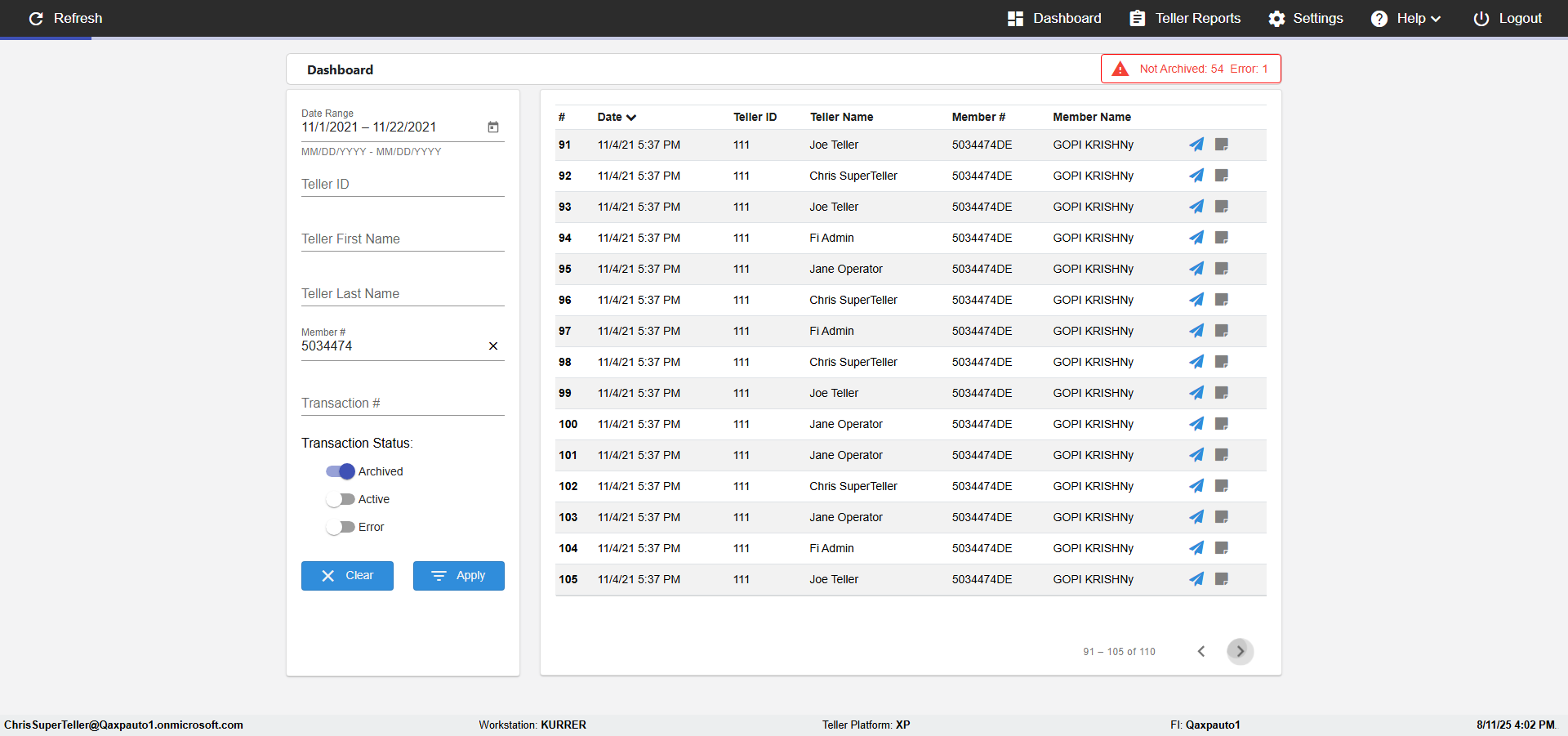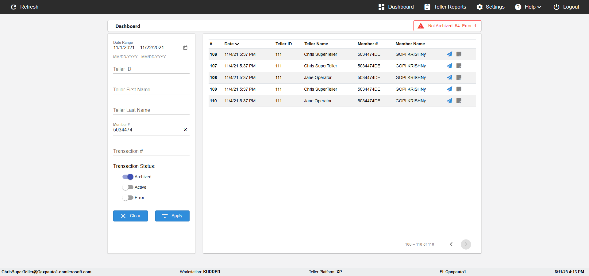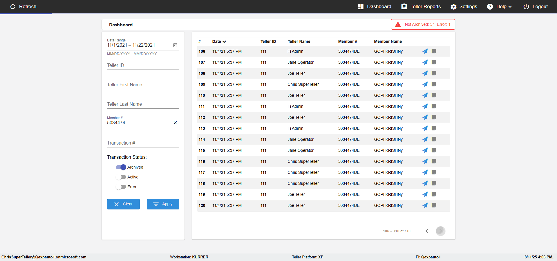 | {Description=verify UI Elemnts In DashBoard with Member, Email=, Teller LastName=, print signatur=, errorint=, TestID=verifyFiltersInDashBoard, Color Transactions=no, Member=5034474, UserPwd=iMM2022!, Transtatus=Archived-True;Active-False;Error-false, Receipt=, Report=, Teller=, Teller FirstName=, errorMessage=, Suppress=, Date=11/01/2021 - 11/22/2021, print Disburstments=, Print signature line=, Type=, Transaction=, Header=, Username=ChrisSuperTeller@Qaxpauto1.onmicrosoft.com, SMS=, Sign=, Scan=} |