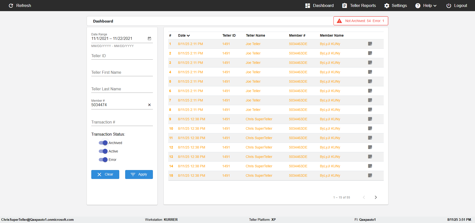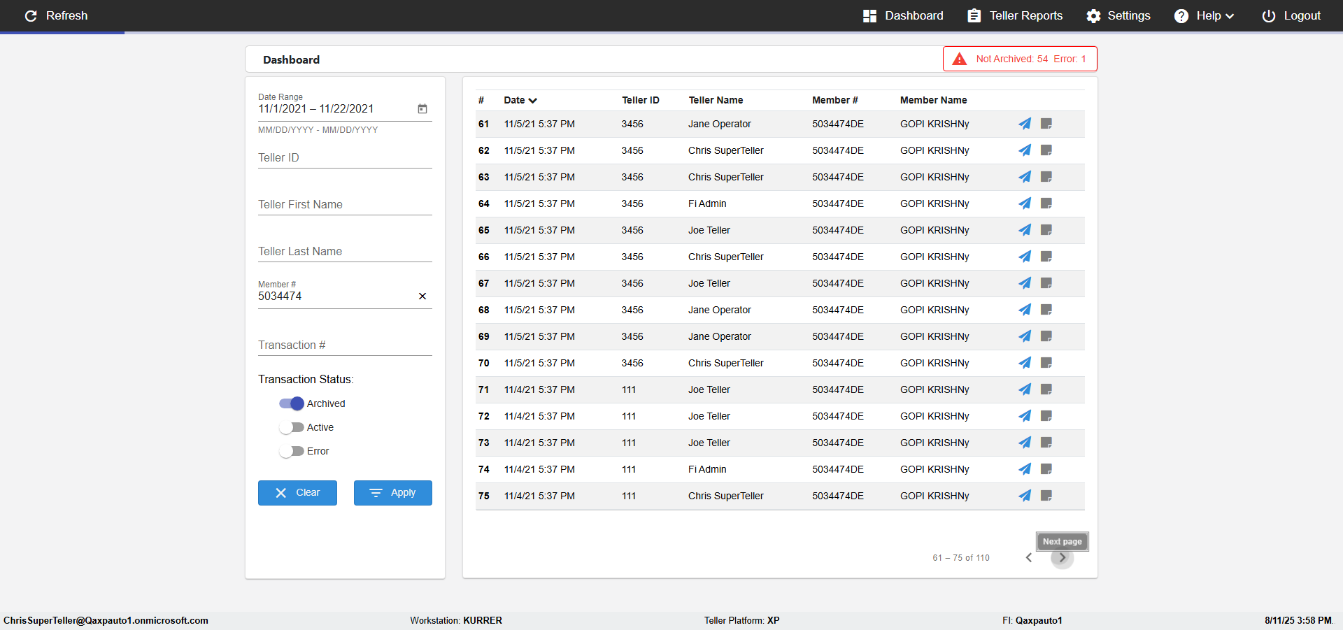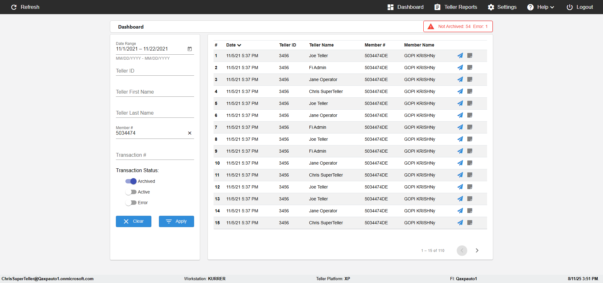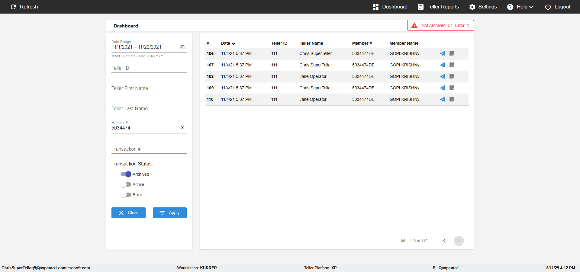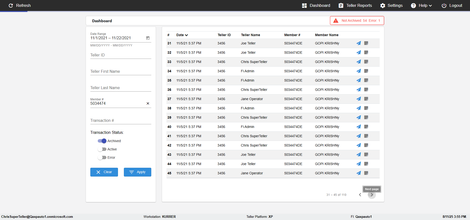 | {Description=verify UI Elemnts In DashBoard with Member, Email=, Teller LastName=, print signatur=, errorint=, TestID=verifyFiltersInDashBoard, Color Transactions=no, Member=5034474, UserPwd=iMM2022!, Transtatus=Archived-True;Active-False;Error-false, Receipt=, Report=, Teller=, Teller FirstName=, errorMessage=, Suppress=, Date=11/01/2021 - 11/22/2021, print Disburstments=, Print signature line=, Type=, Transaction=, Header=, Username=ChrisSuperTeller@Qaxpauto1.onmicrosoft.com, SMS=, Sign=, Scan=} |