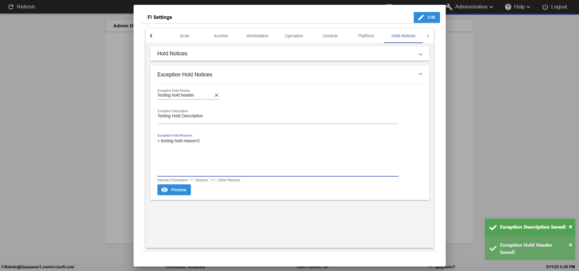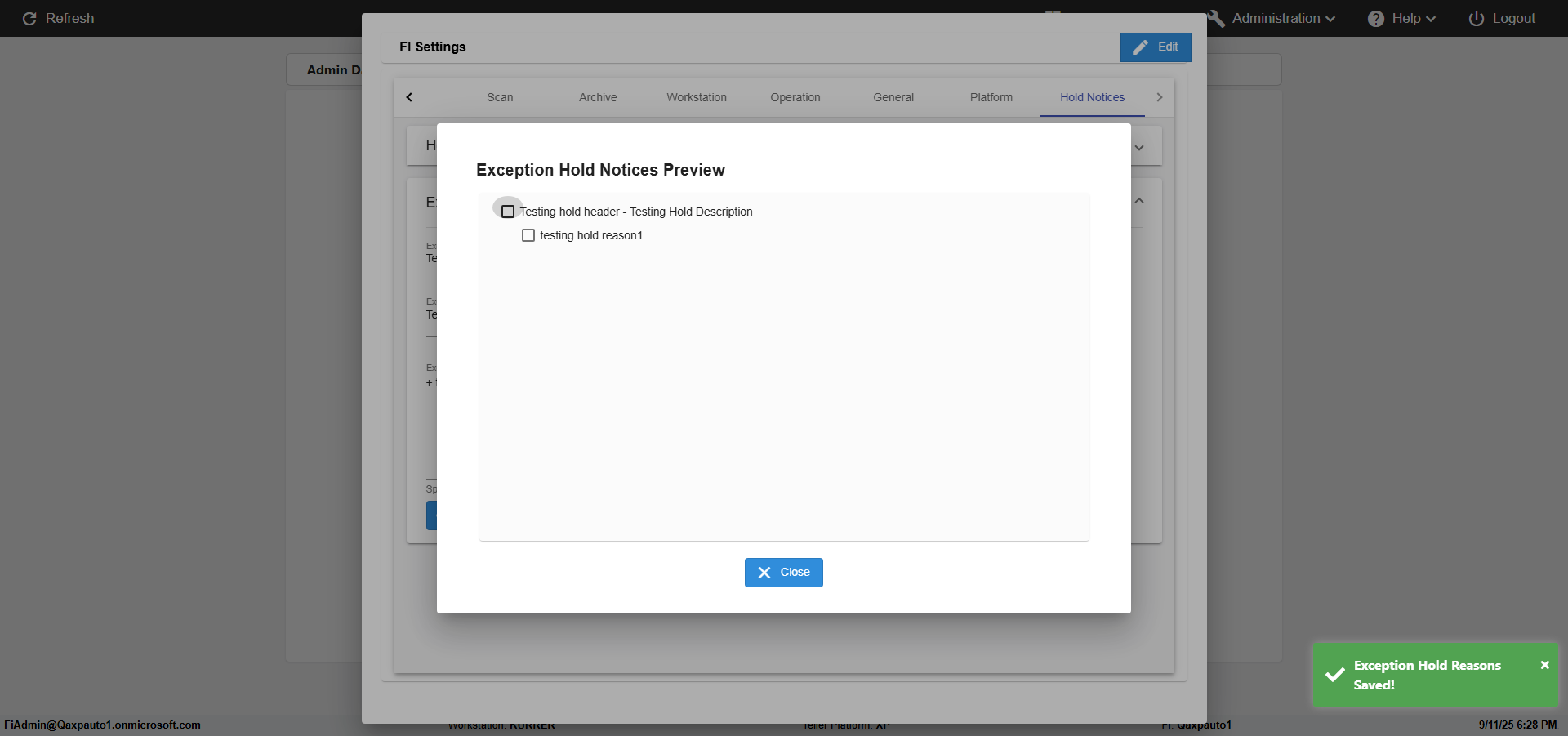 | {FromBranch=, Archived Transactions=, Description=verify hold notice Settings In Admin, Archive=, Operation=, print signatur=, Name=, Clear=, TestID=verifyFIHoldNoticeSettingsInAdmin, Phone=, MultipleWorkstation=, WorkstationName=, ToBranch=, WorkstationDeleteOption=, Subscription Names=, BranchName=, retention=, FilePath=, Agent=, UserPwd=iMM2022!, BranchDeleteOption=, Transtatus=Archived-false;Active-true;Error-false, Receipt=, Report=, Index_Field_Name=, Agents=, IPFilter=, Text=, Hold Notice=Hold Header-Testing hold header; Hold Description-Testing Hold Description; Hold Reasons-+ testing hold reason1, Suppress=, SchedualType=, Date=, Platfrom=Enable Hold Notice-true;, GroupId=, print Disburstments=, Role=, Brand=, SMTP=, Print signature line=, TimeZone=, Imaging System=, Header=, MultipleBranches=, Username=fiAdmin@Qaxpauto1.onmicrosoft.com, MappedOption=, Sign=, Scan=, PortNumber=} |