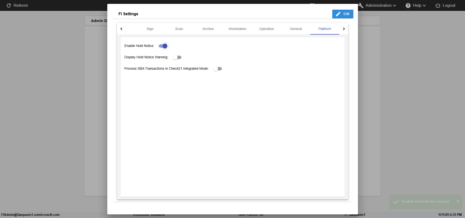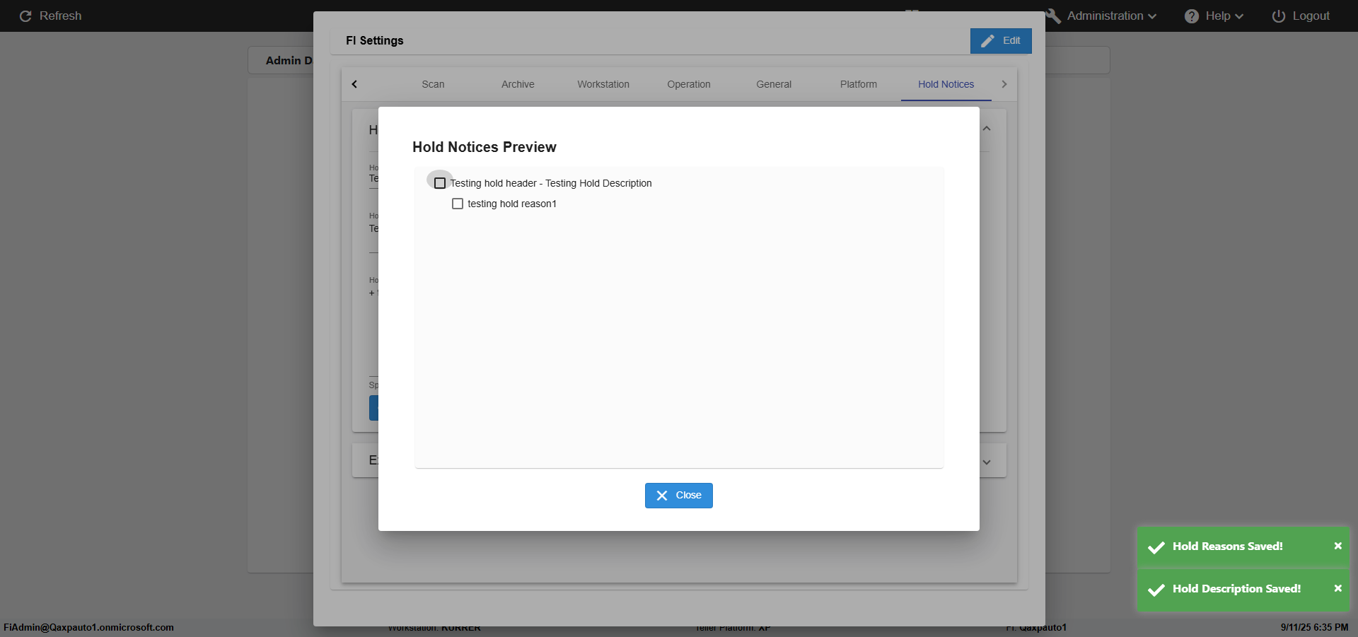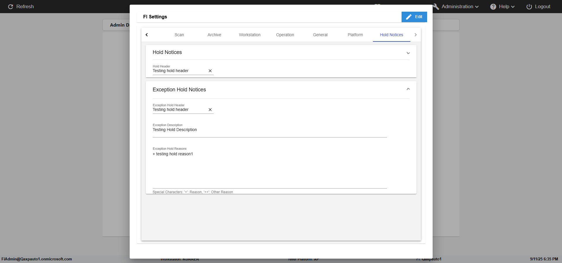 | {FromBranch=, Archived Transactions=, Description=verify hold notice Settings In Admin, Archive=, Operation=, print signatur=, Name=, Clear=, TestID=verifyFIHoldNoticeSettingsInAdmin, Phone=, MultipleWorkstation=, WorkstationName=, ToBranch=, WorkstationDeleteOption=, Subscription Names=, BranchName=, retention=, FilePath=, Agent=, UserPwd=iMM2022!, BranchDeleteOption=, Transtatus=Archived-false;Active-true;Error-false, Receipt=, Report=, Index_Field_Name=, Agents=, IPFilter=, Text=, Hold Notice=Hold Header-Testing hold header; Hold Description-Testing Hold Description; Hold Reasons-+ testing hold reason1, Suppress=, SchedualType=, Date=, Platfrom=Enable Hold Notice-true;, GroupId=, print Disburstments=, Role=, Brand=, SMTP=, Print signature line=, TimeZone=, Imaging System=, Header=, MultipleBranches=, Username=fiAdmin@Qaxpauto1.onmicrosoft.com, MappedOption=, Sign=, Scan=, PortNumber=} |