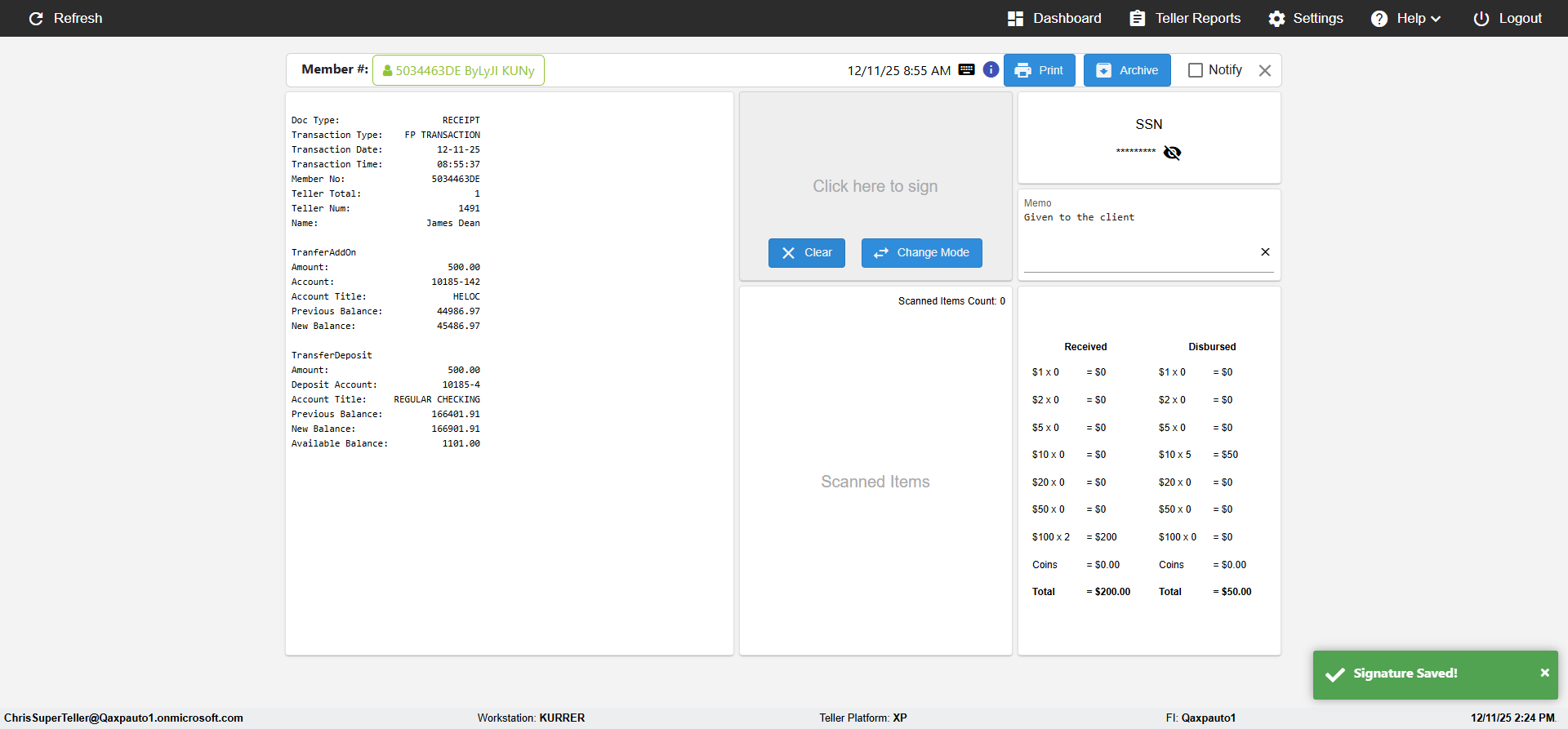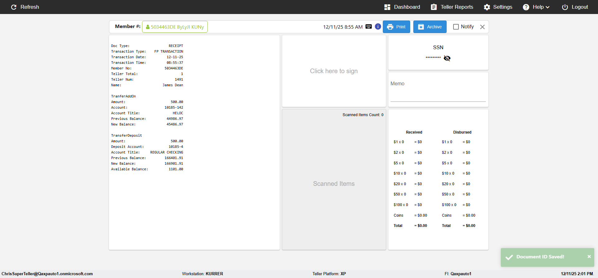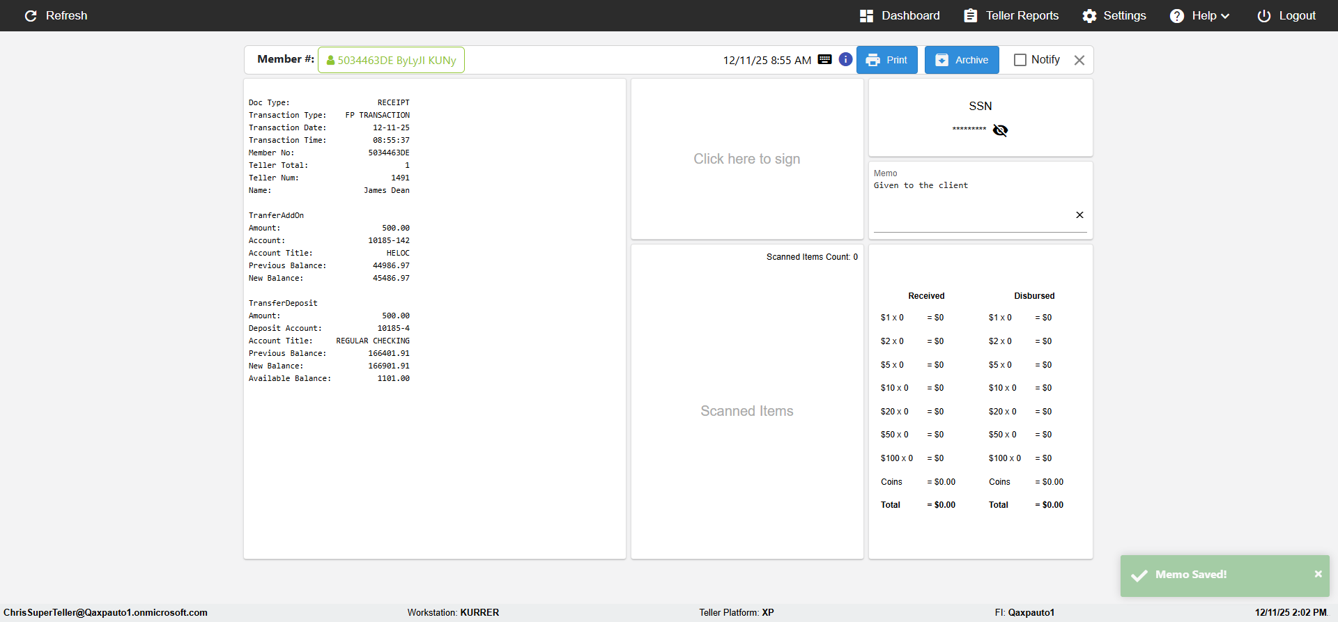 (verify MemberID And Archive Information for Normal teller In Receipt Page)